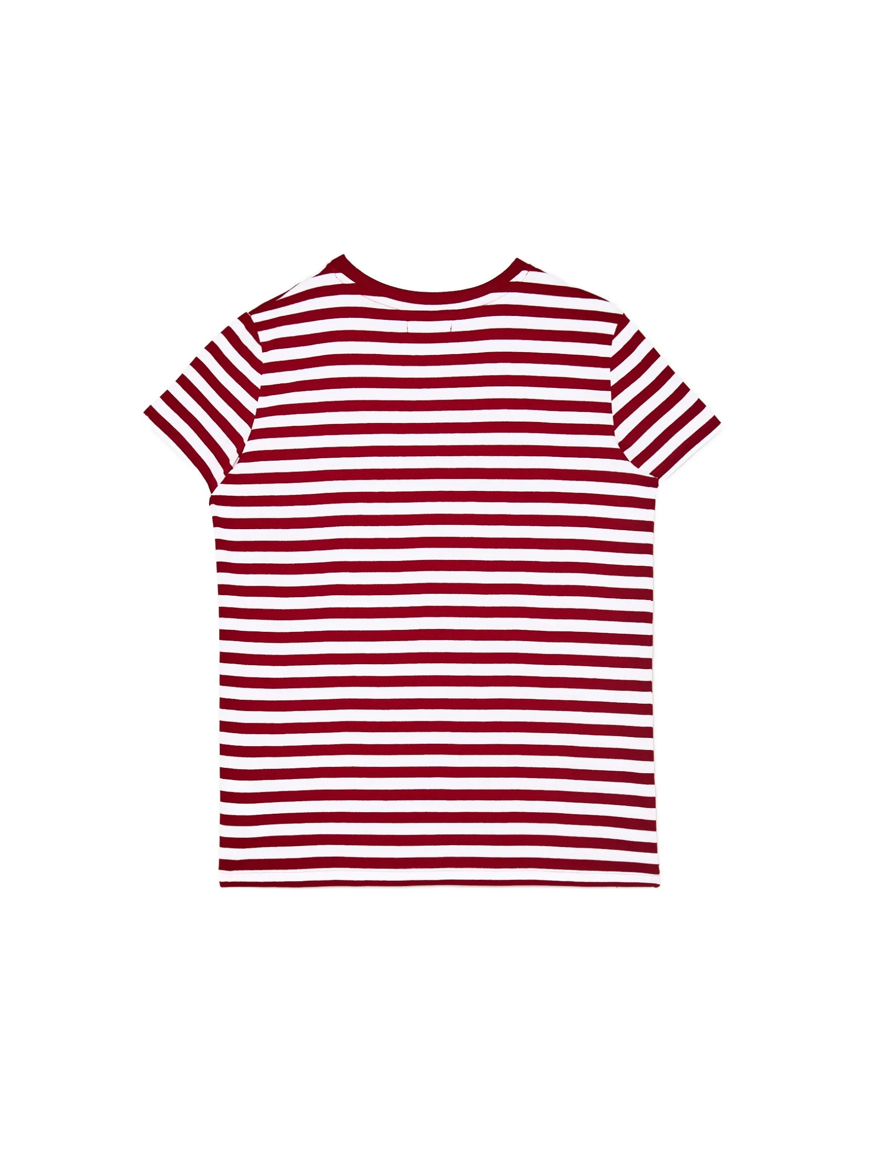 Damska koszulka o regularnym kroju, uszyta w 100% z bawełny. Na całości wzór w czerwono-białe poziome paski. Wzrost modelki: 172 cm