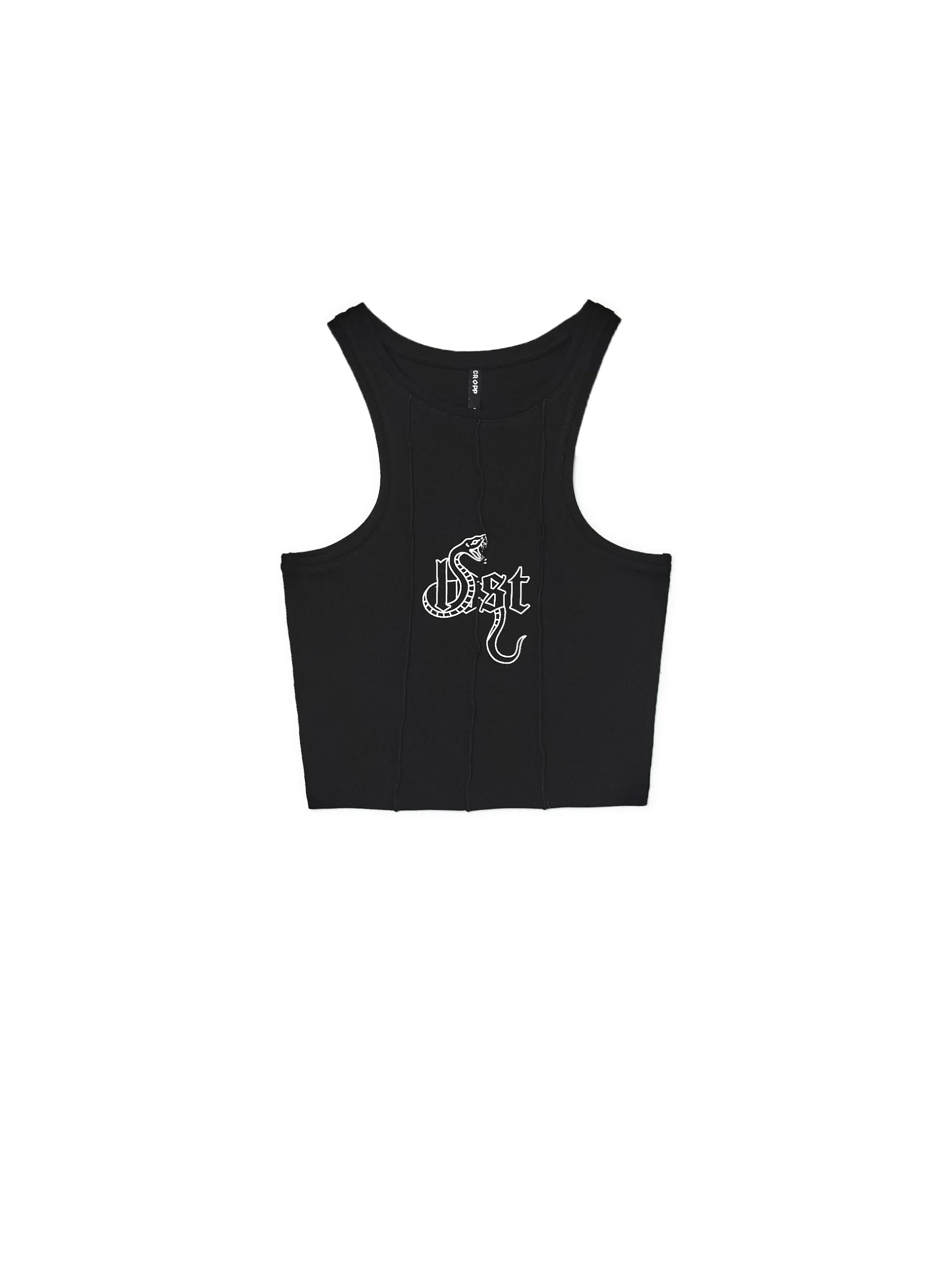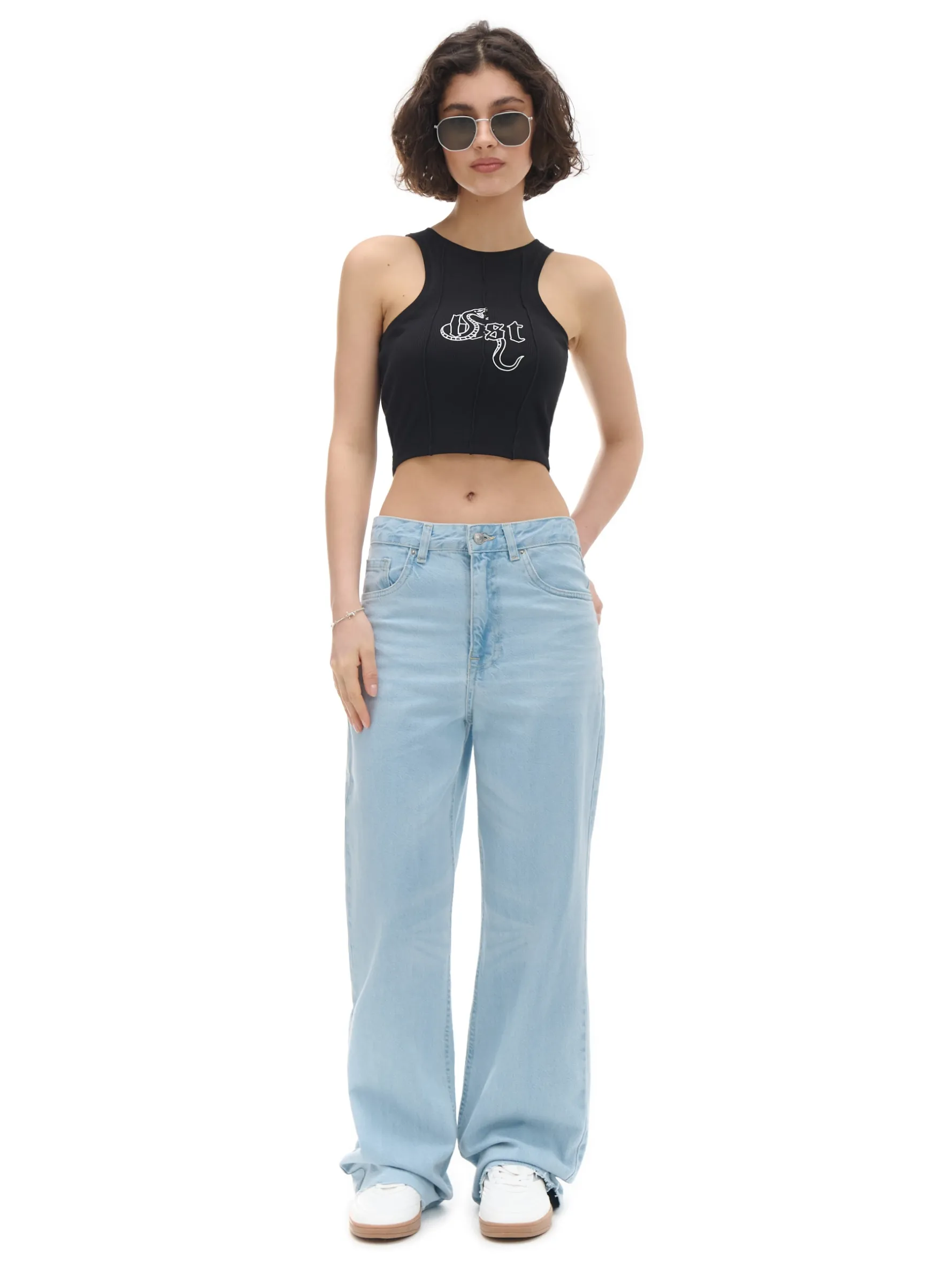 Czarny damski top, uszyty z dzianiny o bardzo wysokiej zawartości bawełny. Domieszka elastanu zapewnia idealne dopasowanie do sylwetki. dzianina z domieszką elastycznych włókien krótki, dopasowany krój szersze ramiączka dekolt typu halter ozdobne przeszycia tekstowy nadruk z przodu Wzrost modelki: 172 cm