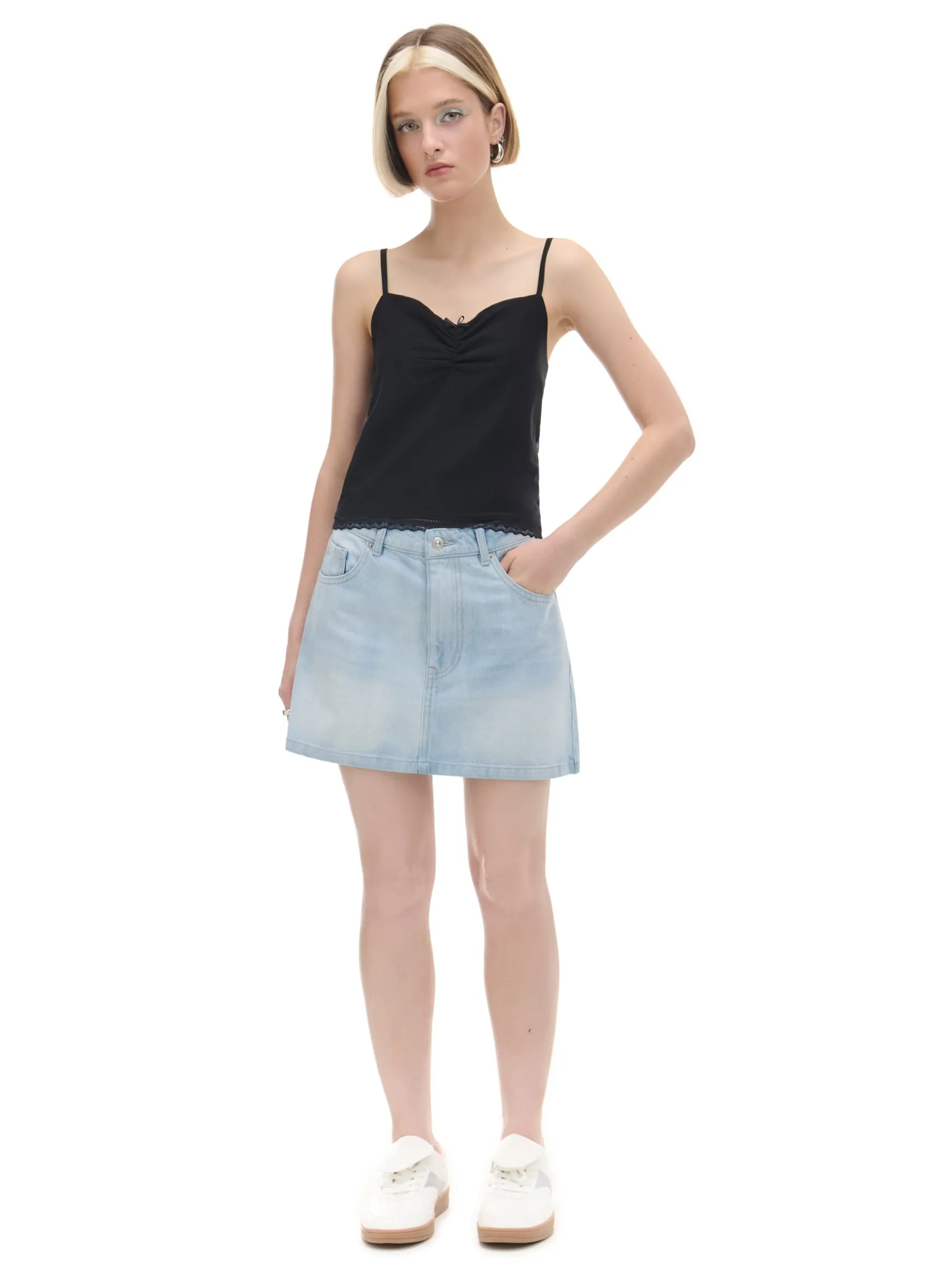 Damski top uszyty z dzianiny w kolorze czarnym. Cienkie ramiączka, ozdobne marszczenia przy dekolcie i dekoracyjna koronka – must have letnich stylizacji! koszulka typu crop o dopasowanym kroju cienkie ramiączka dekolt z dekoracyjnym marszczeniem i wycięciem w szpic dół wykończony koronką