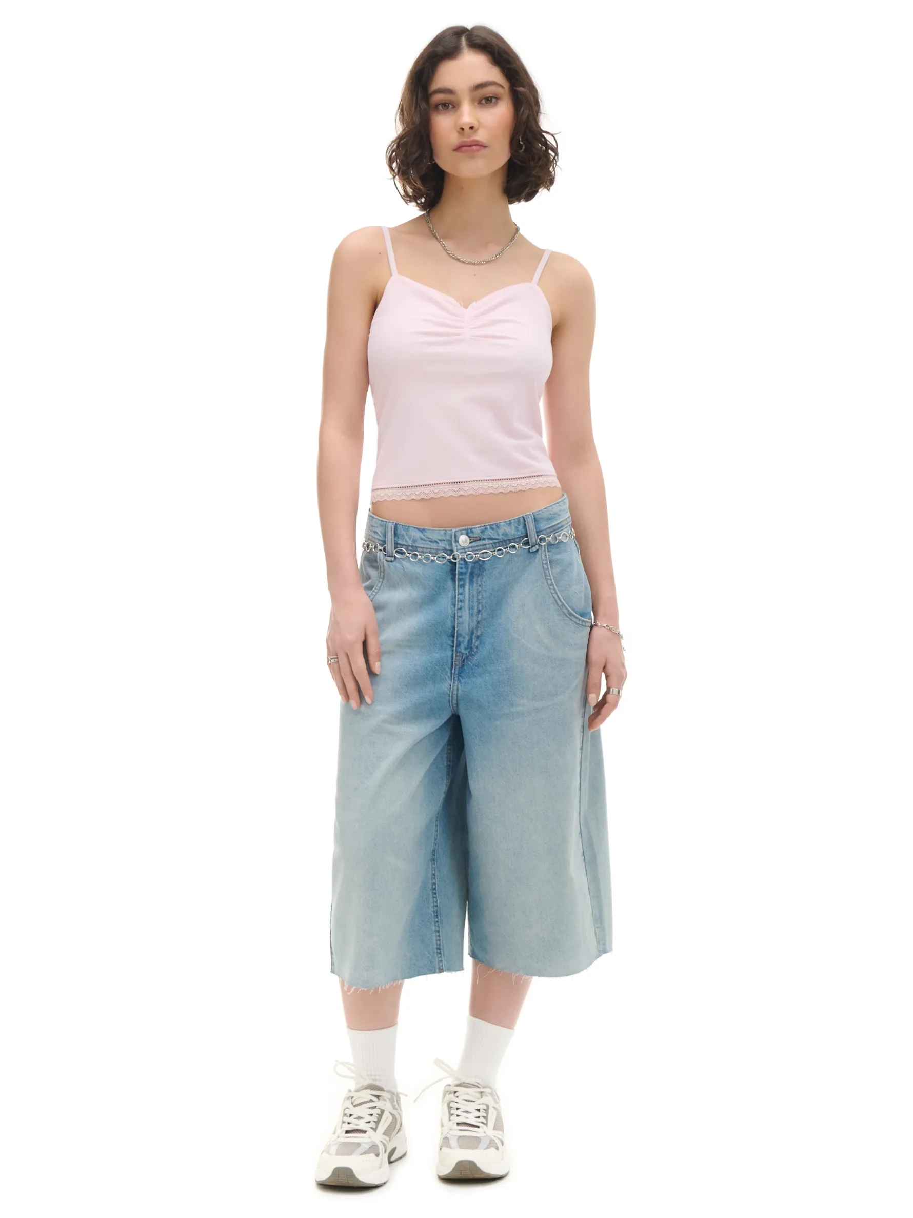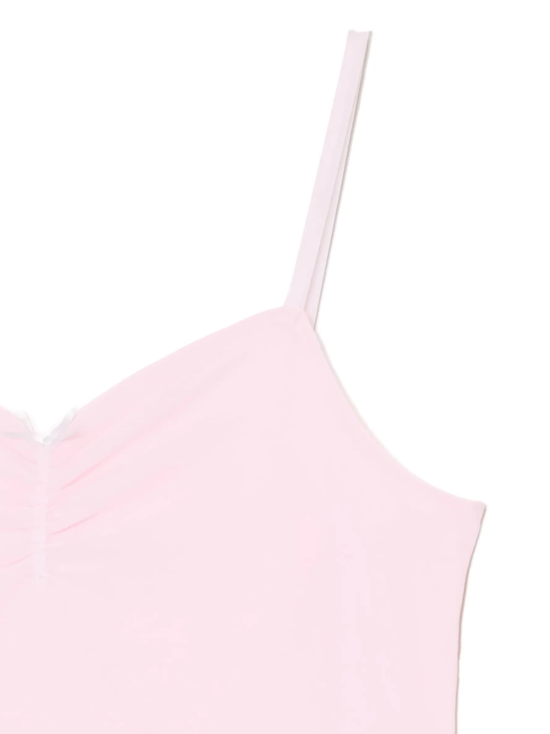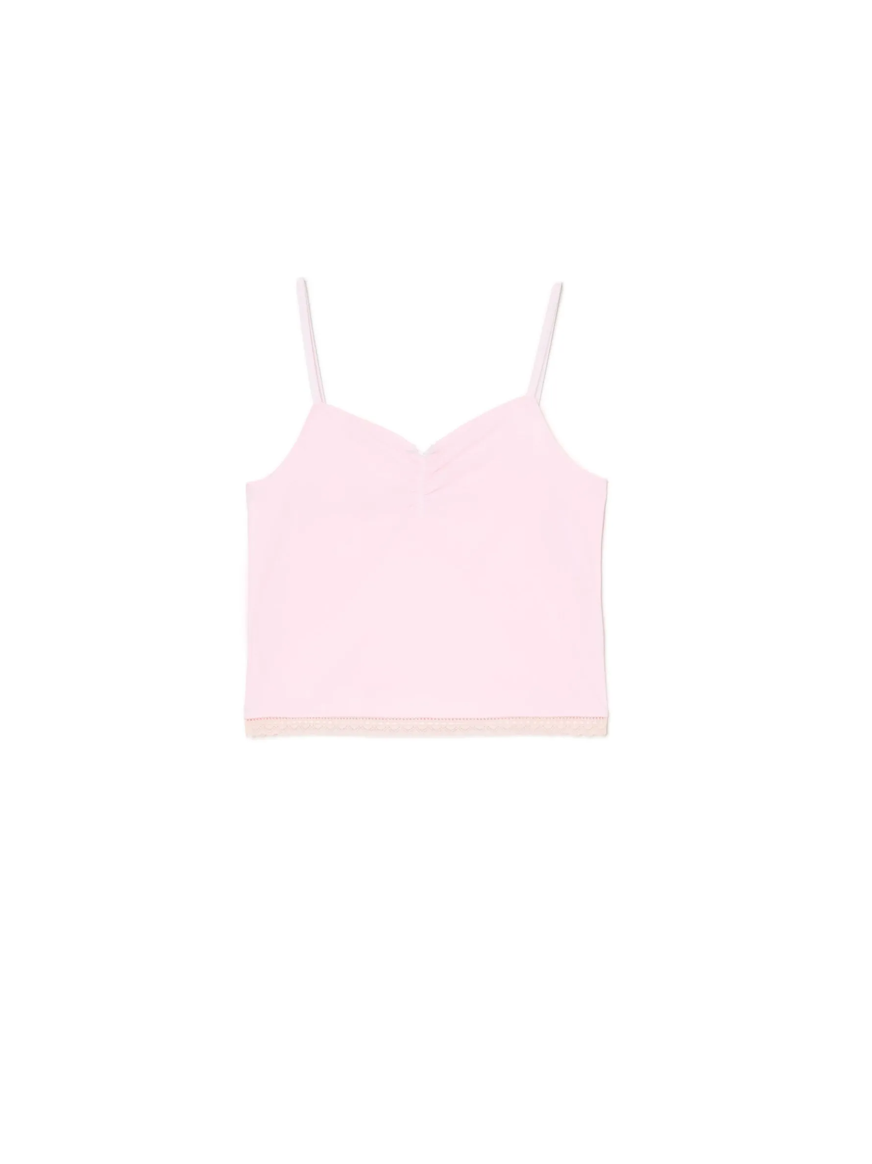 Damski top uszyty z dzianiny w kolorze różowym. Cienkie ramiączka, ozdobne marszczenia przy dekolcie i dekoracyjna koronka – must have letnich stylizacji! koszulka typu crop o dopasowanym kroju cienkie ramiączka dekolt z dekoracyjnym marszczeniem i wycięciem w szpic dół wykończony koronką Wzrost modelki: 172 cm