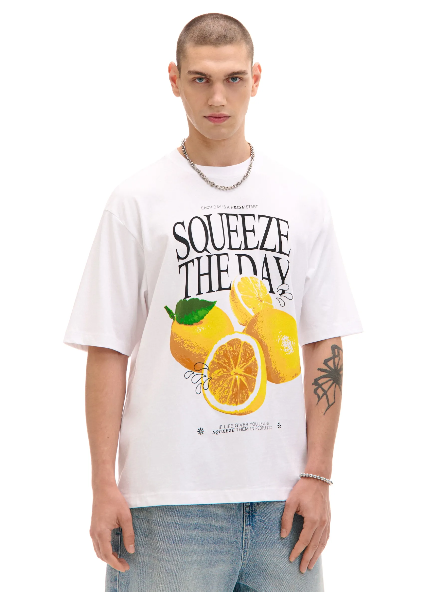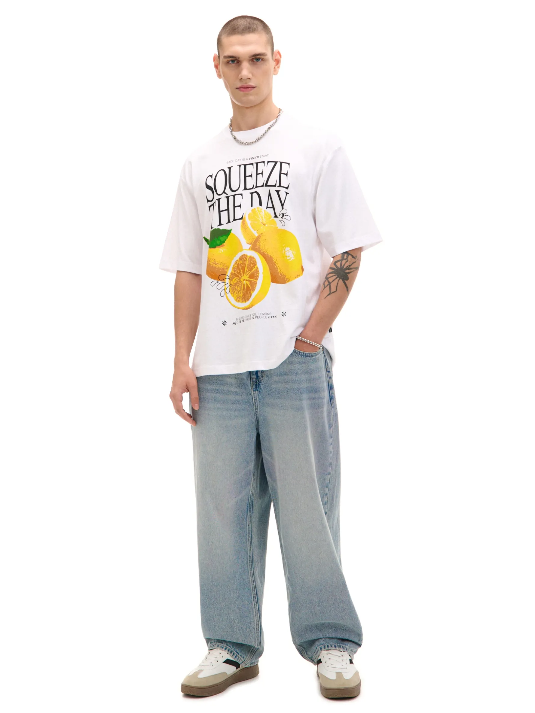 Bawełniany męski T-shirt z krótkim rękawem z nadrukiem cytryn na przodzie i motywacyjnym sloganem. 100% bawełny wygodny krój comfort okrągły dekolt z lamówką krótkie rękawy pastelowy nadruk ze sloganem