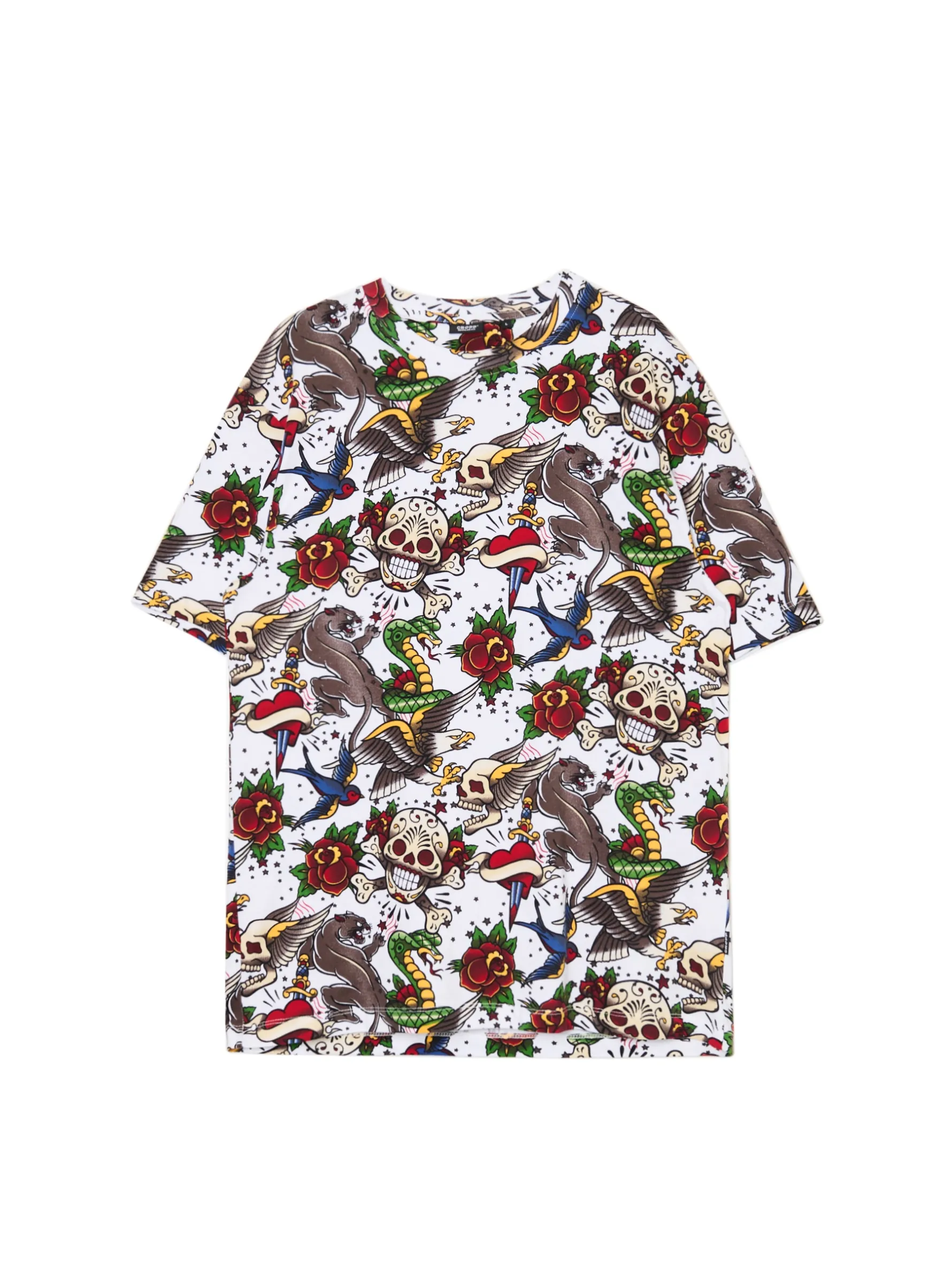 Męski T-shirt, uszyty z lekkiej bawełnianej dzianiny. Zakochasz się w tym oryginalnym nadrukiem w punkowym stylu! 100% bawełny regularny krój półokrągły dekolt krótkie, swobodne rękawy oryginalny print all over