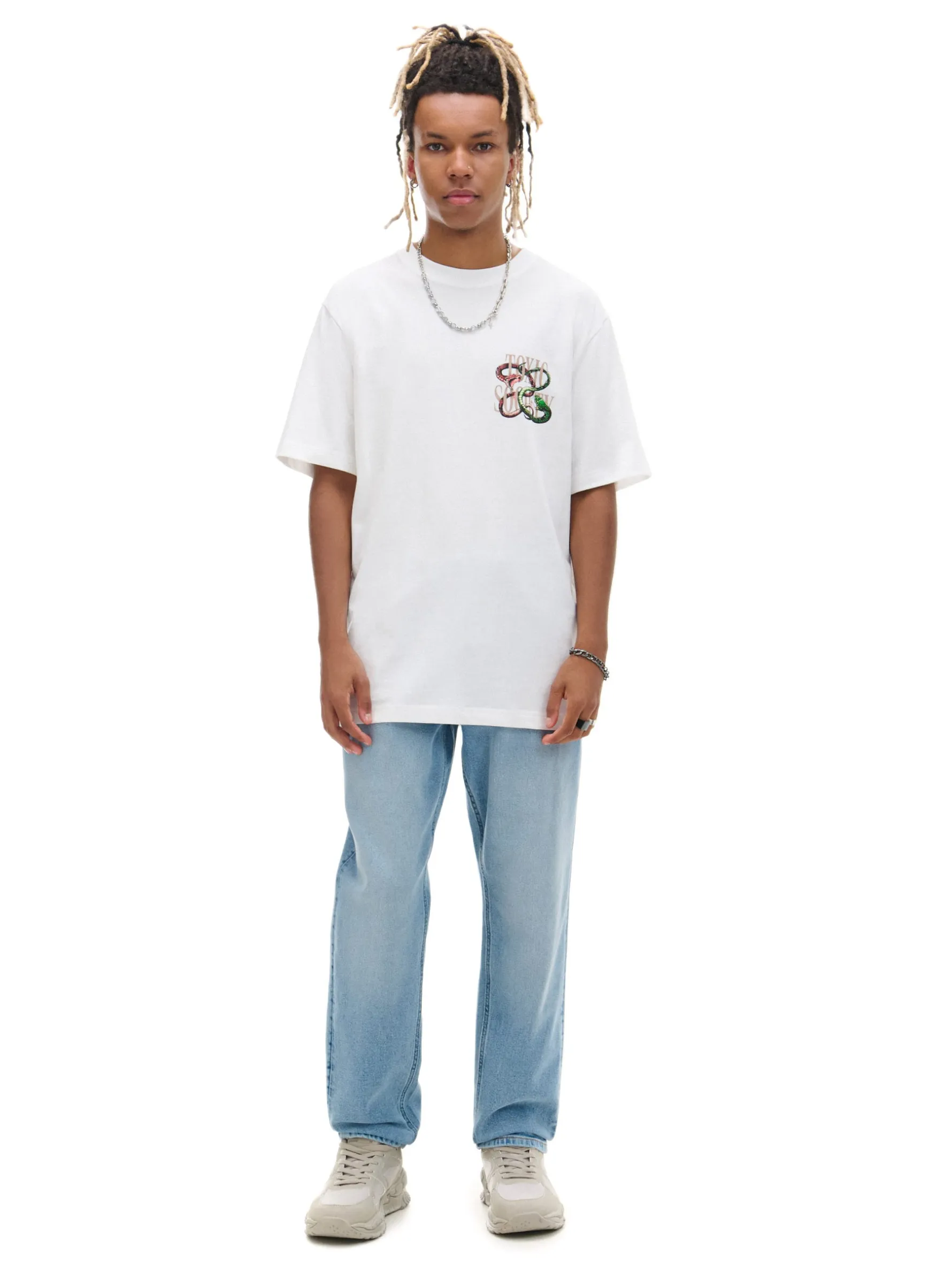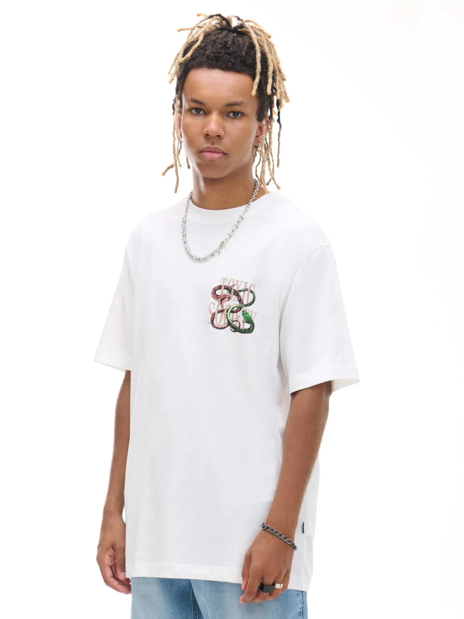 Biała męska koszulka z krótkim rękawem, uszyta z bawełnianej dzianiny. Wyróżnia ja mały nadruk na piersi i duży na plecach z motywem węży. 100% bawełny regularny krój krótkie, swobodne rękawy mały nadruk na piersi, duży nadruk na plecach