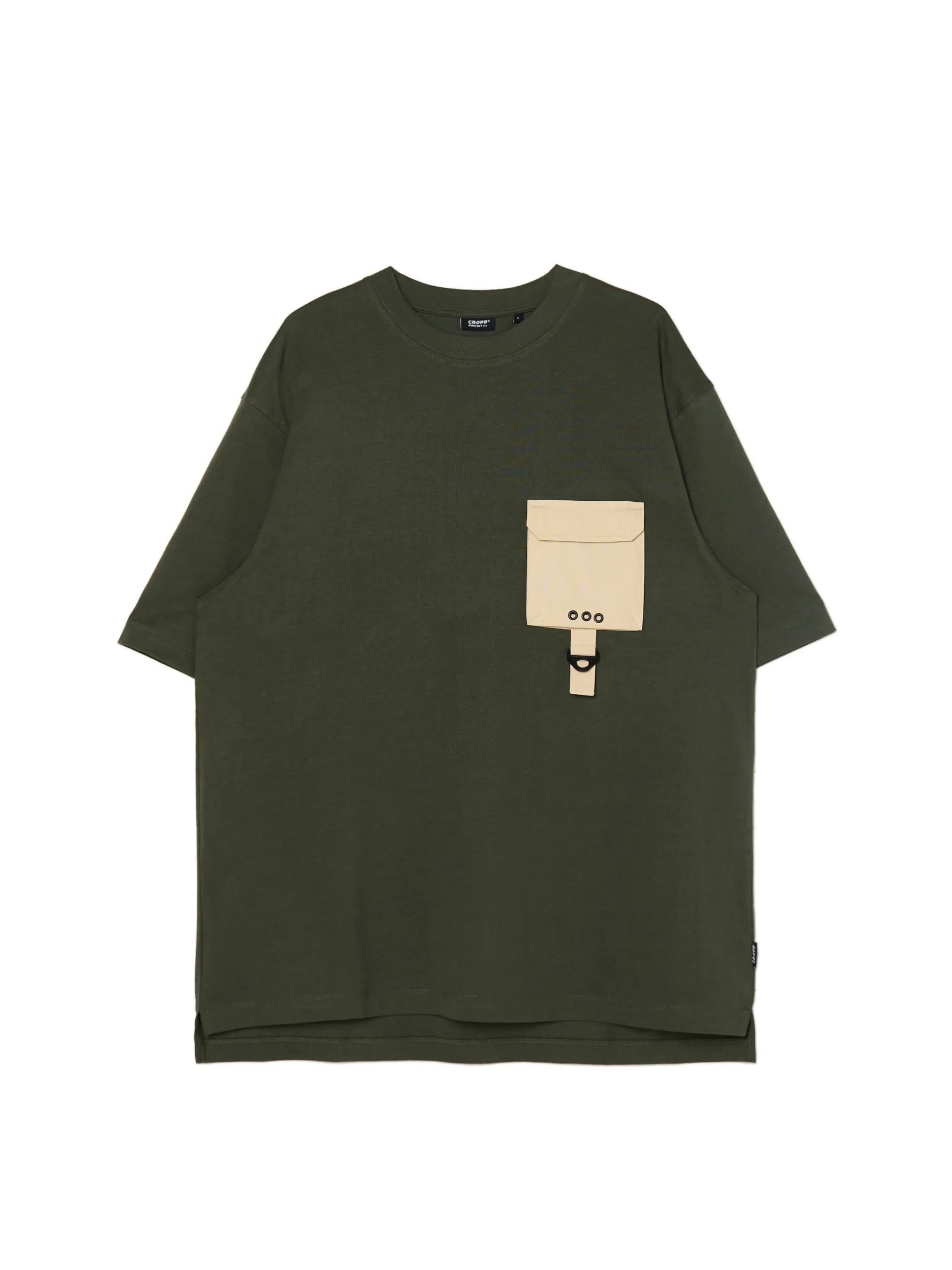 T-shirt męski w kolorze zielonym, uszyty z bawełnianego materiału. Wyróżnikiem tego modelu jest kieszonka typu cargo na przodzie w jaśniejszym odcieniu. 100% bawełny wygodny krój comfort krótkie, swobodne rękawy lekko obniżona linia ramion naszywana kieszeń na piersi dekoracyjne rozcięcia po bokach