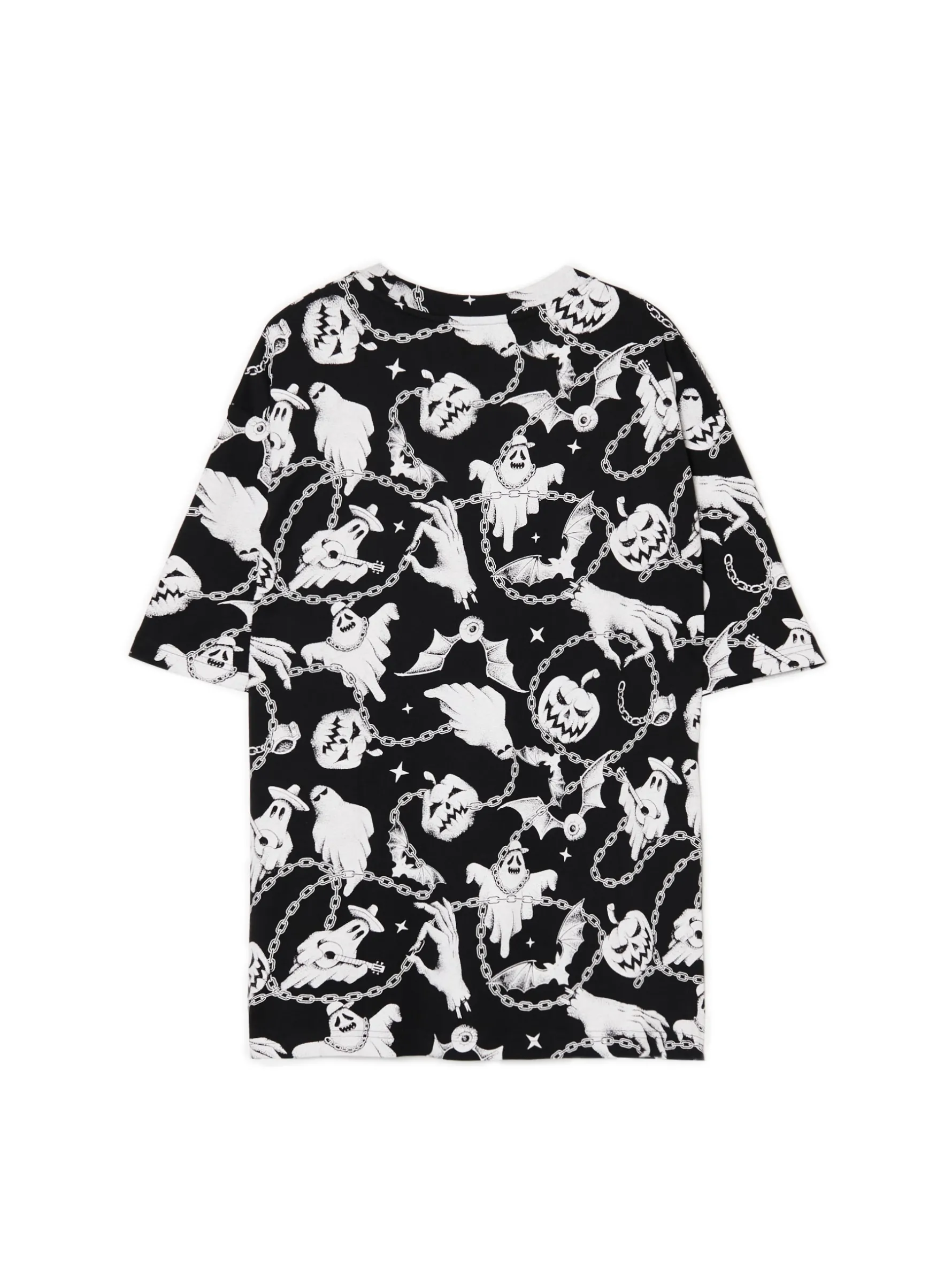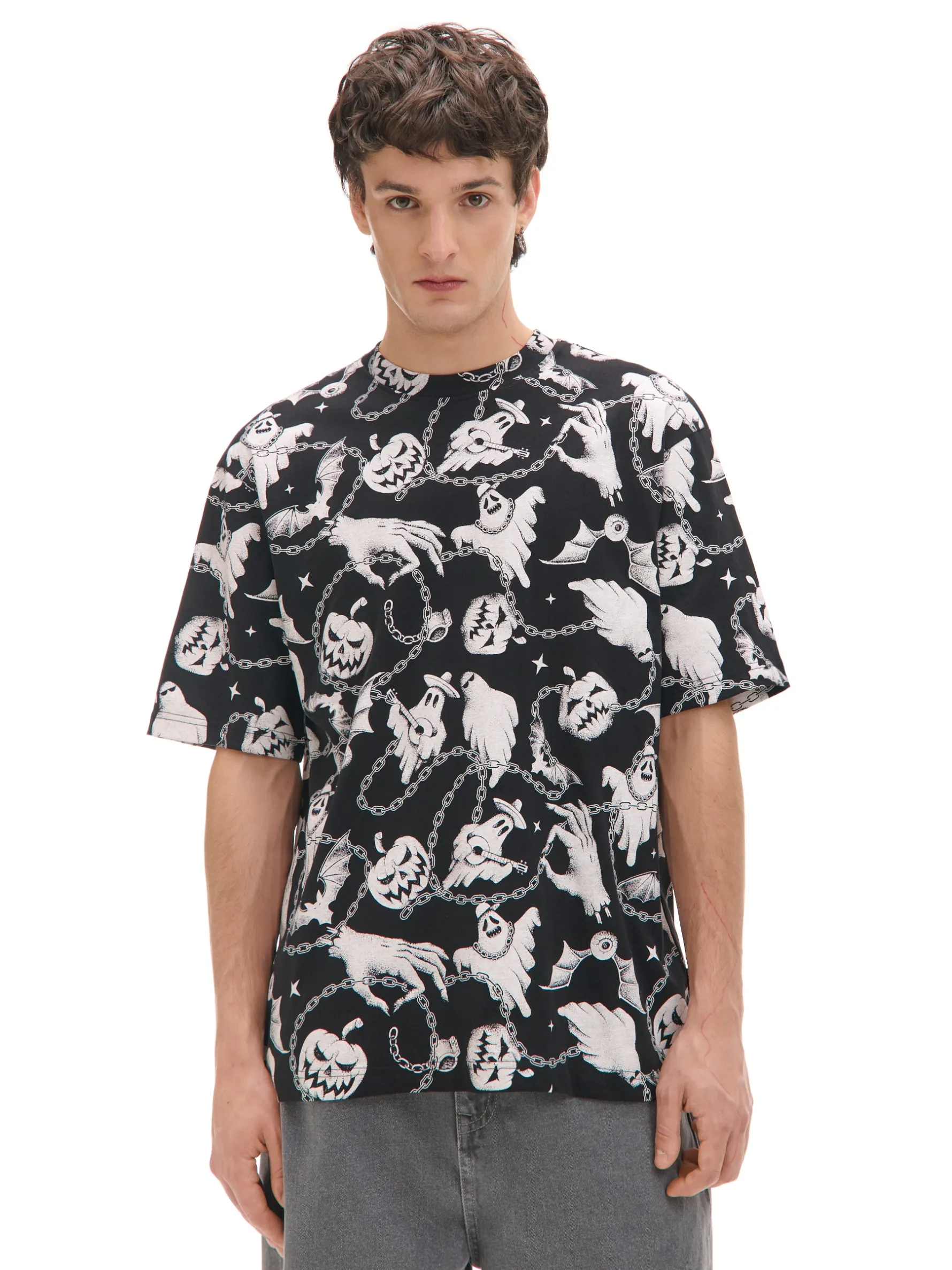 Męski bawełniany T-shirt ze strrrrrasznymi motywami: duchami, nietoperzami, łańcuchami i dyniami – idealnymi na Halloween! wygodny krój comfort krótkie rękawy nadruk z motywem Halloween