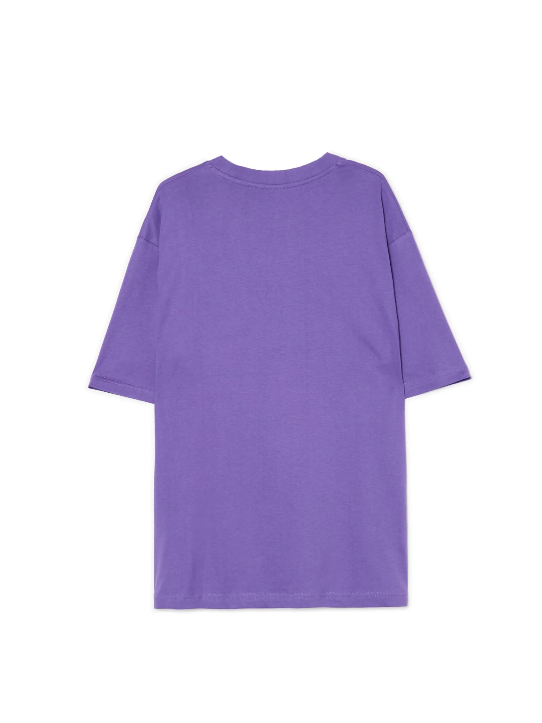 Męski T-shirt z krótkim rękawem uszyty z bawełnianej dzianiny w fioletowym kolorze. Na piersi niewielki nadruk uroczego pączka i jego życiowego motta. 100% bawełny wygodny krój comfort okrągły dekolt krótkie rękawy lekko obniżona linia ramion niewielki nadruk z przodu