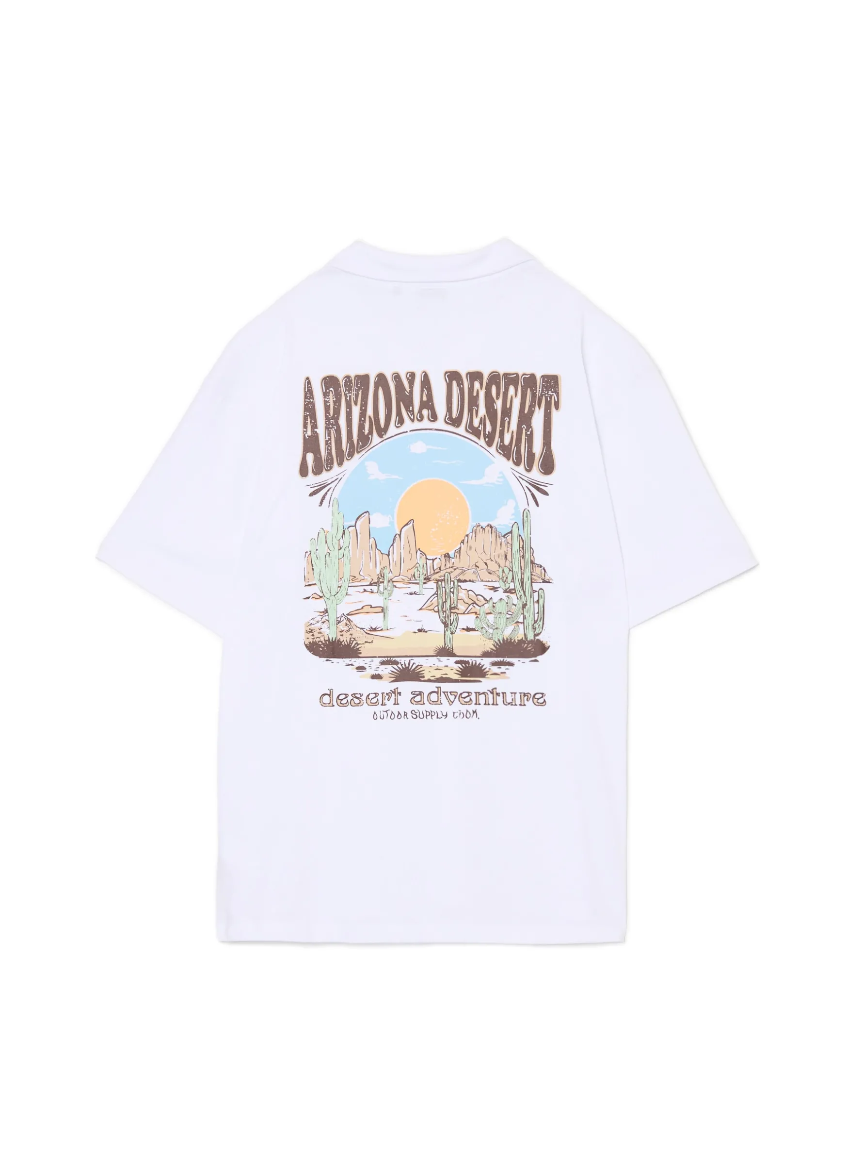 T-shirt męski typu polo uszyty z bawełnianej dzianiny w kolorze białym. Po obu stronach kolorowe nadruki nawiązujące do pustynnych obszarów Arizony. 100% bawełny wygodny krój comfort klasyczny kołnierzyk polo krótkie, ścięte rękawy delikatnie obniżona linia ramion mały nadruk na piersi, duży nadruk na plecach