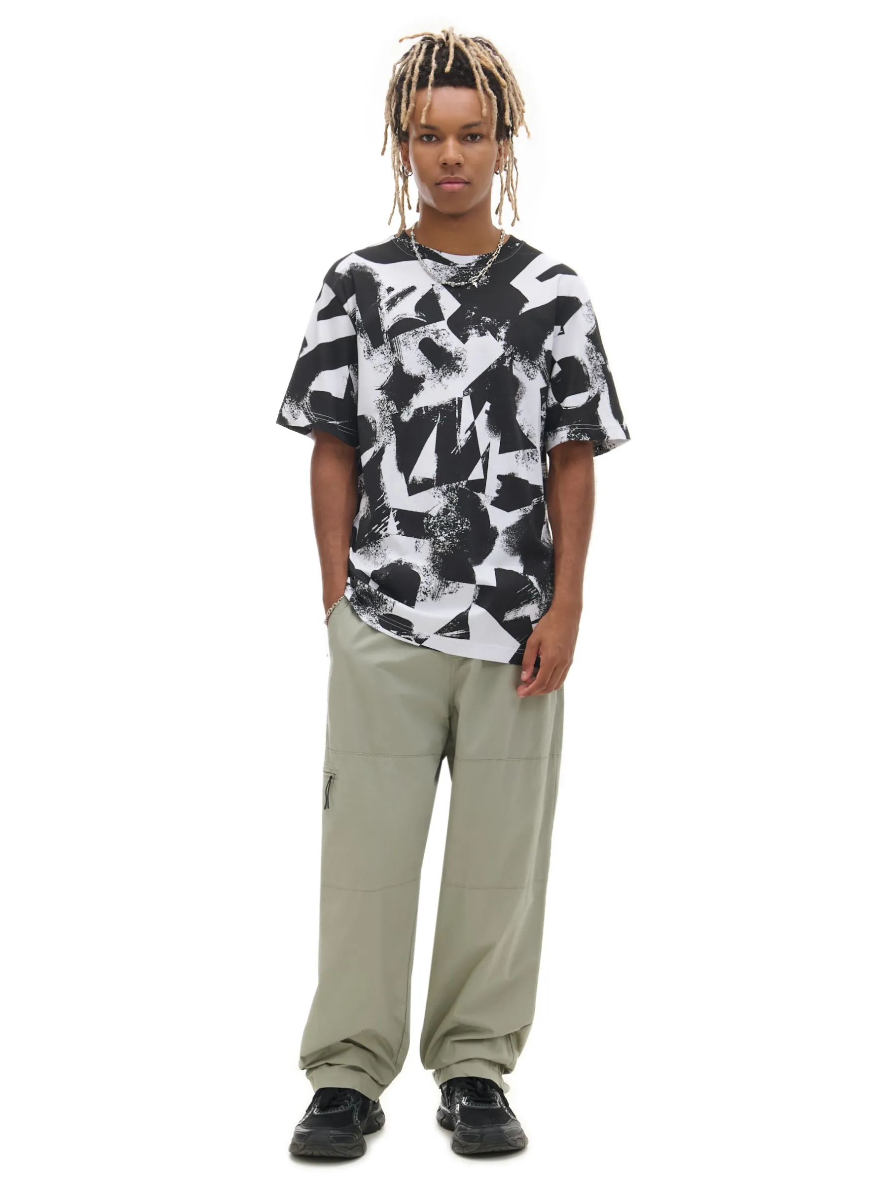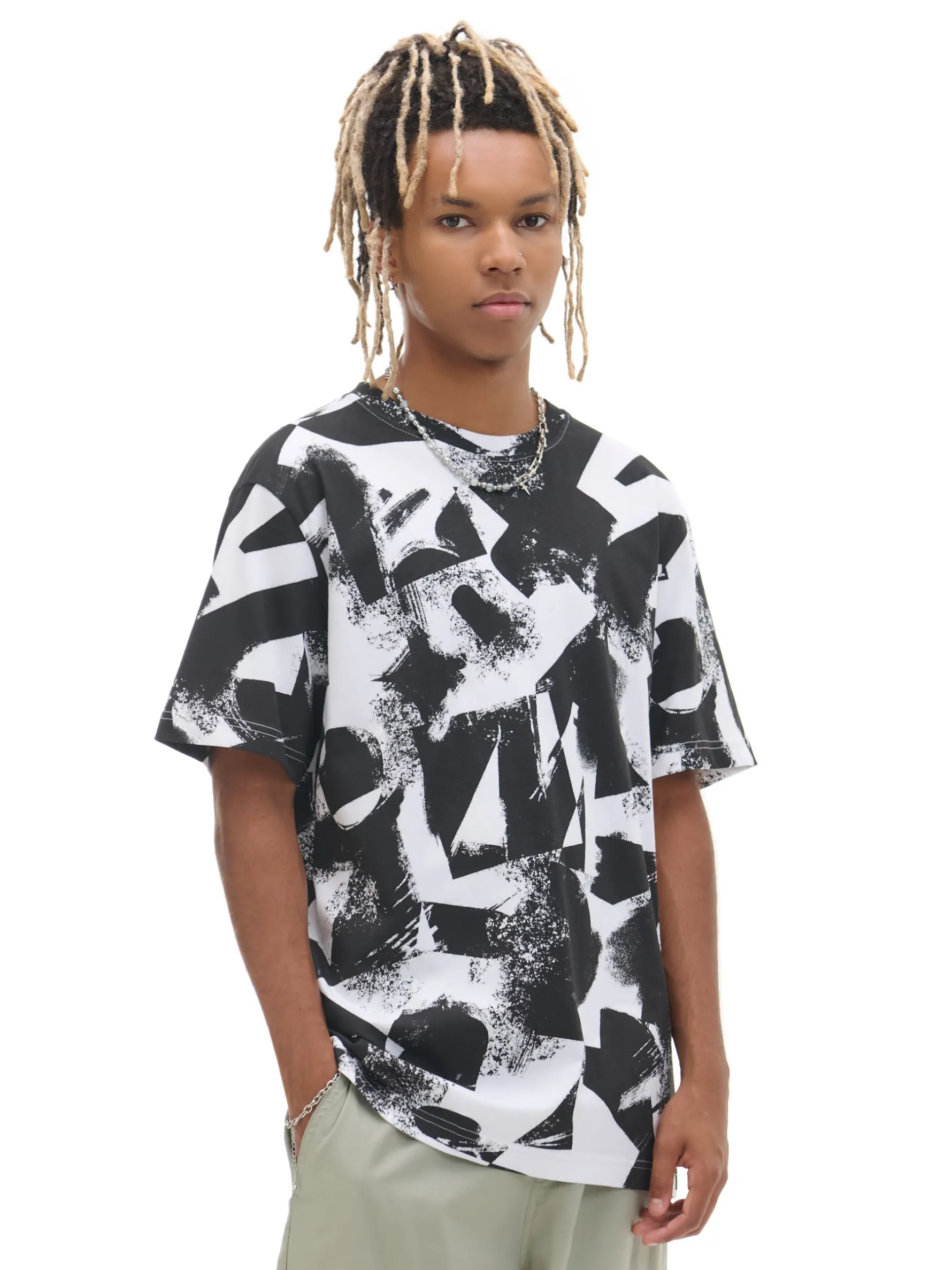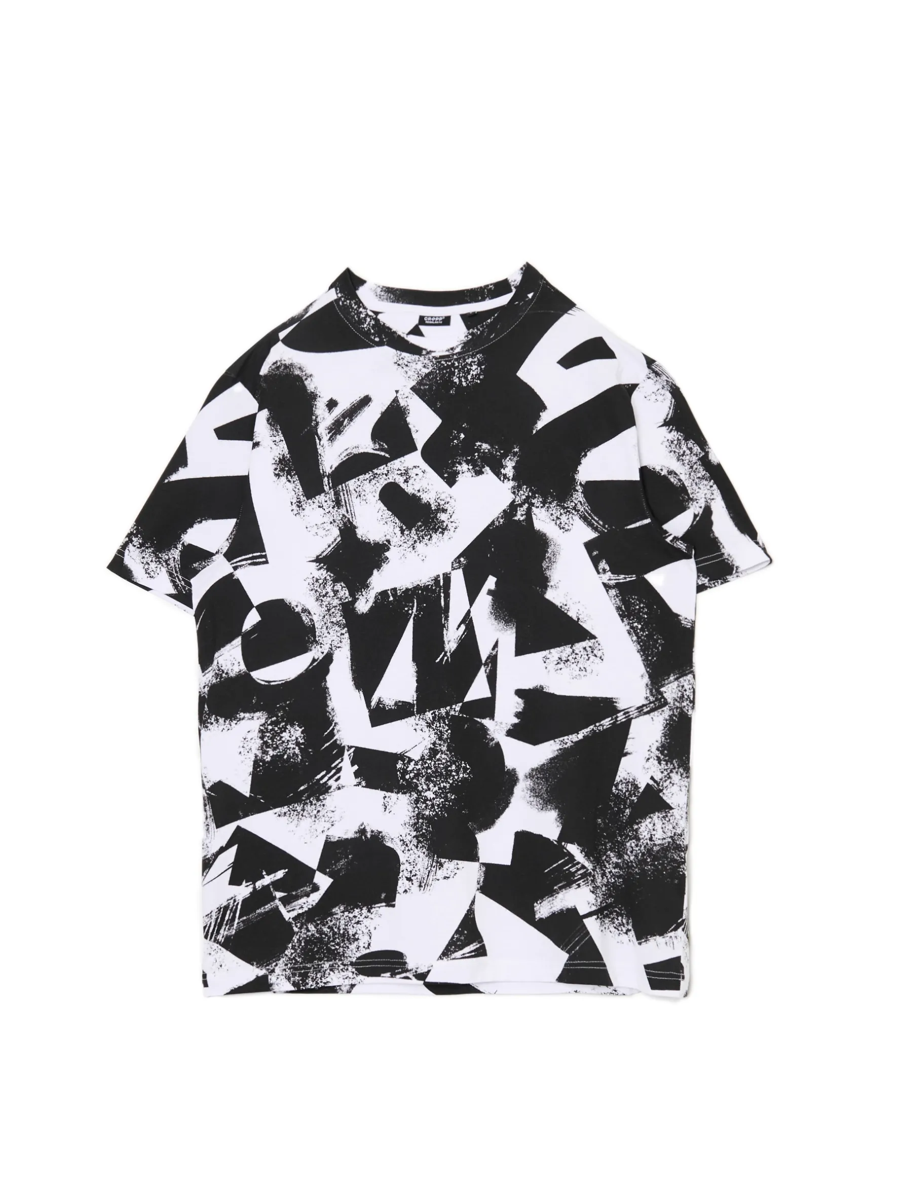 Biało-czarna męska koszula, uszyta w 100% z bawełny. krój regular krótkie rękawy na całości nadruk z abstrakcyjnym motywem