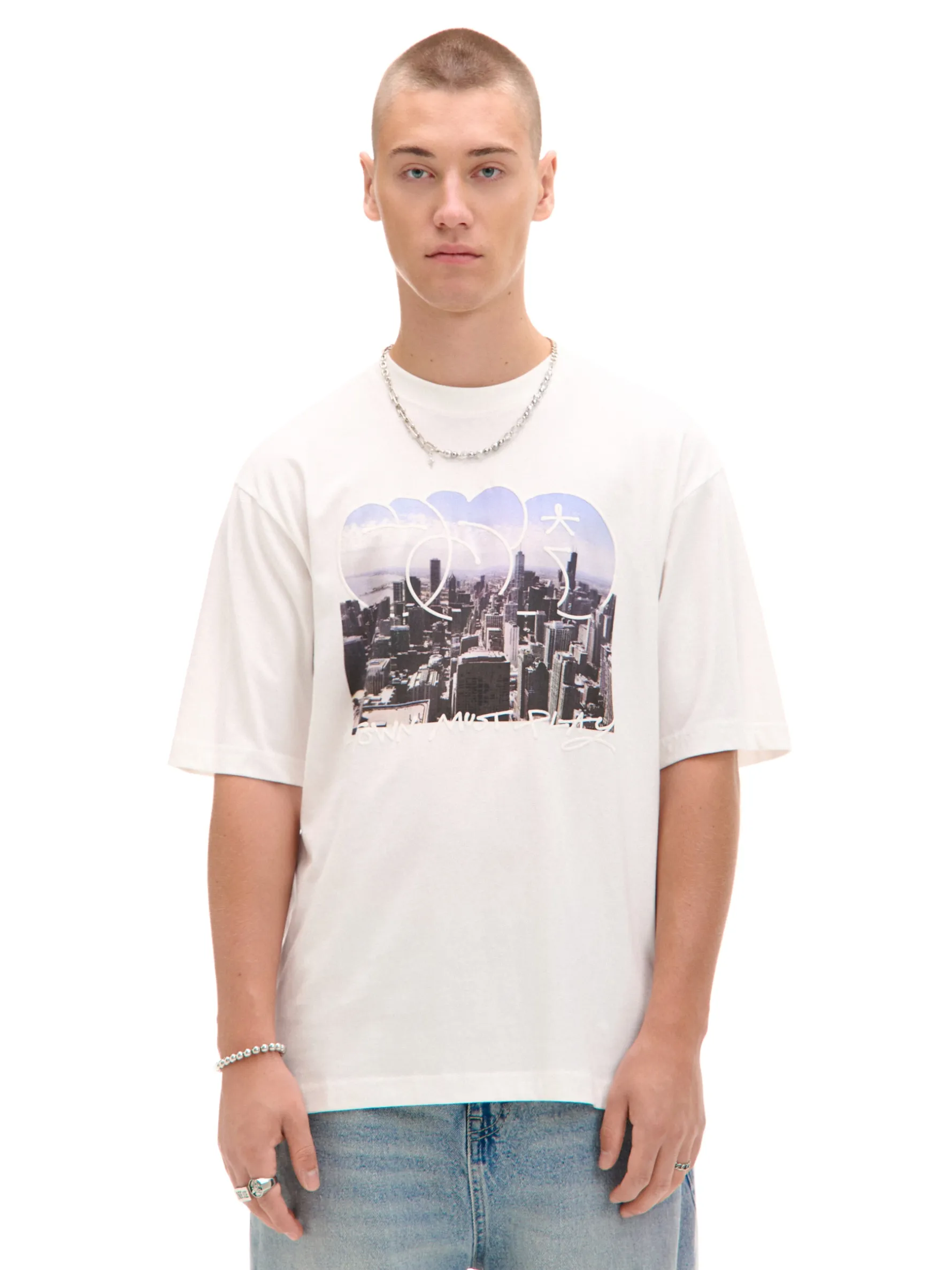 Bawełniany męski T-shirt z krótkim rękawem i fotoprintem amerykańskiego miasta Nowy Jork. 100% bawełny wygodny krój comfort okrągły dekolt z lamówką krótkie, swobodne rękawy kontrastowy fotoprint z przodu Wzrost modela: 185 cm