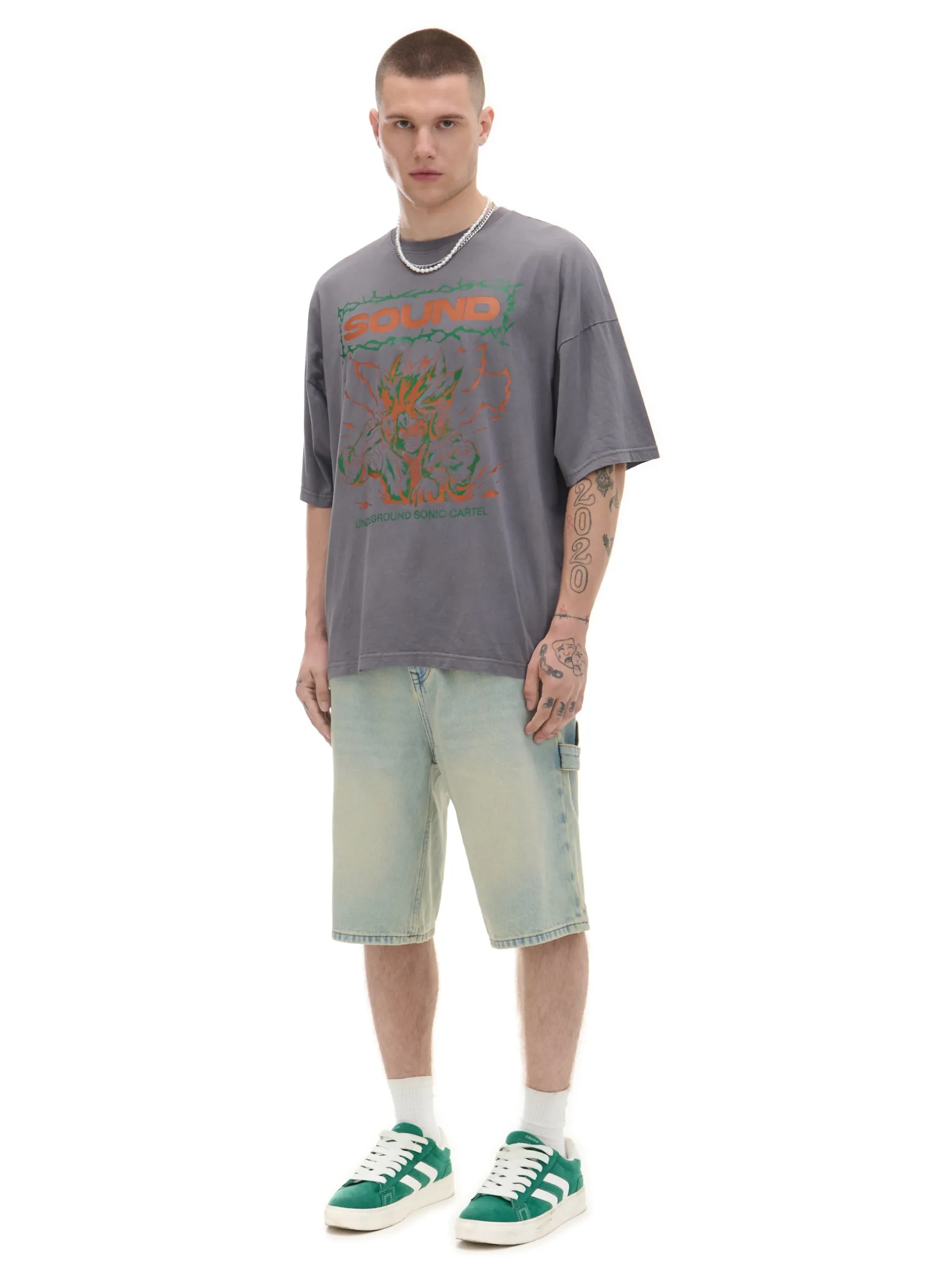 Męska bawełniana koszulka o kroju oversize z autorskim nadrukiem w muzycznym wydaniu. Miksuj dowolnie z ulubionymi szortami! 100% bawełny krój oversize krótkie rękawy oryginalny print Model prezentuje produkt w rozmiarze M/L. Wzrost modela: 185 cm