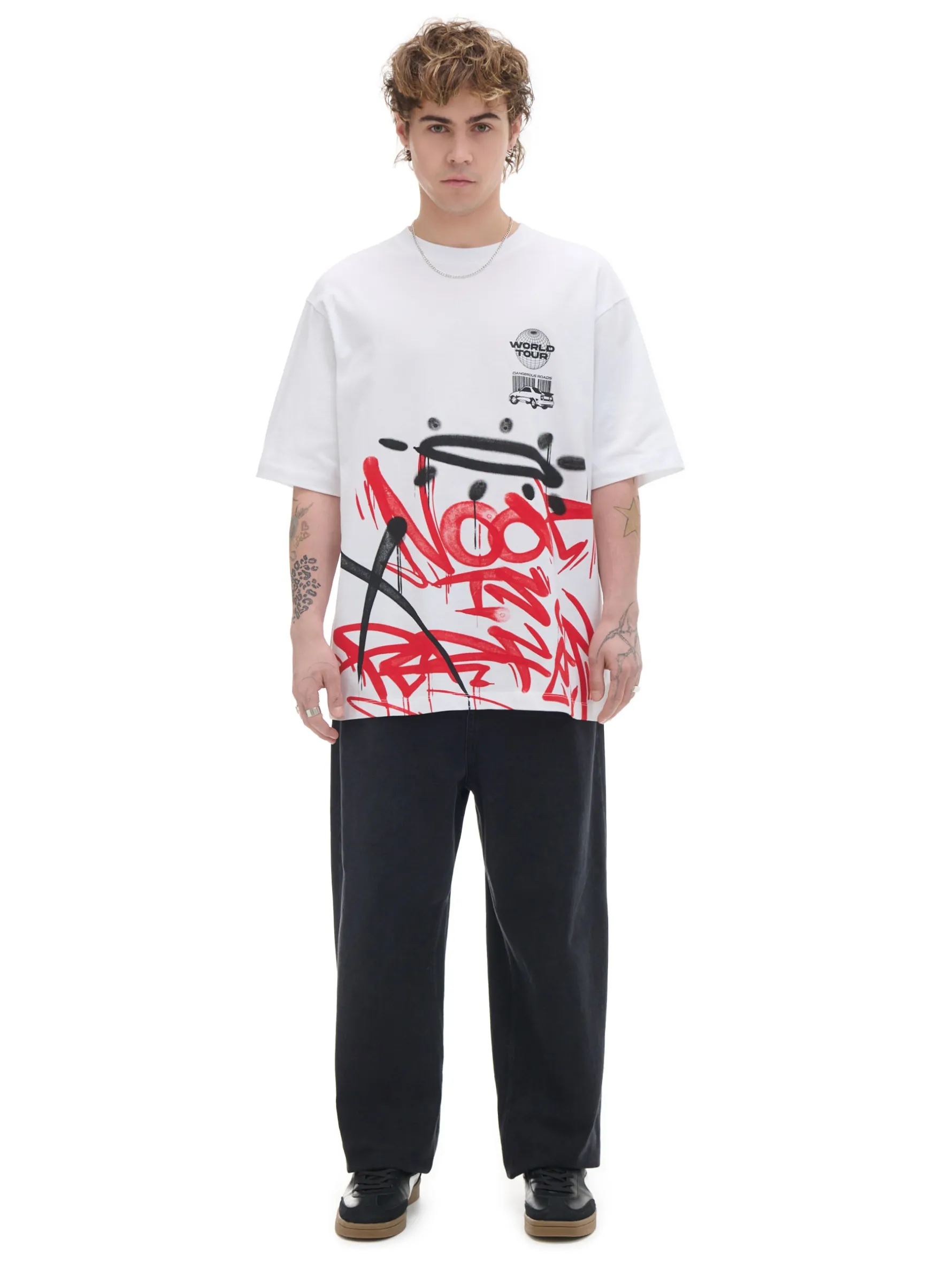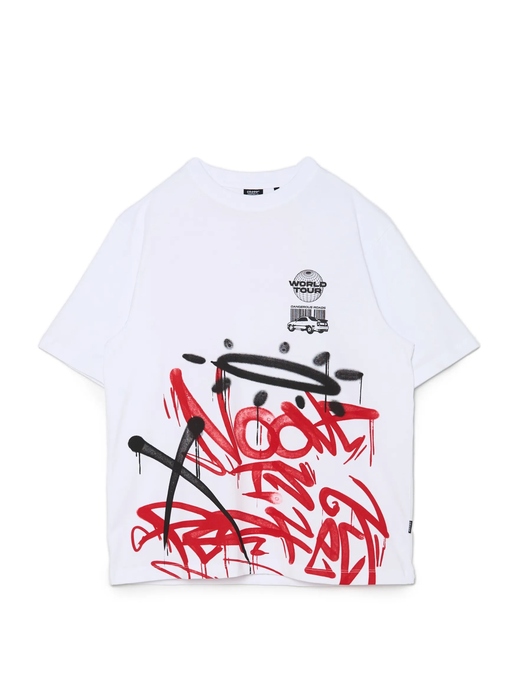 Biały męski t-shirt comfort uszyty w 100% z bawełny. Ozdobę stanowią 2 duże printy z przodu i na plecach w formie graffiti.
