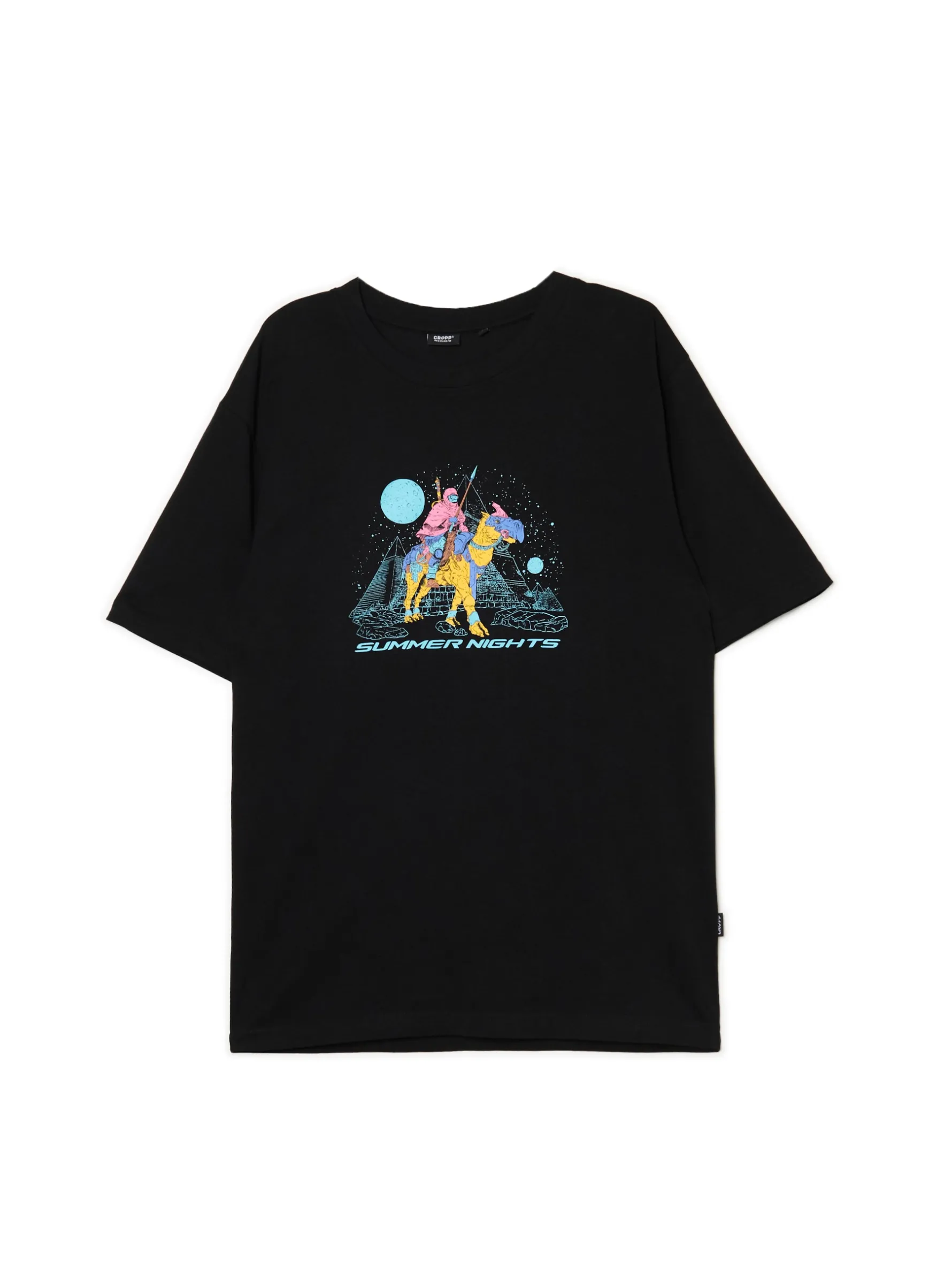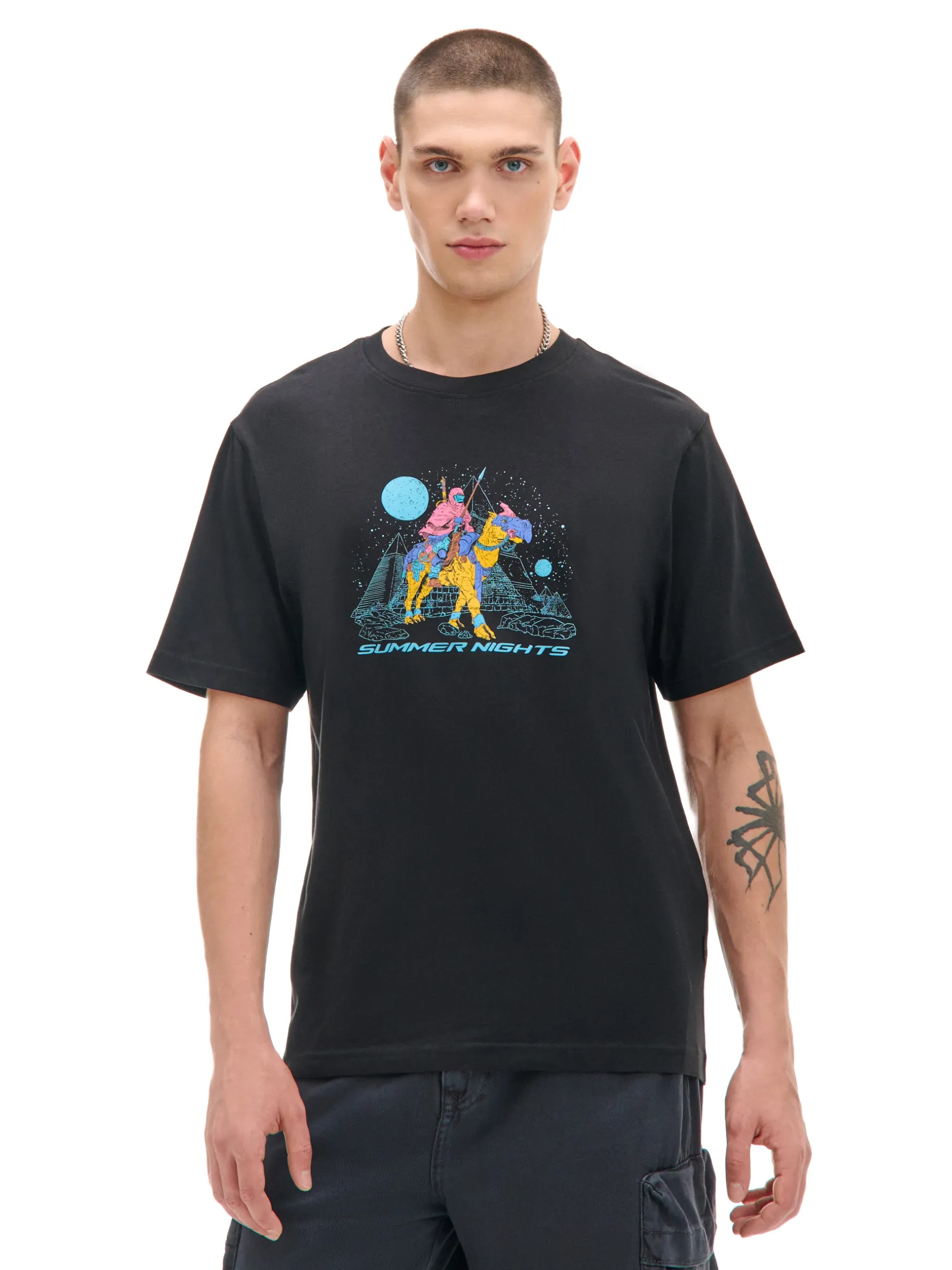 Bawełniana męska koszulka w kolorze czarnym z futurystycznym nadrukiem na przodzie. Summer vibes! 100% bawełny regularny krój oryginalny print