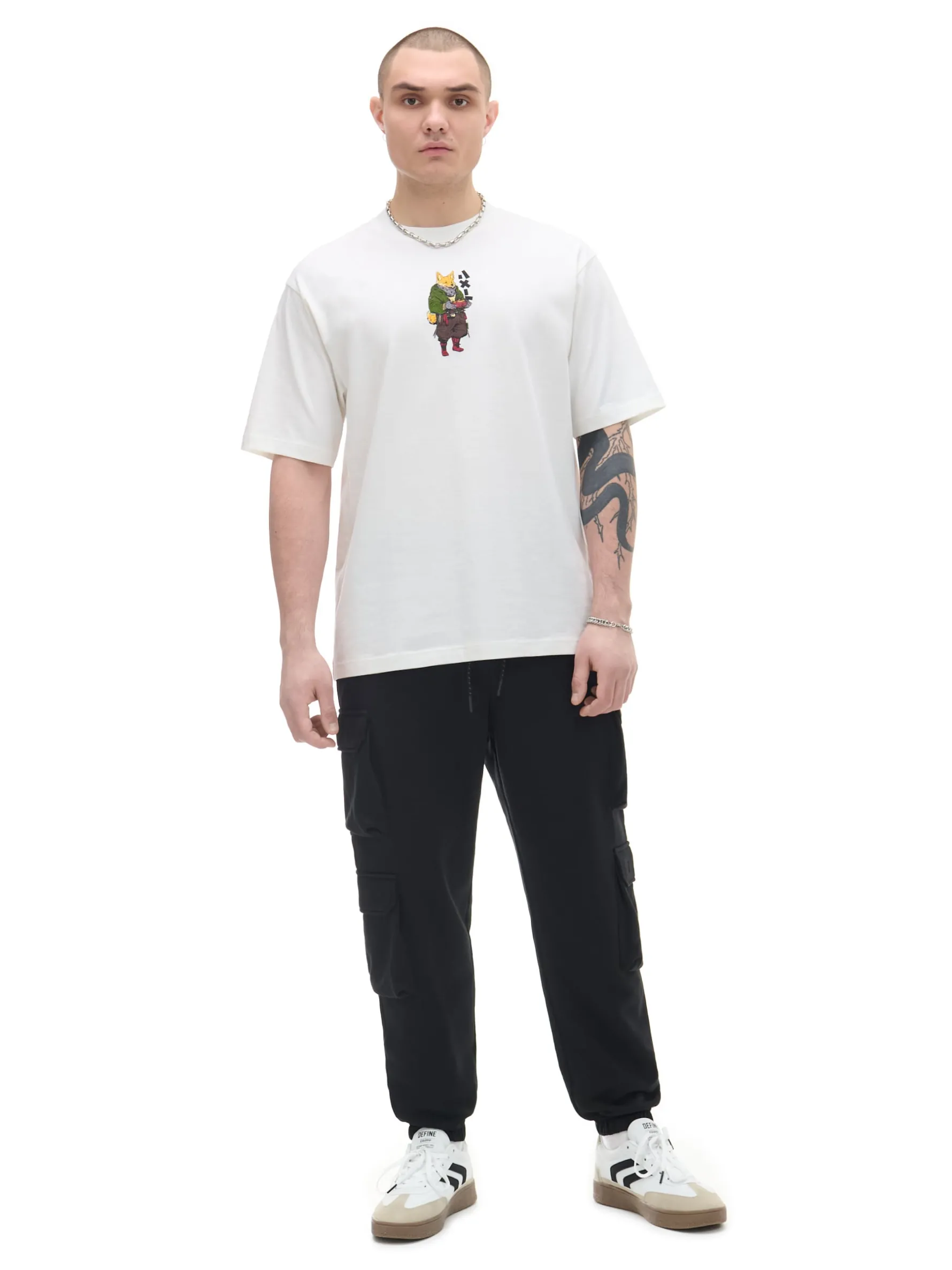 Kremowy t-shirt męski o kroju comfort, z obniżoną linią ramion. Uszyty z bawełnianej dzianiny. Z przodu i na plecach grafiki, które spodobają się każdemu fanowi ramenu.