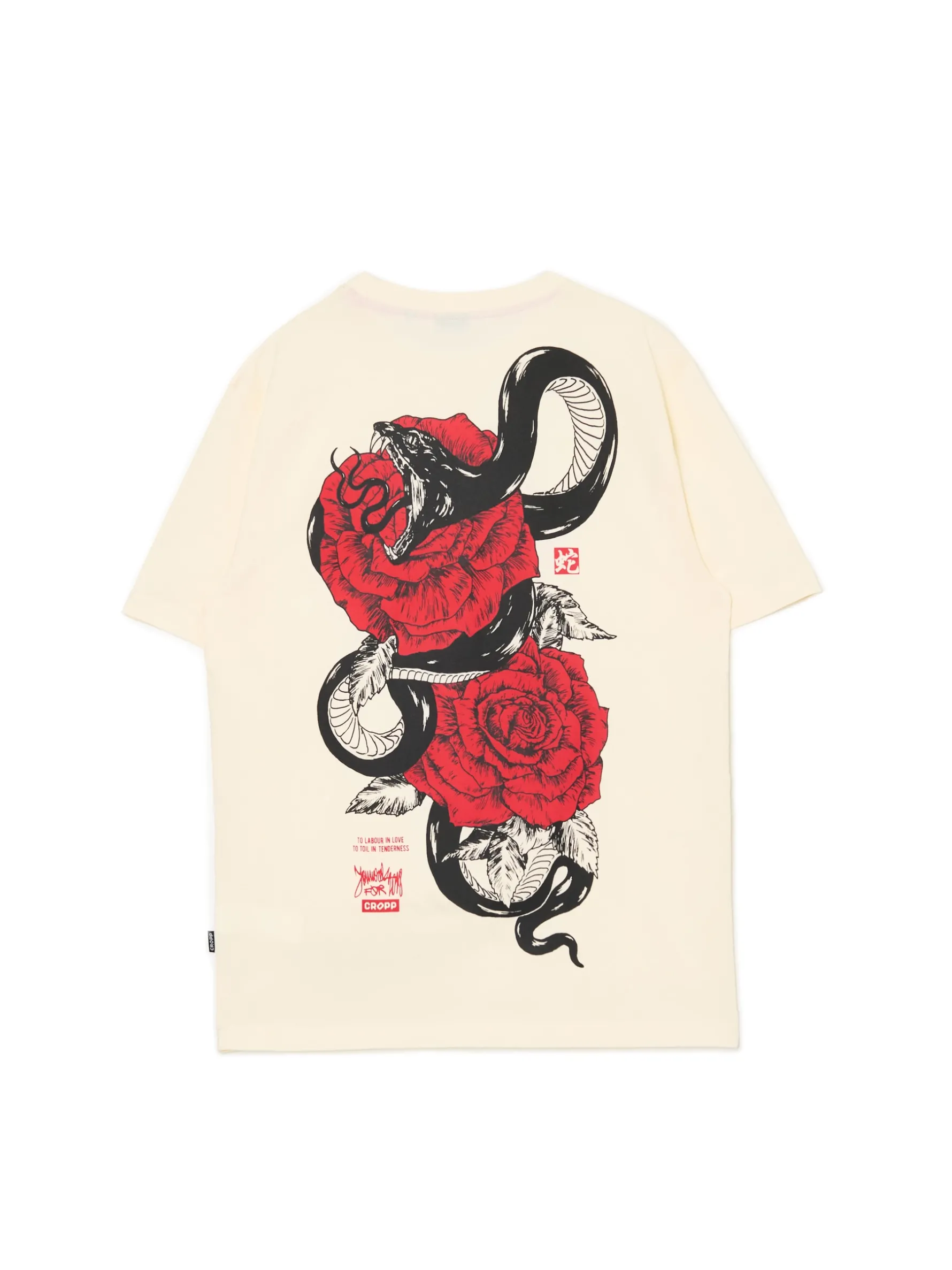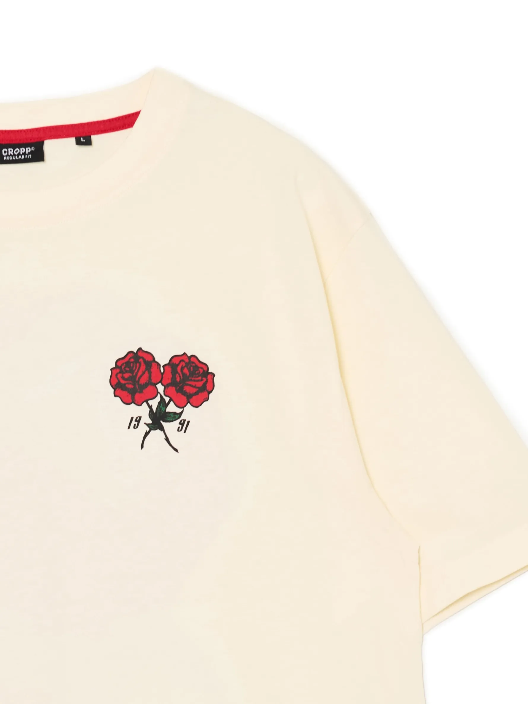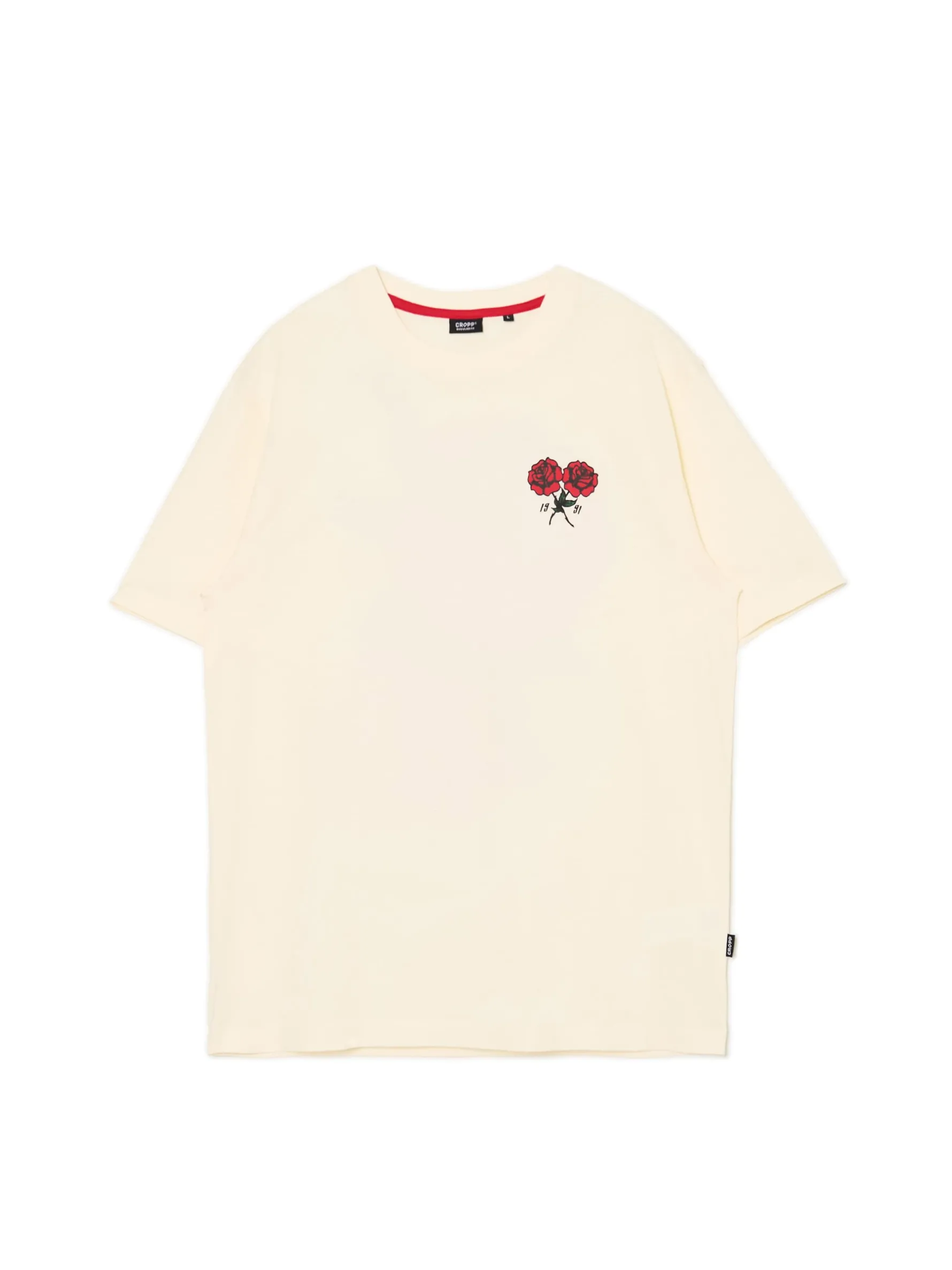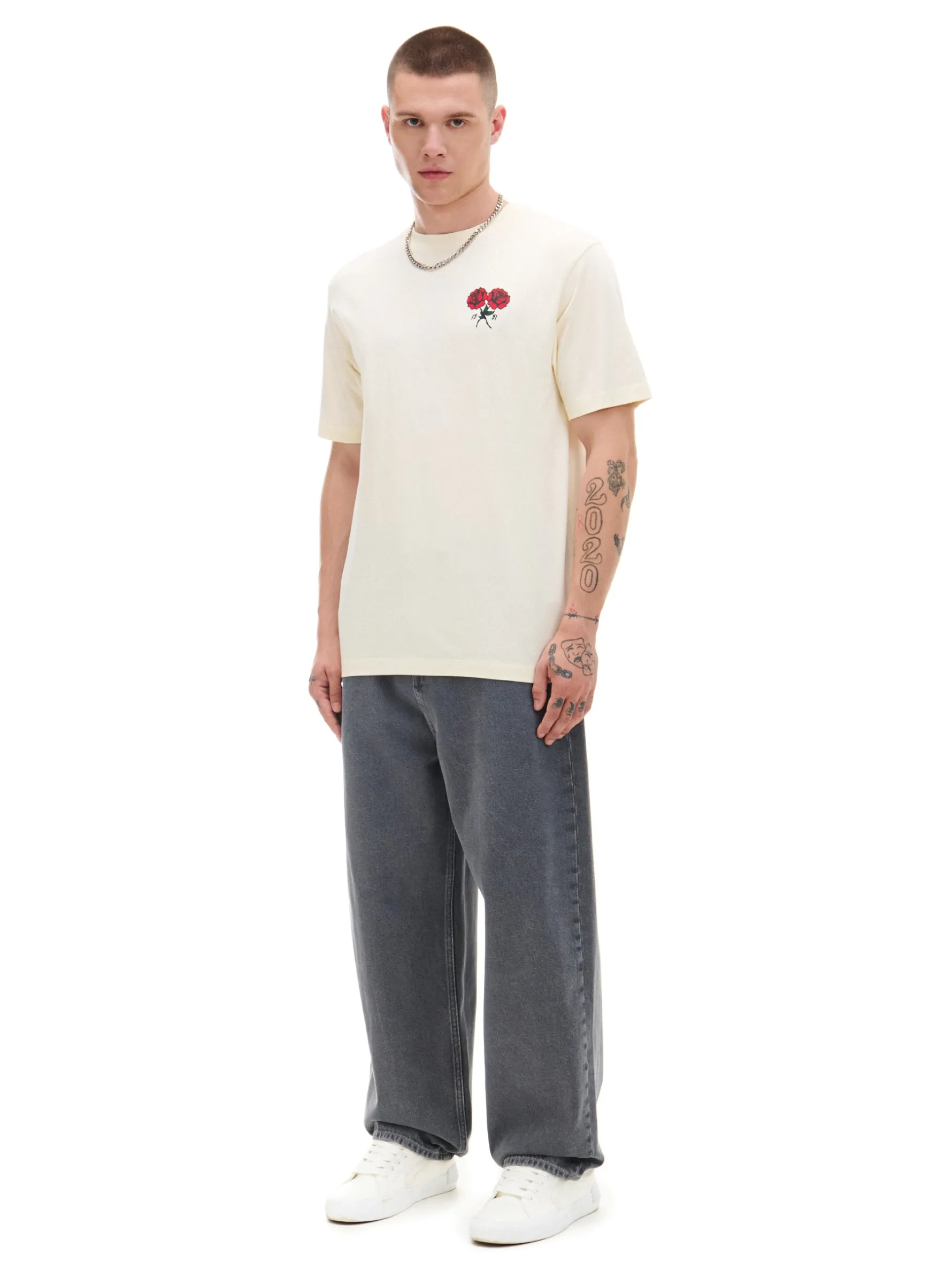 Kremowa koszulka męska o regularnym kroju, uszyta z bawełnianej dzianiny. Krótkie rękawy. Nadruki czerwonych róż z przodu i na rękawach. Model prezentuje produkt w rozmiarze: M Model prezentuje produkt w rozmiarze M/L. Wzrost modela: 185 cm