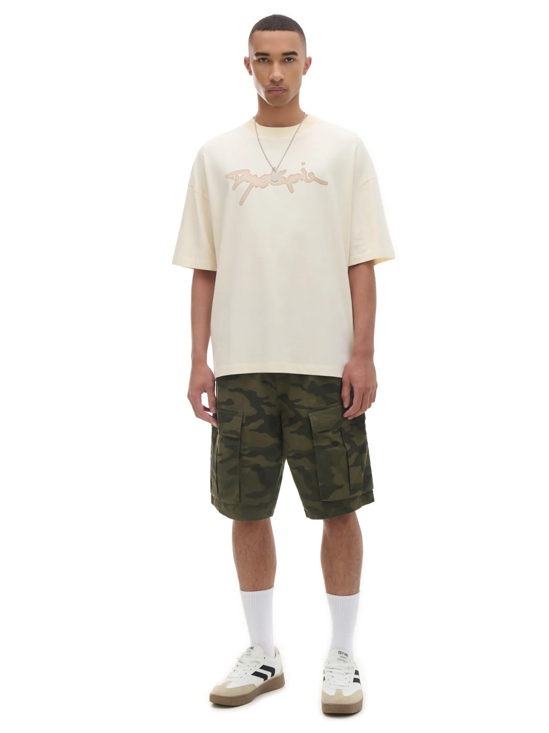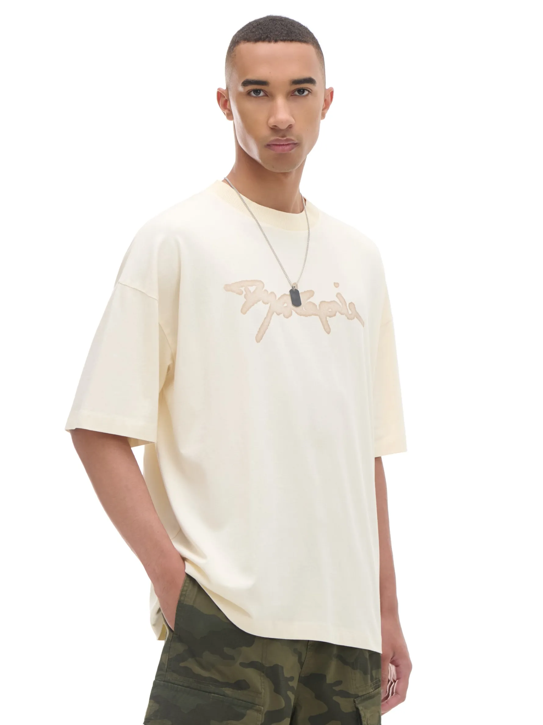 Męska koszulka w kroju boxy, uszyta z bawełny w kolorze kremowym z nadrukiem tekstowym. Fituje z każdym rodzajem spodni! 100% bawełny obszerny krój boxy krótkie, szerokie rękawy obniżona linia ramion napis z przodu efekt sprania na całości Wzrost modela: 185 cm