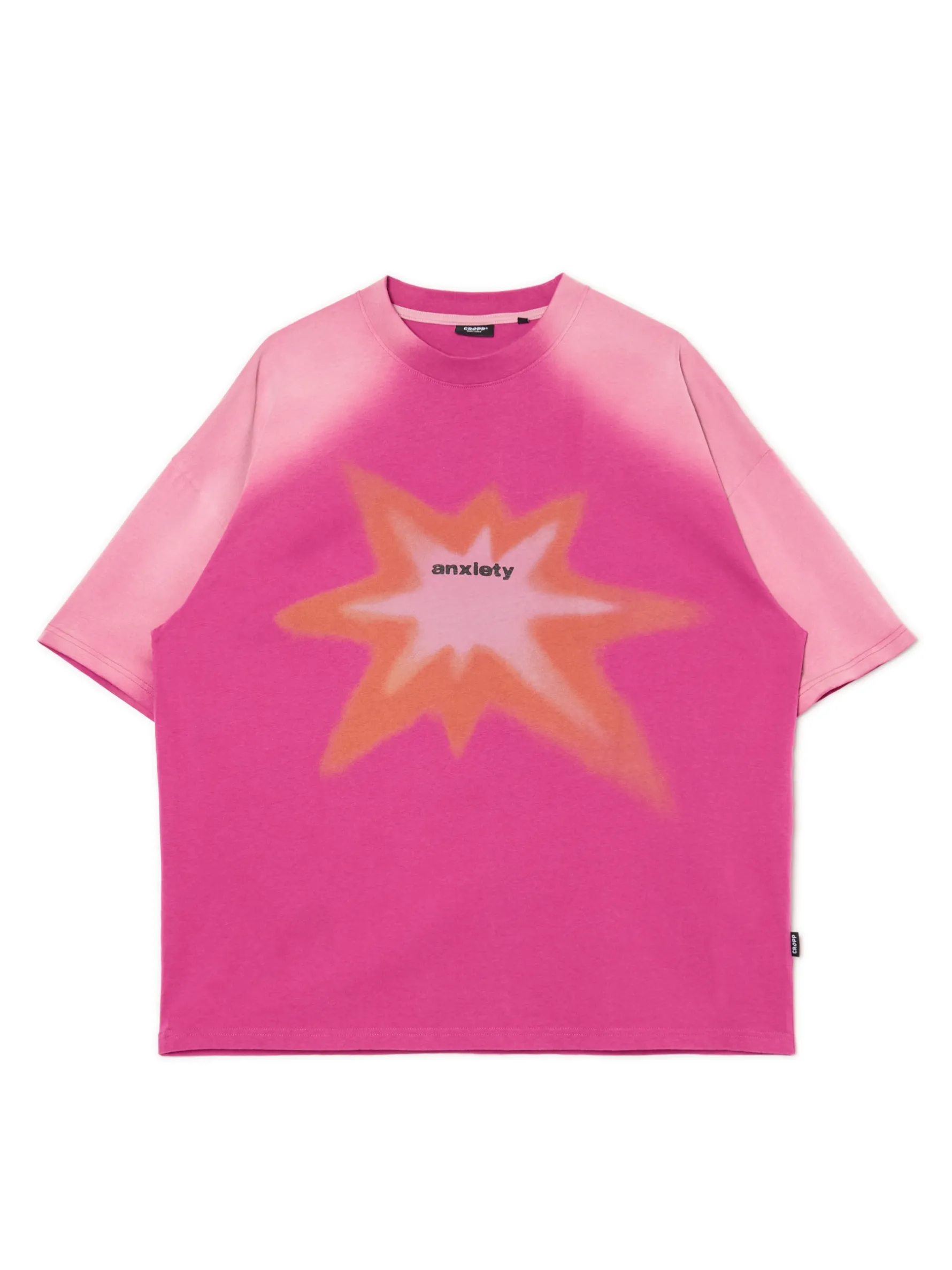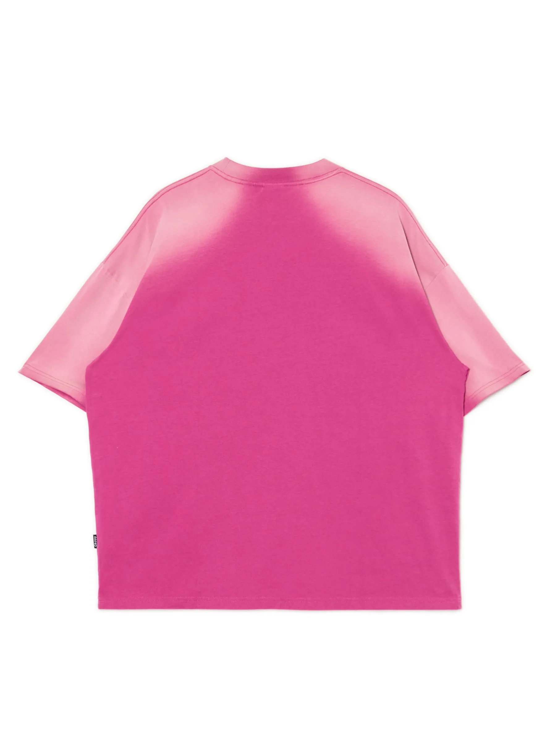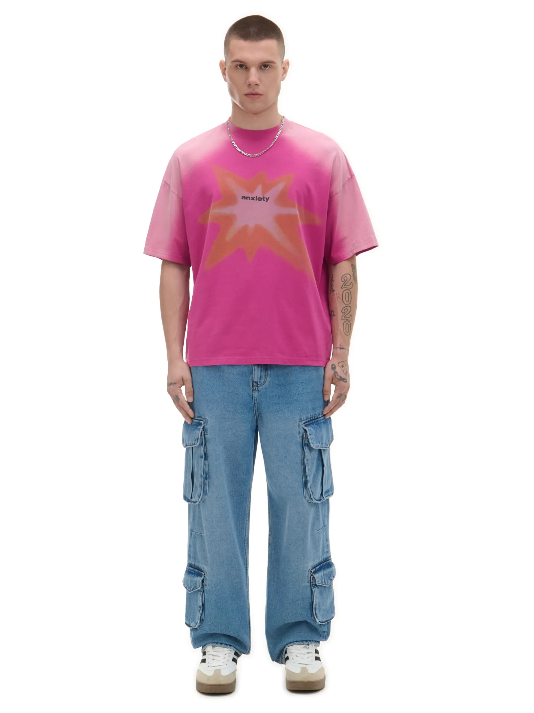 Męska koszulka z krótkim rękawem, uszyta z bawełnianej dzianiny w kolorze fuksji. Rękawy w jaśniejszym odcieniu i ten autorski nadruk wyróżnią Cię w tłumie! 100% bawełny obszerny krój boxy krótkie, raglanowe rękawy oryginalny print Model prezentuje produkt w rozmiarze M/L. Wzrost modela: 185 cm