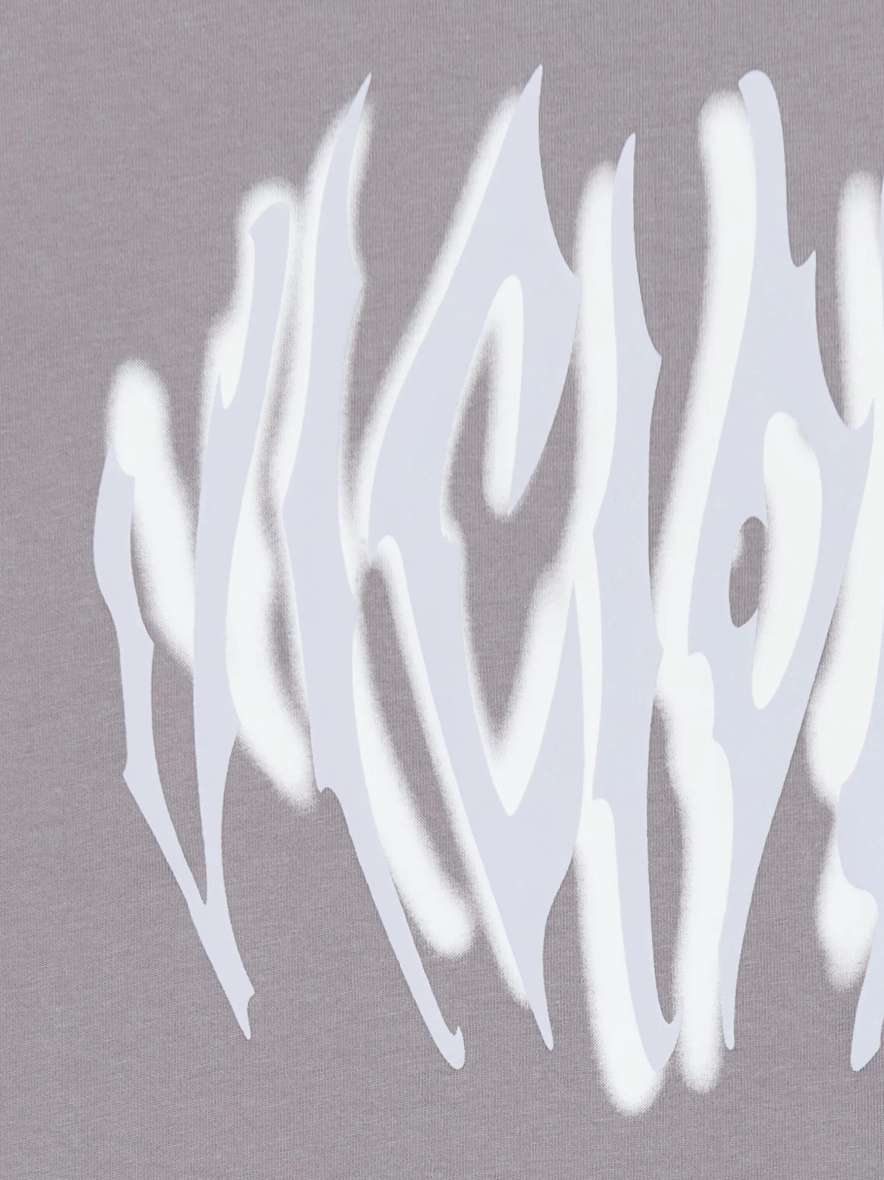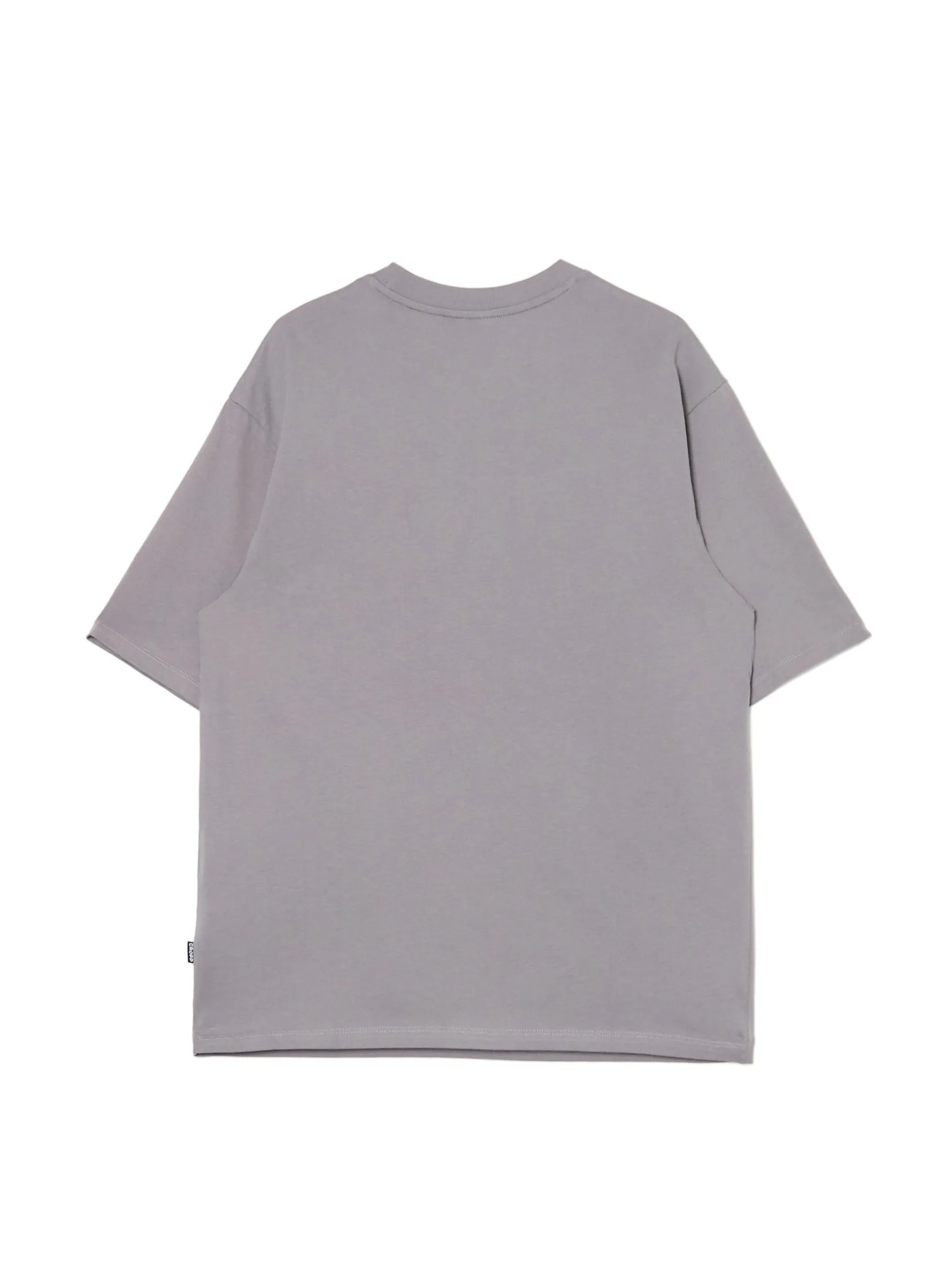 Szara męska koszulka typu comfort z krótkim rękawem uszyta w 100% z bawełny. Oryginalny, artystyczny nadruk na przodzie. Model prezentuje produkt w rozmiarze M. Wzrost modela: 185 cm