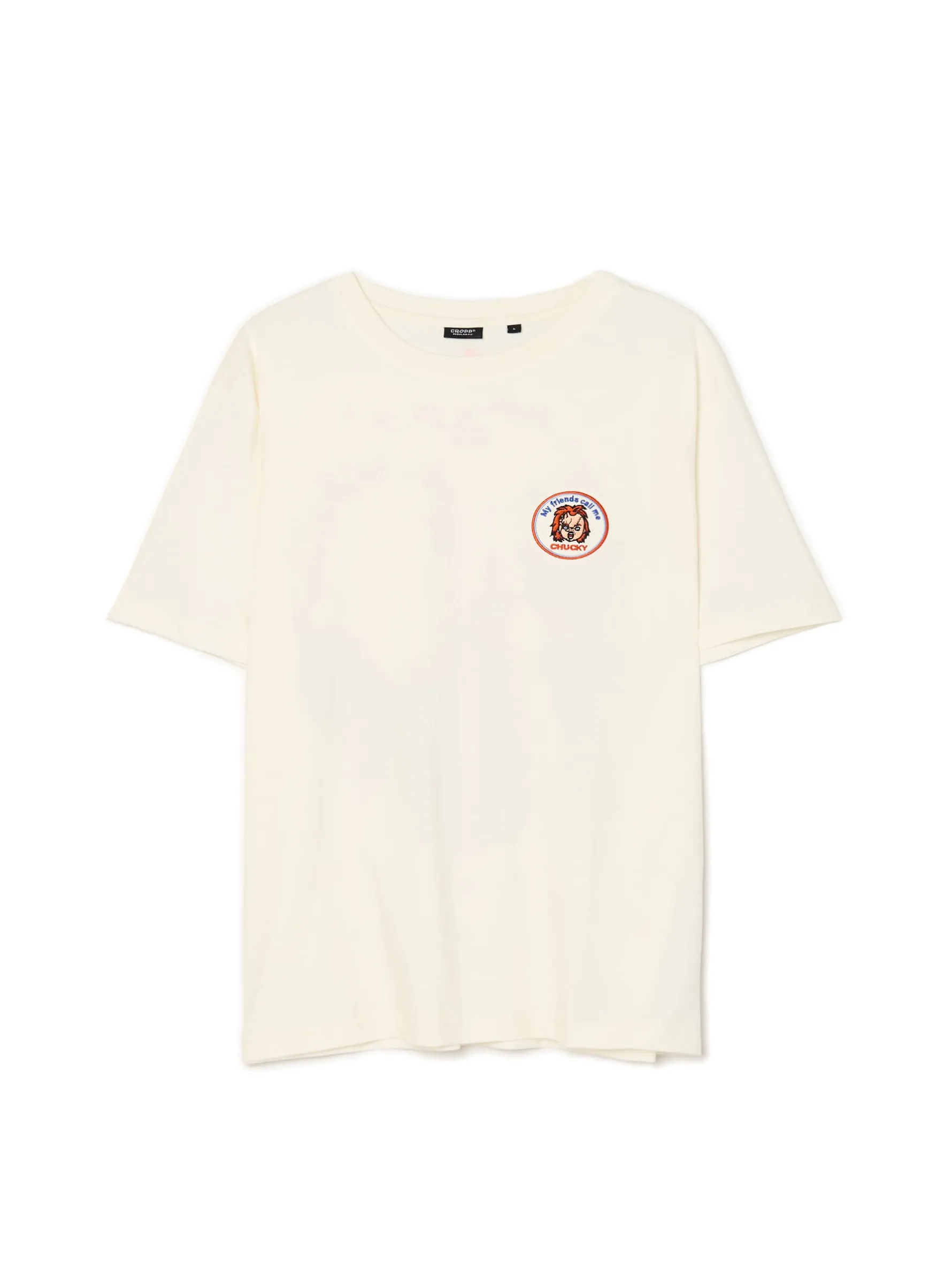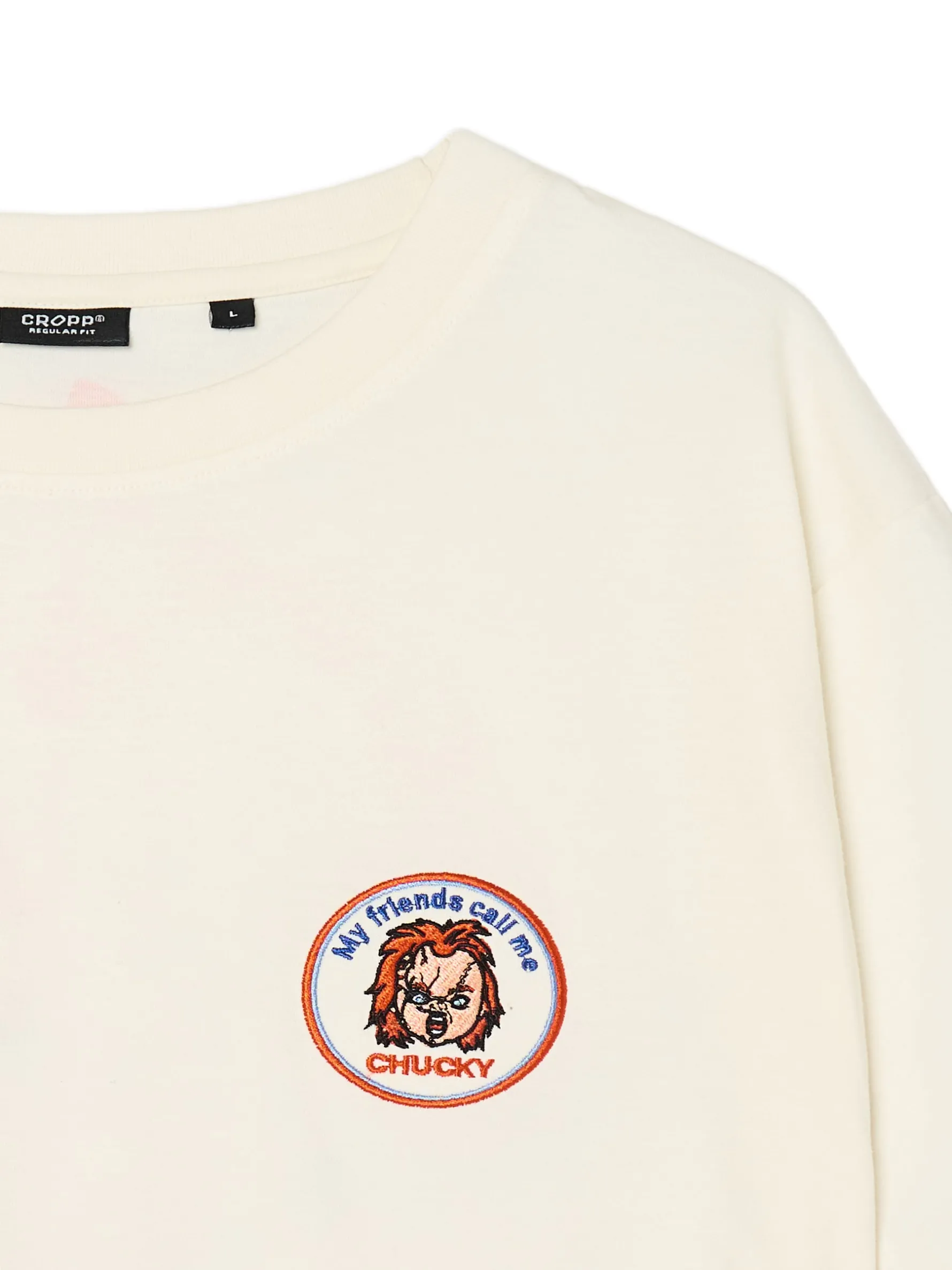 Męska kremowa koszulka, uszyta w 100% z bawełny. Idealna, jeśli kochasz horrory, Halloween, serię o demonicznej Laleczce Chucky, straszenie swoich znajomych… albo wszystko to na raz! regularny krój krótkie rękawy z przodu niewielka okrągła aplikacja z podobizną Laleczki Chucky z tyłu duży nadruk z motywem Chucky i napisami CHUCKY FRANCHISE © UNIVERSAL CITY STUDIOS LLC. ALL RIGHTS RESERVED