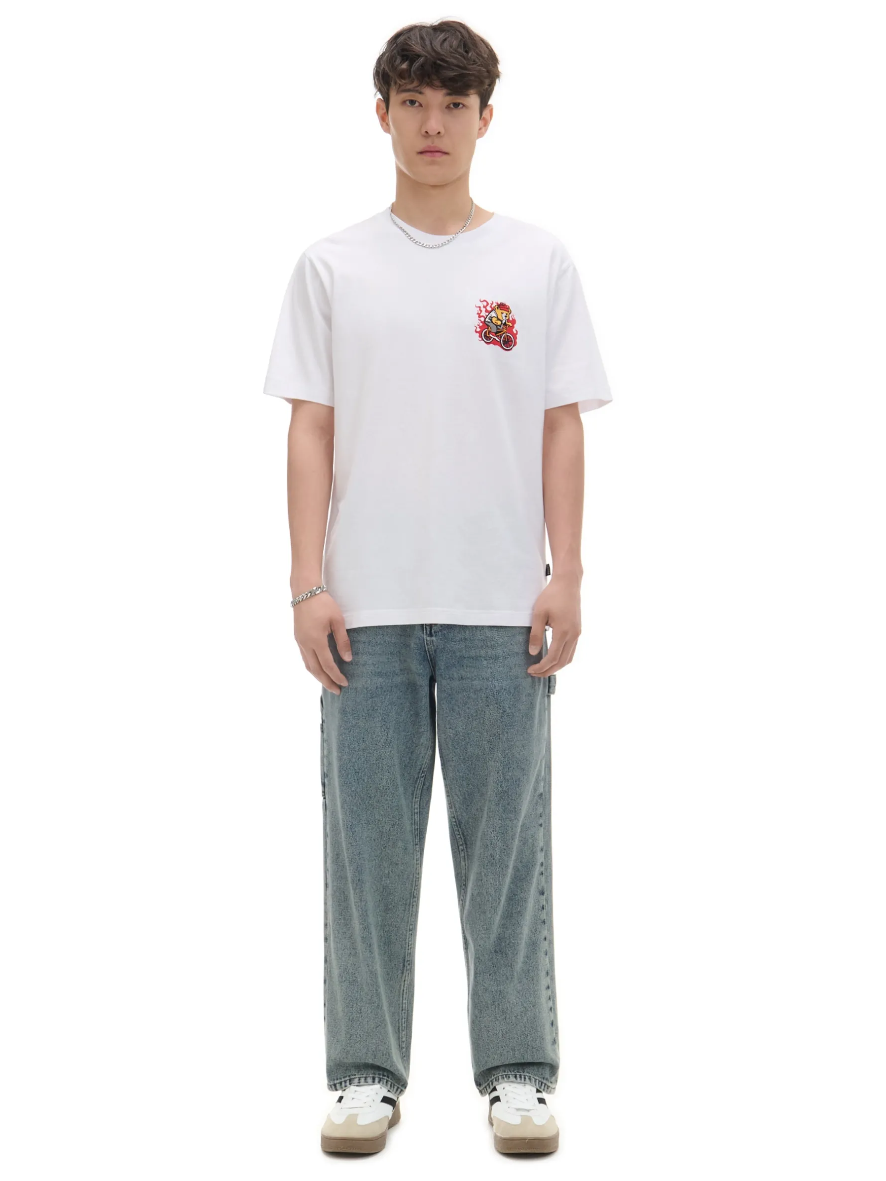 Koszulka męska o regularnym kroju, uszyta z bawełnianej dzianiny. Z przodu naszywka w streetowym stylu. 100% bawełny regularny krój krótkie, swobodne rękawy naszywka z przodu Model prezentuje produkt w rozmiarze M. Wzrost modela: 185 cm