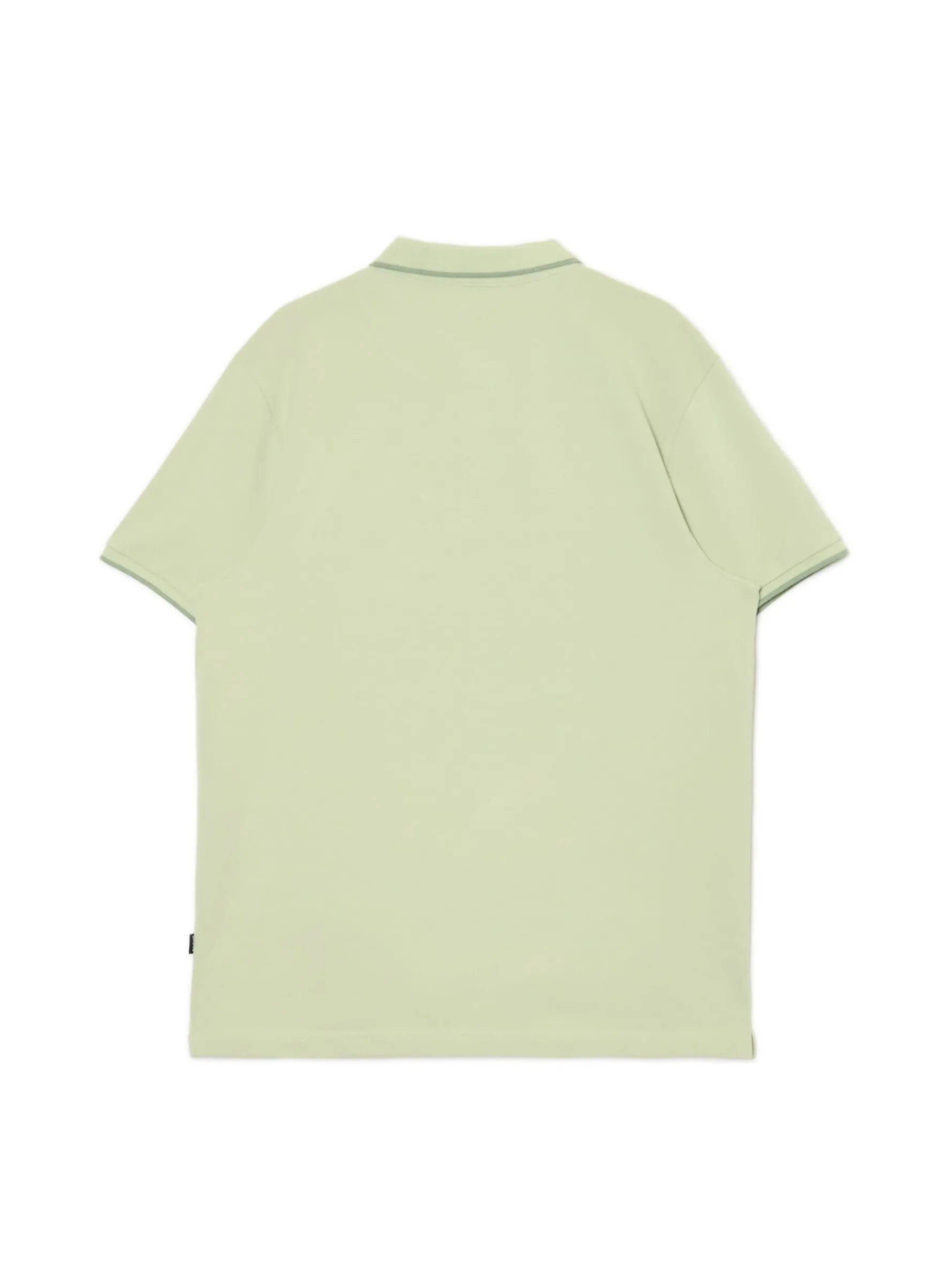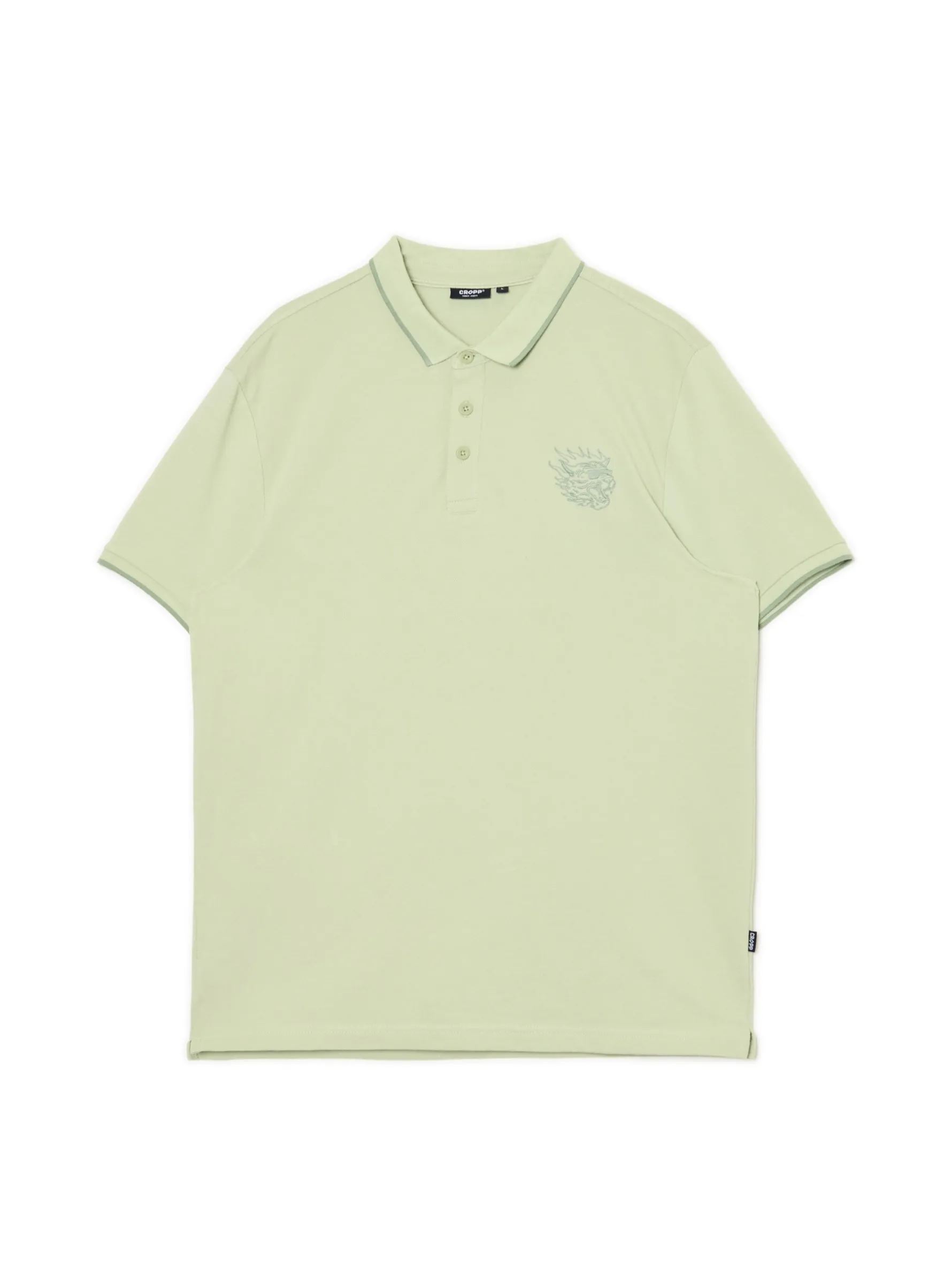 Jasnozielona męska koszulka polo, uszyta w 100% z bawełny. Dowód na to, że mix streetwearu i old money wygląda genialnie! regularny krój kołnierzyk polo i guziki krótkie rękawy z ciekawym wykończeniem na piersi haft z motywem tygrysa Wzrost modela: 185 cm