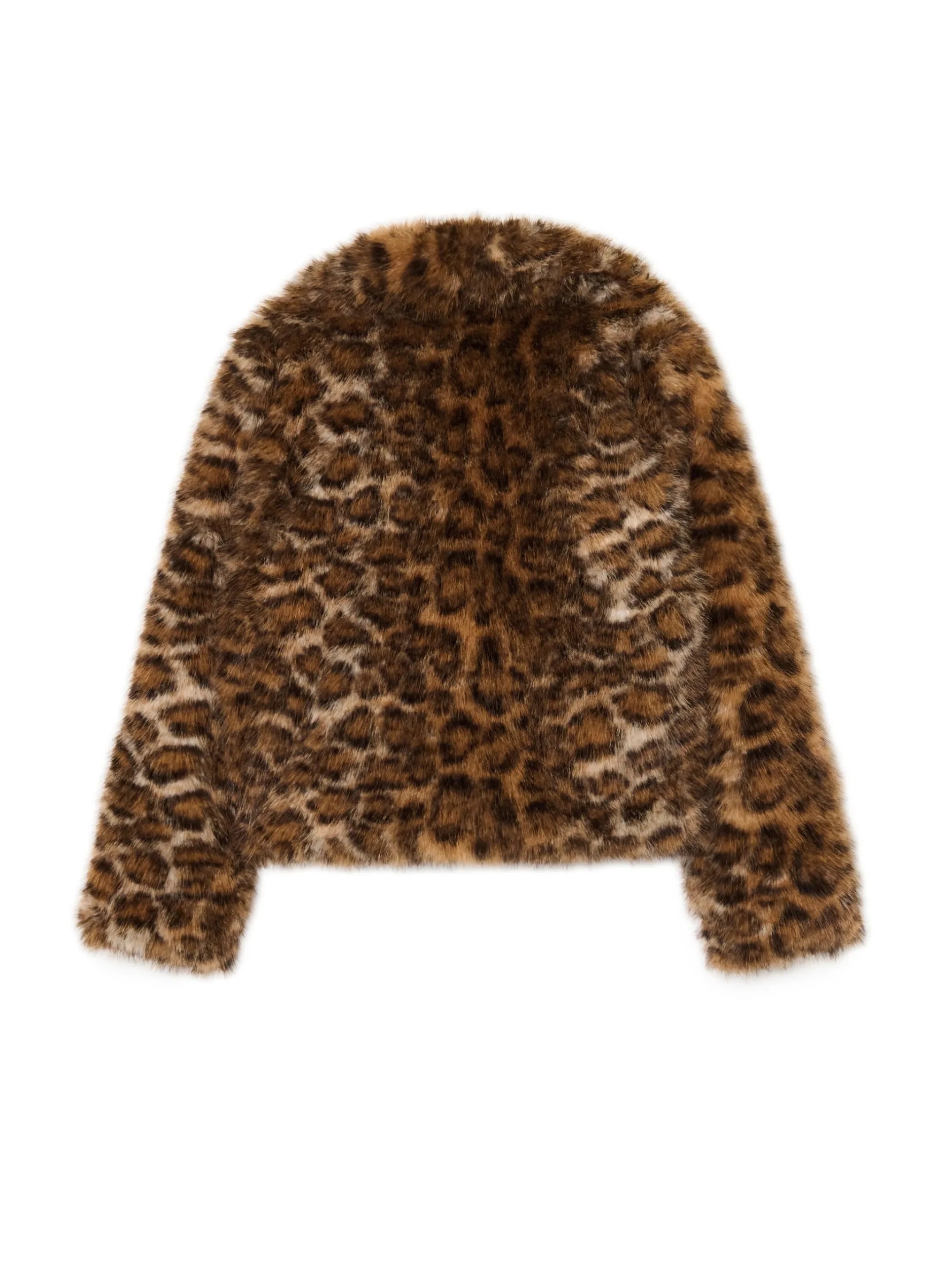 Damska kurtka, uszyta z przyjemnej w dotyku imitacji futra. Na całości nadruk w ponadczasowy wzór w panterkę. Ciepły i stylowy item na sezon przejściowy! gładka podszewka regularny krój zapięcie na guziki długie, swobodne rękawy wykładany kołnierz