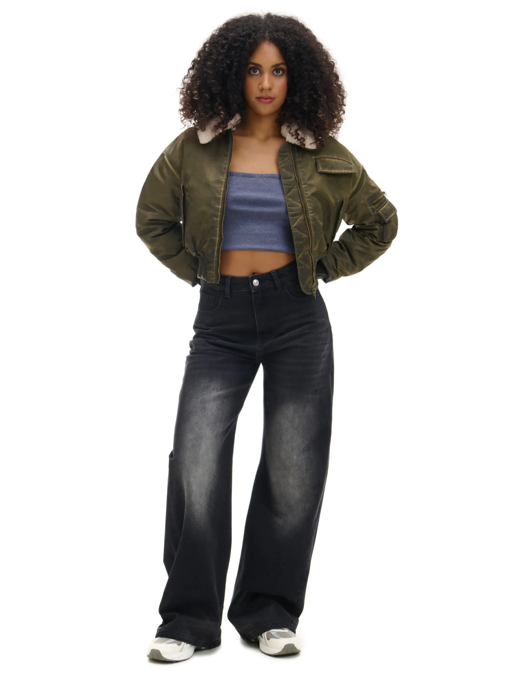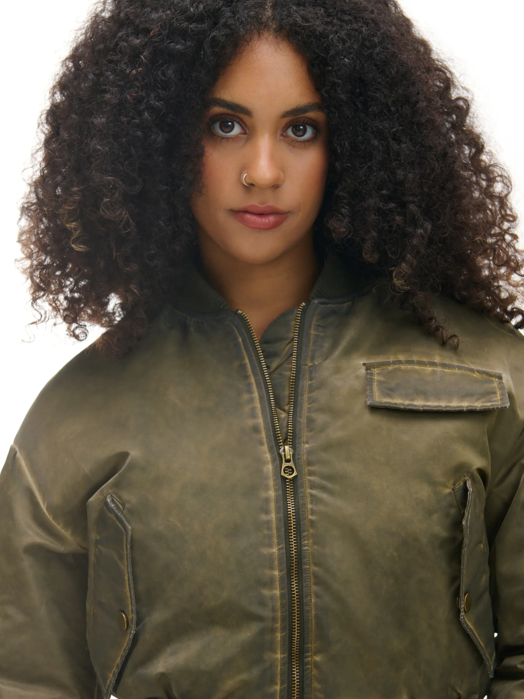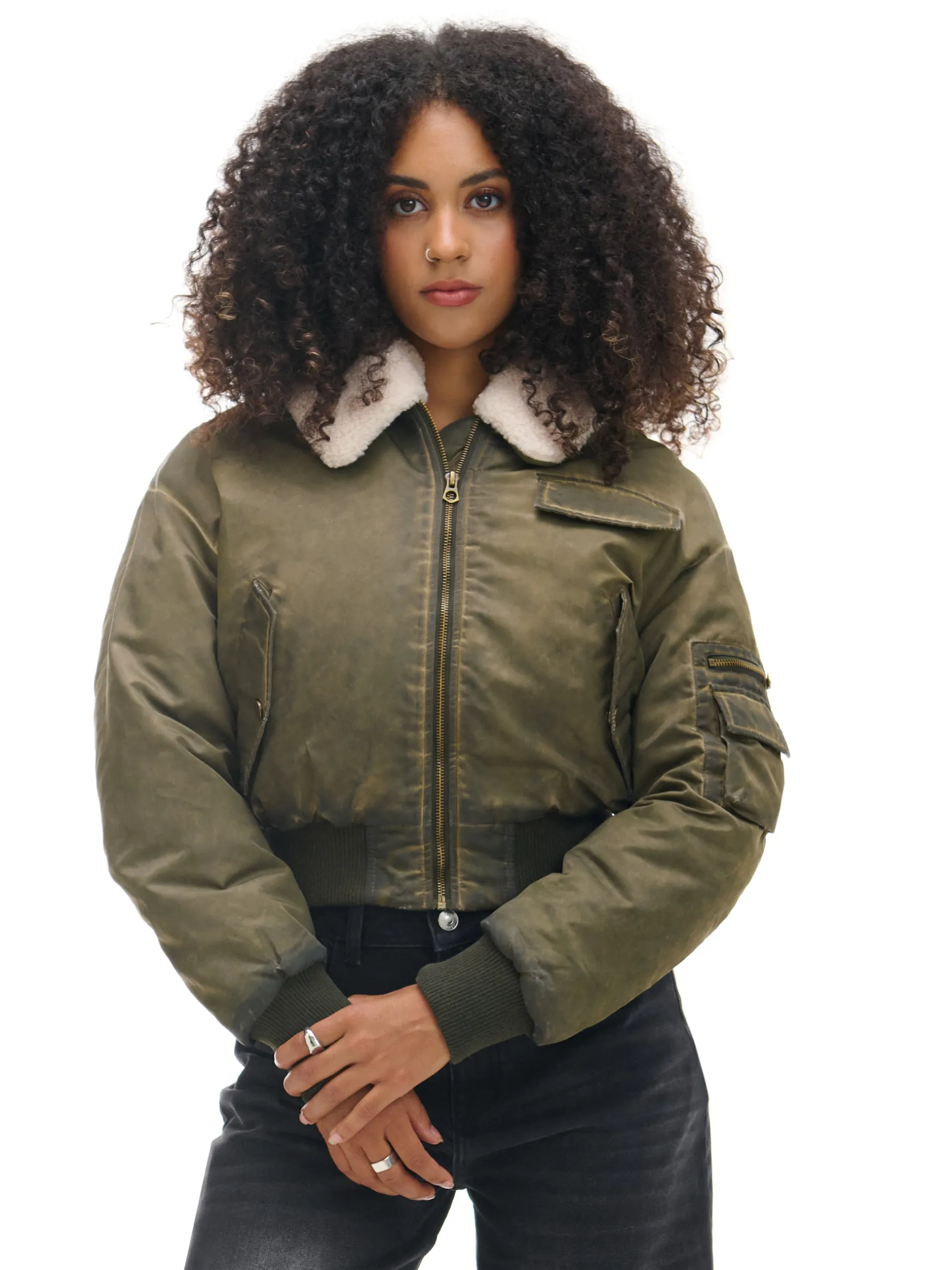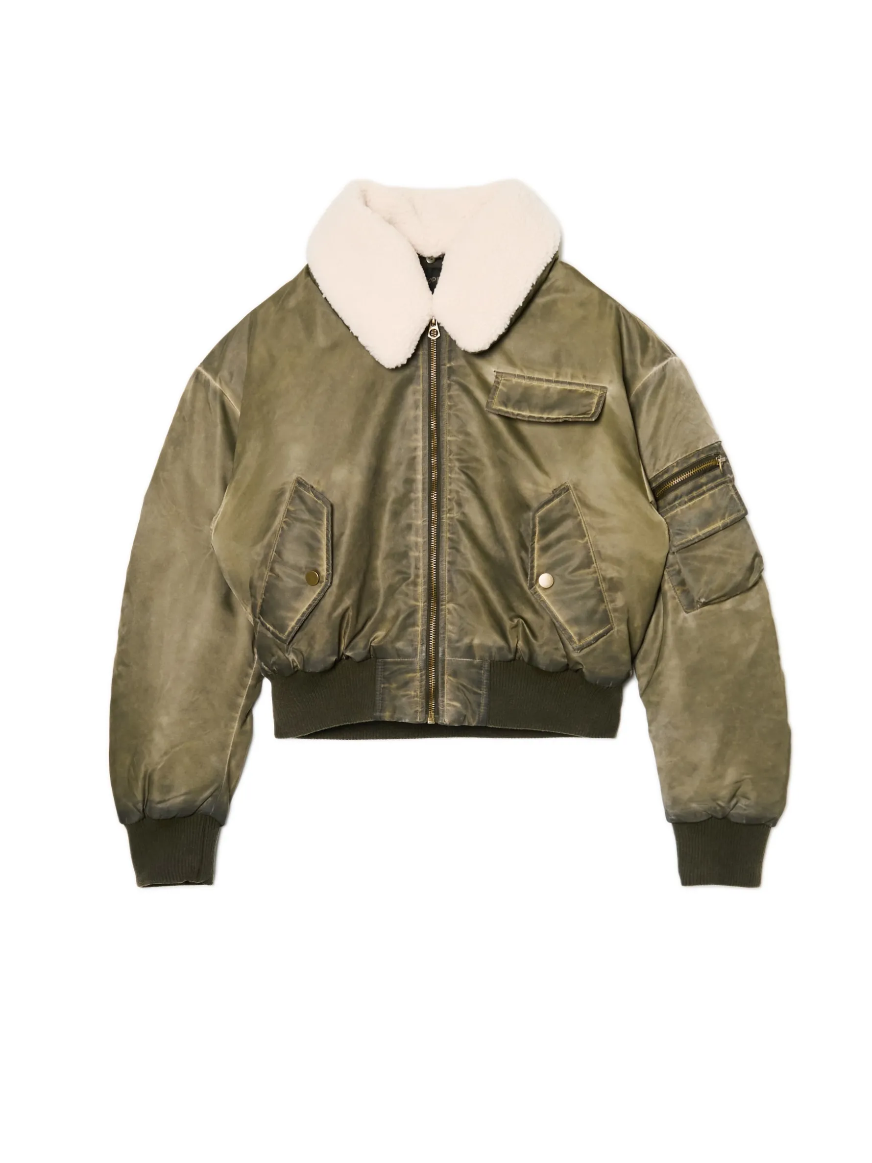 Kurtka damska typu pilotka uszyta z nylonowej tkaniny z efektem sprania. W zestawie odpinany kołnierz z obszyciem. Idealna basic przejściówka na różne okazje. regularny, nieco krótszy krój zapięcie na suwak odpinany kołnierz z miękkiego sztucznego baranka dół i rękawy wykończone ściągaczem imitacja kieszeni z patką na piersi dwie kieszenie z patkami i zapięciem na zatrzaski dwie dodatkowe kieszonki na rękawie – zapinane na suwak i na rzep efekt sprania