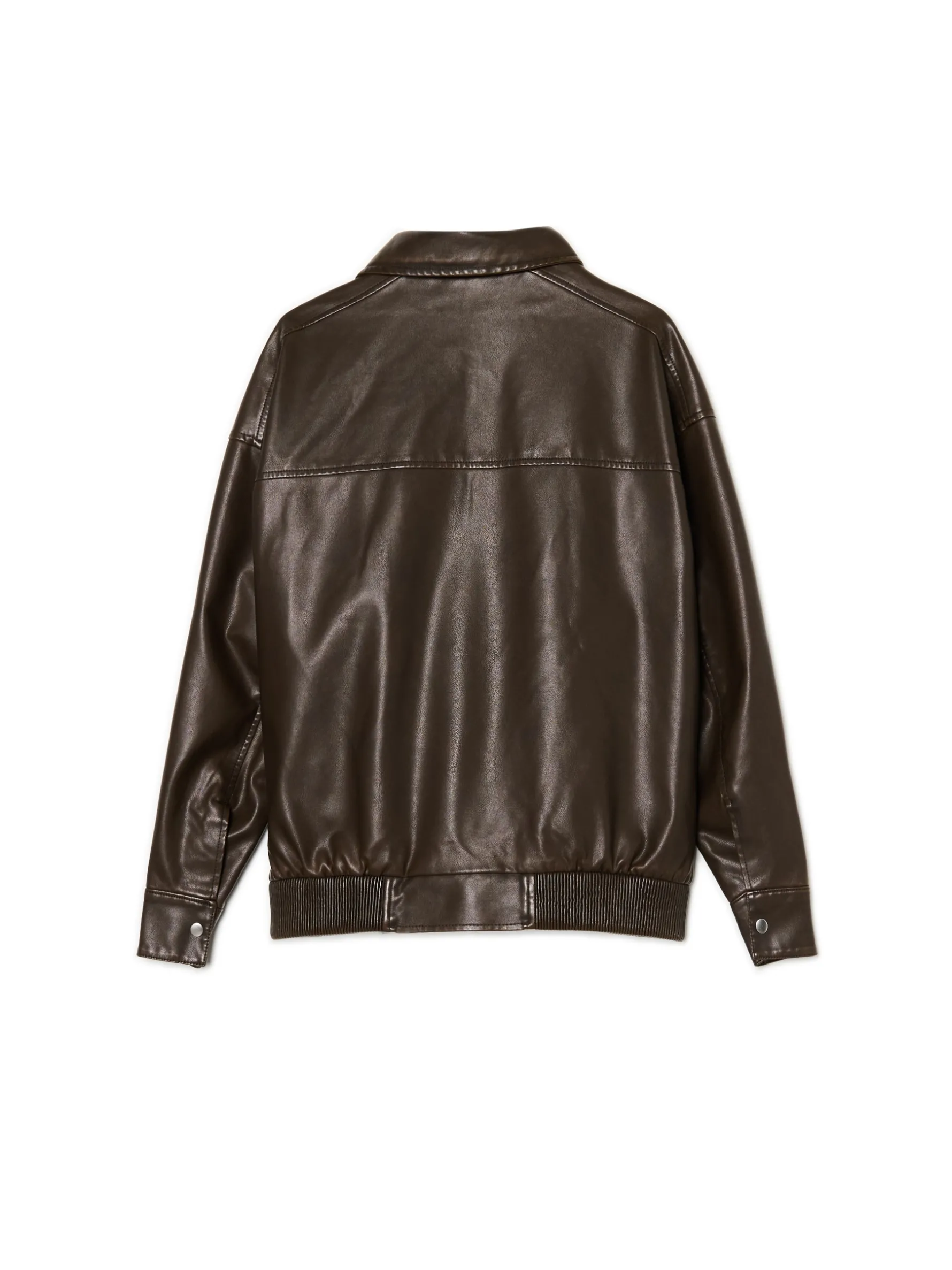 Kurtka damska typu bomber o kroju dad fit, uszyta z materiału imitującego skórę. Ponadczasowa odzież wierzchnia w odświeżonej wersji. przejściowa kurtka typu bomber wewnątrz gładka podszewka zapinana na zamek na całej długości wykładany kołnierz długie rękawy z zatrzaskami przy mankietach dół wykończony elastyczną gumą otwarte kieszenie po bokach delikatny efekt sprania Wzrost modelki: 177 cm