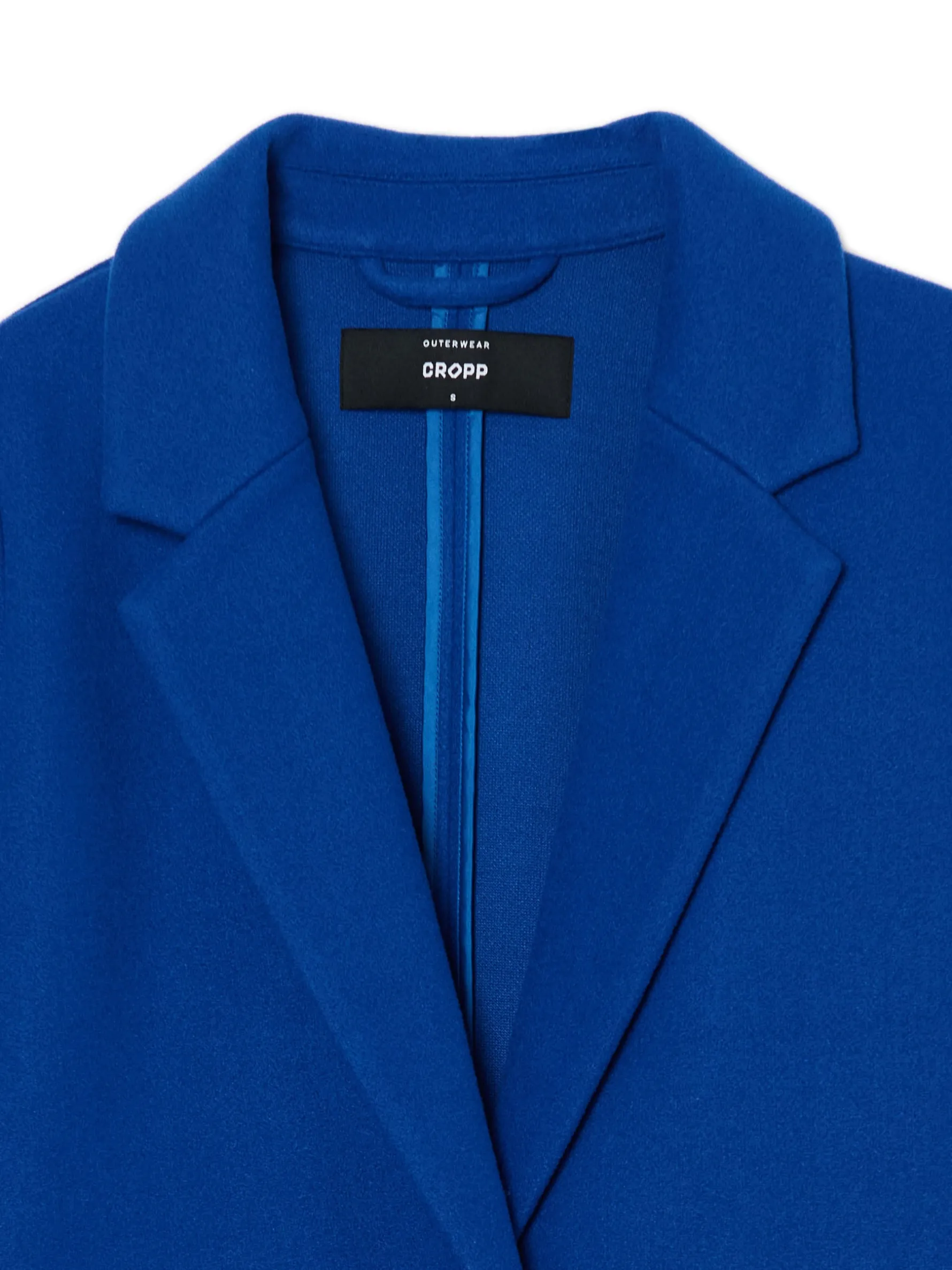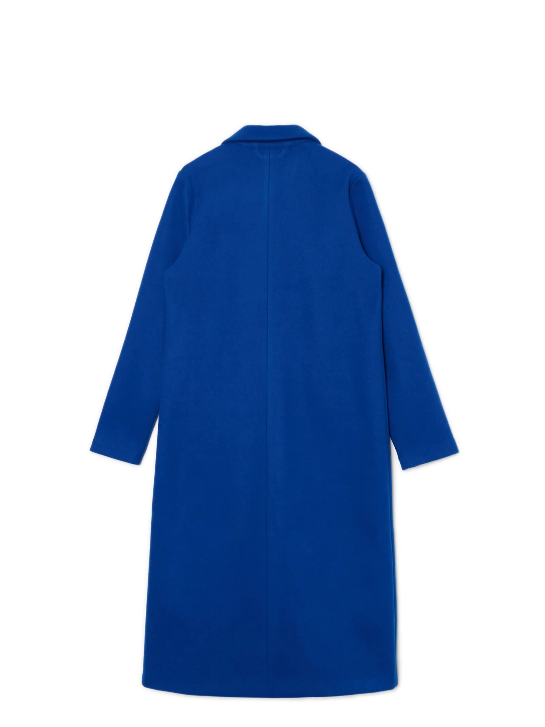 Prosty damski płaszcz, uszyty z gładkiej dzianiny w chabrowym kolorze. regularny krój zapięcie na guzik lamowane szwy wewnątrz wykładany kołnierz dwie kieszenie po bokach