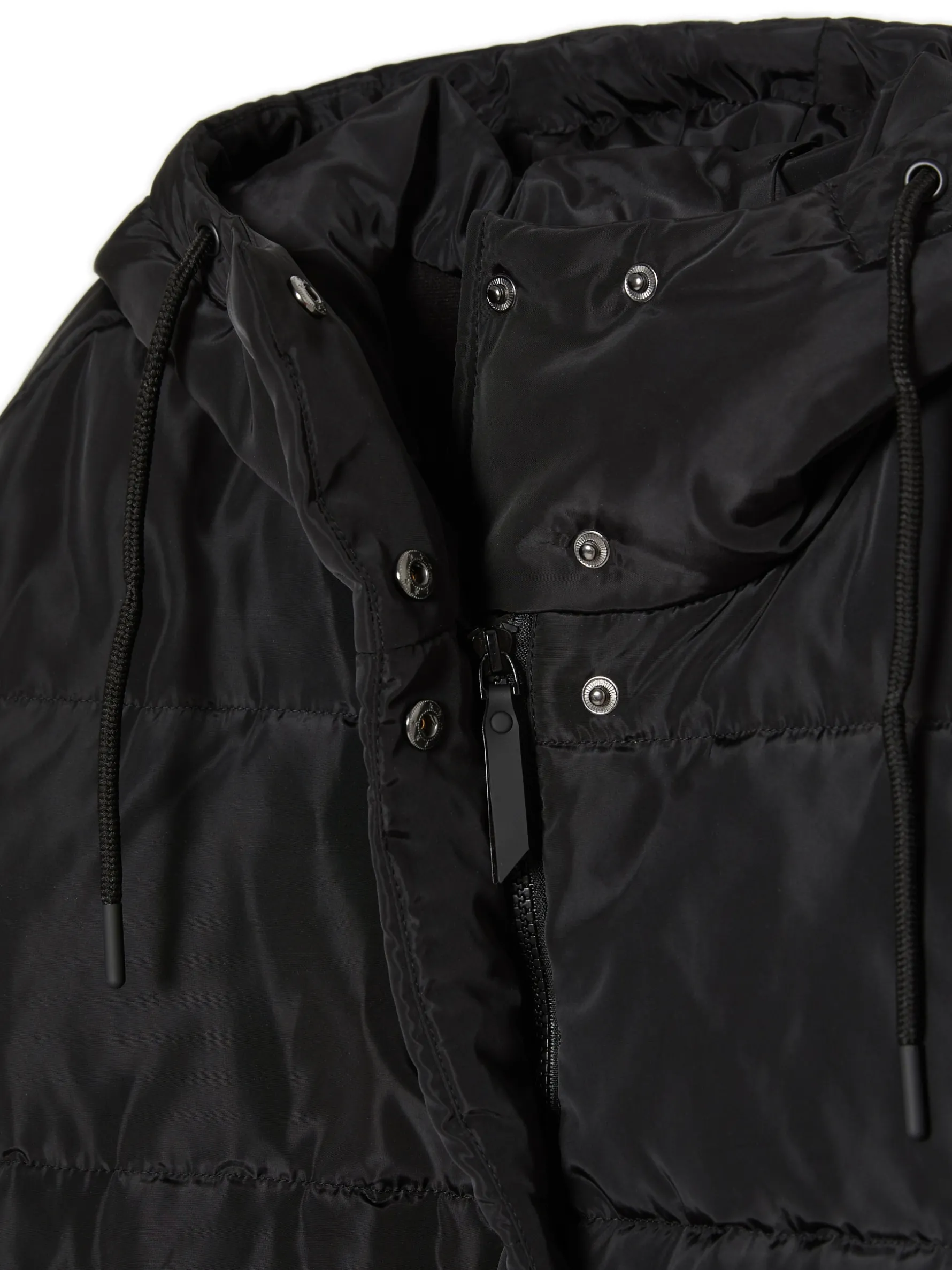 Damska czarna kurtka puffer, uszyta z wodoodpornej tkaniny. Idealna na jesienny sezon przejściowy. średnia długość, regularny krój pikowanie na całej powierzchni zapięcie na suwak, kryty panelem zapinanym na zatrzaski stójka zapinana na zatrzaski kaptur regulowany sznurkiem rękawy i dolny brzeg zakończone ściągaczem z wszytą elastyczną gumką dwie kieszenie podszewka z polarowego, przyjemnego w dotyku materiału wypełnienie z poliestru Wzrost modelki: 177 cm