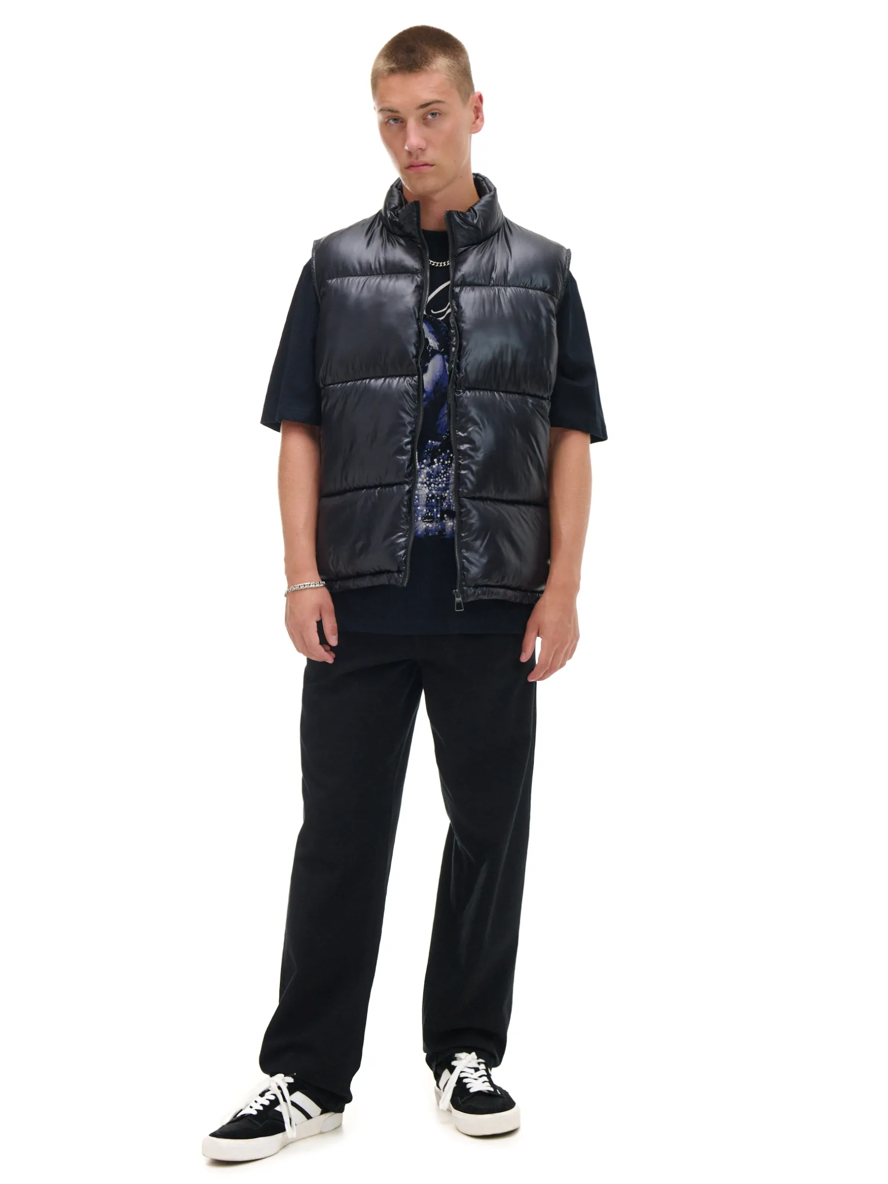 Kamizelka męska na sezon przejściowy, uszyta z pikowanej tkaniny w kolorze czarnym. pikowanie na całości zapinana na zamek na całej długości regulacja dołu za pomocą gumki ze ściągaczem dwie kieszenie z zamkami po bokach wewnątrz kieszeń zapinana na rzep Wzrost modela: 185 cm PROTECTION LEVEL 3 Kamizelka uszyta z tkaniny z większym ociepleniem, której właściwości zapewnią Ci nie tylko ochronę przed wiatrem i deszczem, ale też niskimi temperaturami.