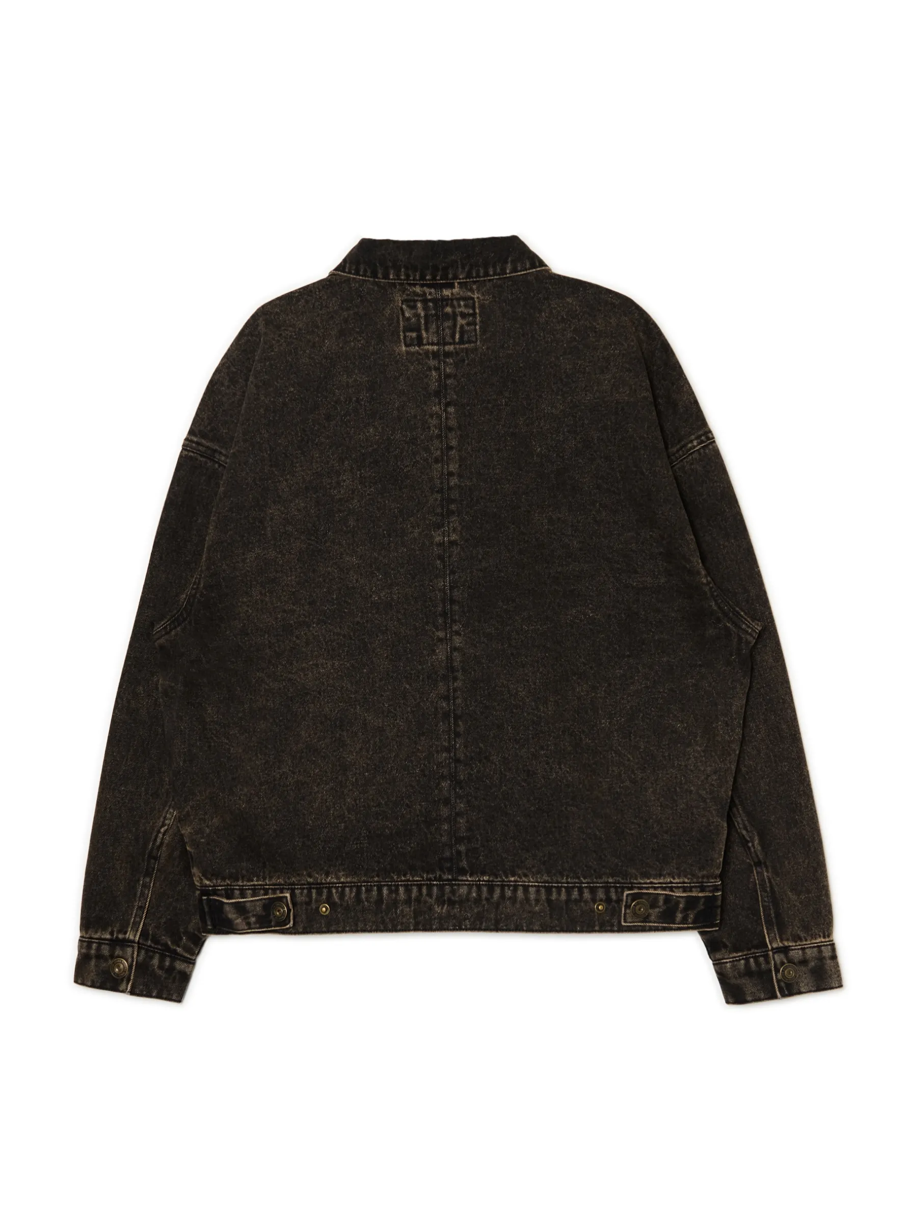 Męska katana, uszyta z bawełnianego denimu z nietypowym zabarwieniem. zapinana na zatrzaski duże kieszenie patkami na piersiach boczne kieszenie krótki kołnierzyk długie rękawy, zakończone mankietami zapinanymi na zatrzaski regulacja obwodu za pomocą pasków z zatrzaskami Wzrost modela: 185 cm