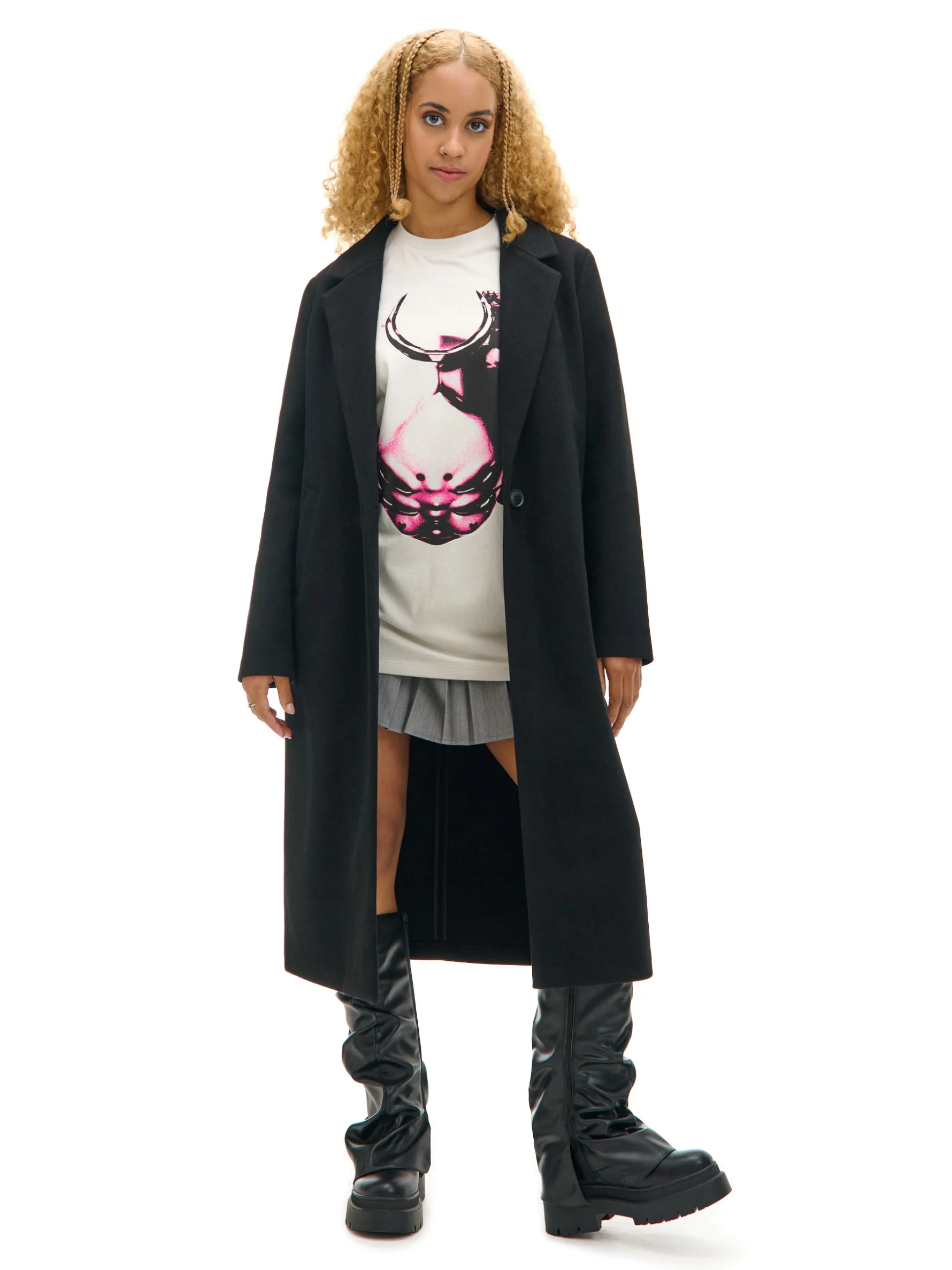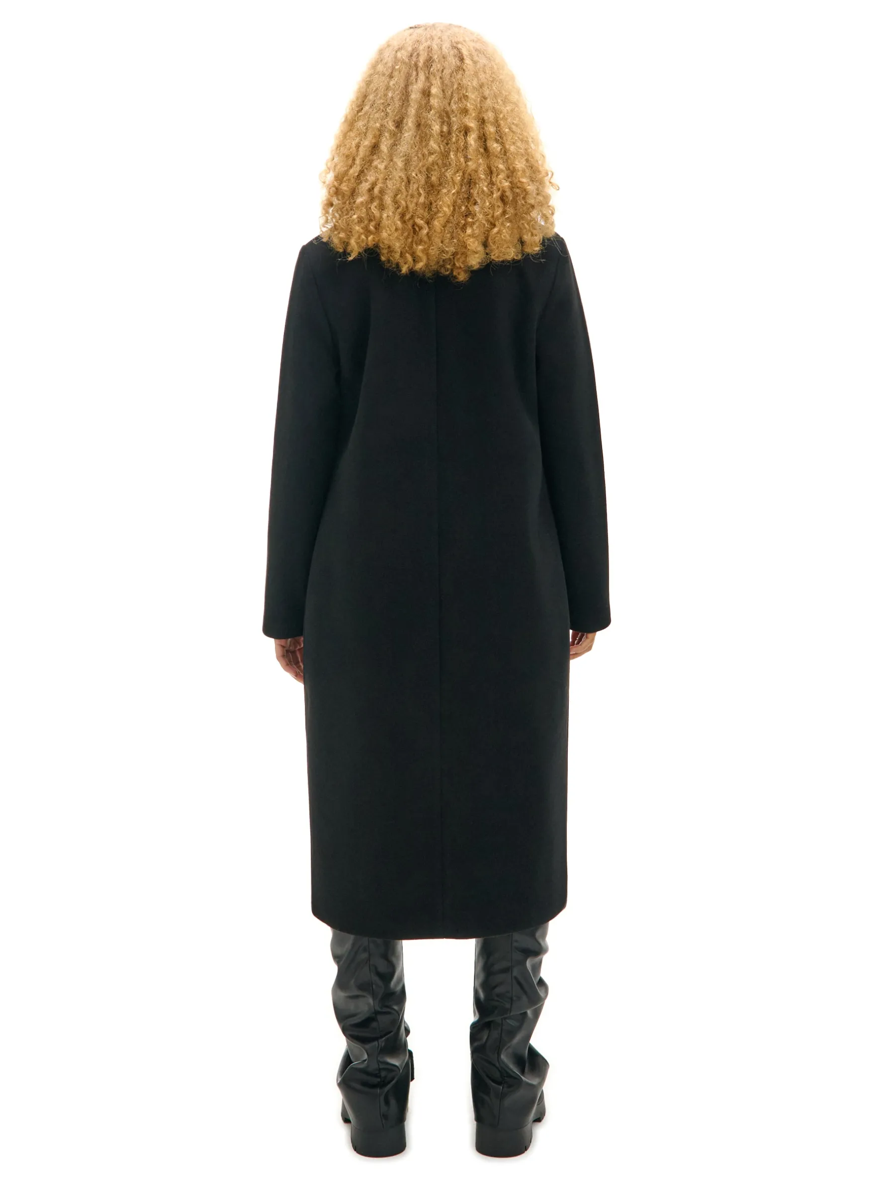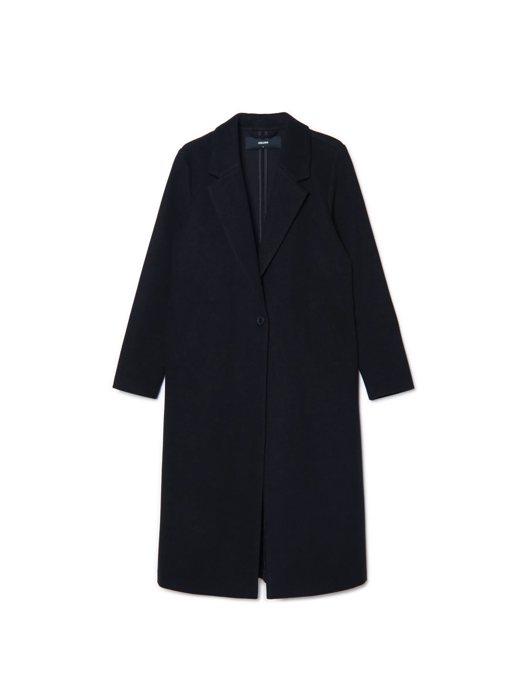 Prosty damski płaszcz, uszyty z gładkiej dzianiny w czarnym kolorze. regularny krój zapięcie na guzik lamowane szwy wewnątrz wykładany kołnierz dwie kieszenie po bokach