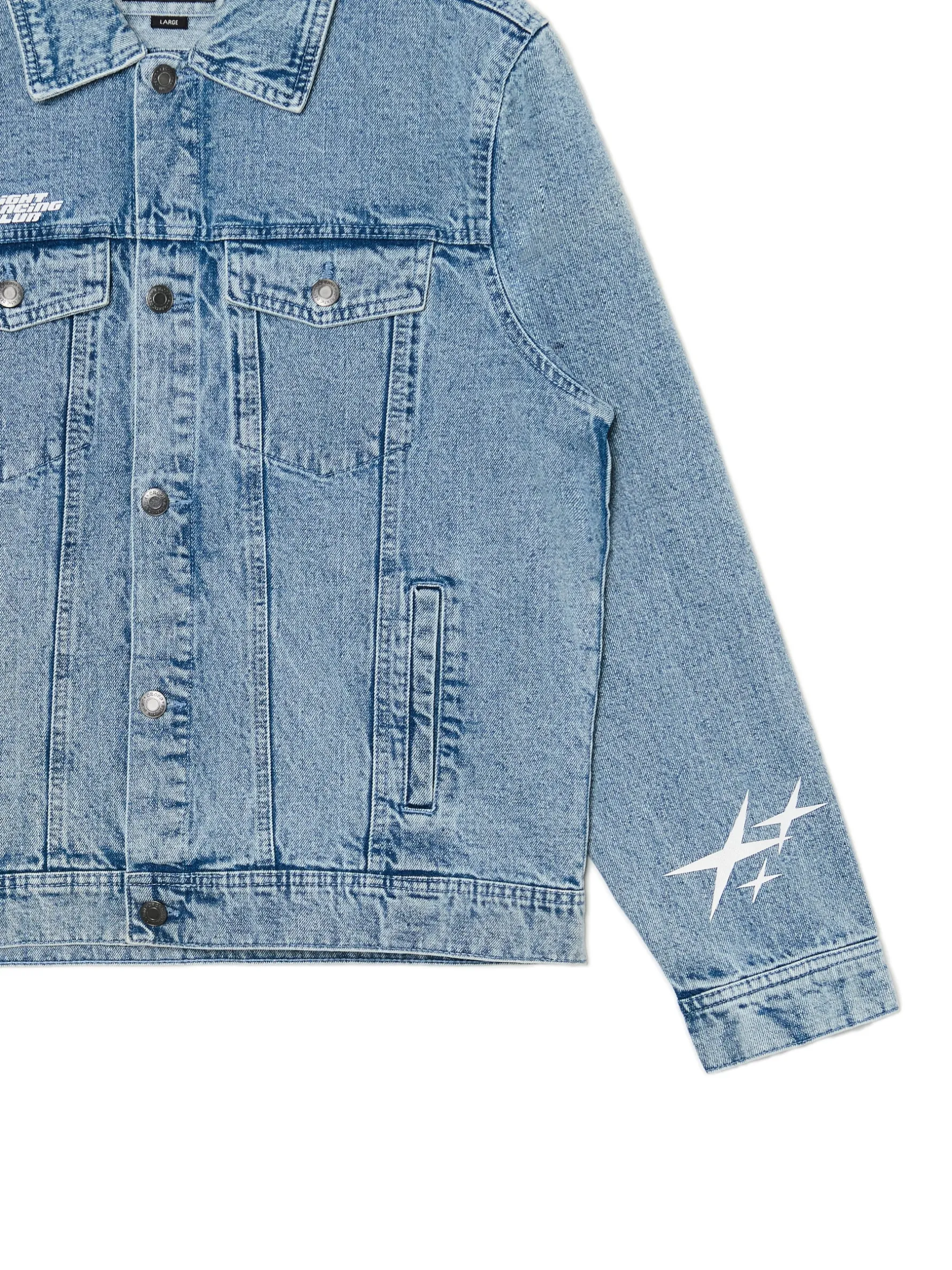 Męska jeansowa kurtka w klasycznym odcieniu denimu i oryginalnymi nadrukami szuka właściciela. uszyta w 100% z bawełny swobodny krój kurtka i mankiety zapinane na guziki 4 kieszenie – para z przodu zapinana na guziki i druga po bokach asymetryczne nadruki z przodu, na plecach i rękawach