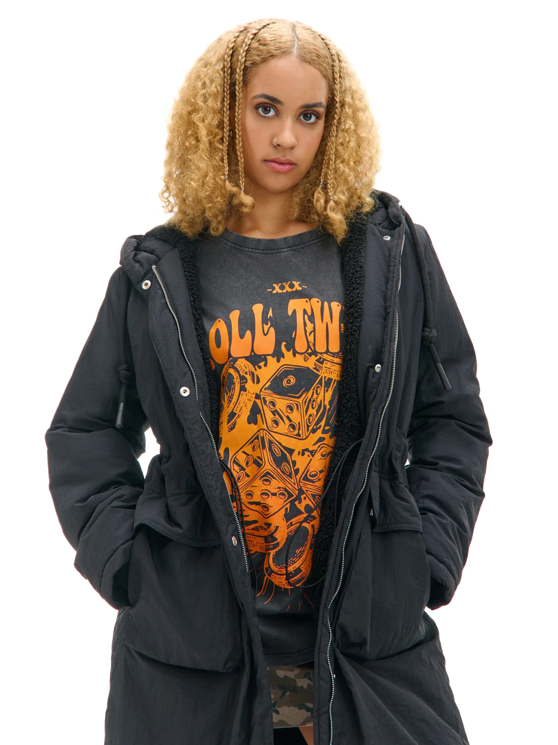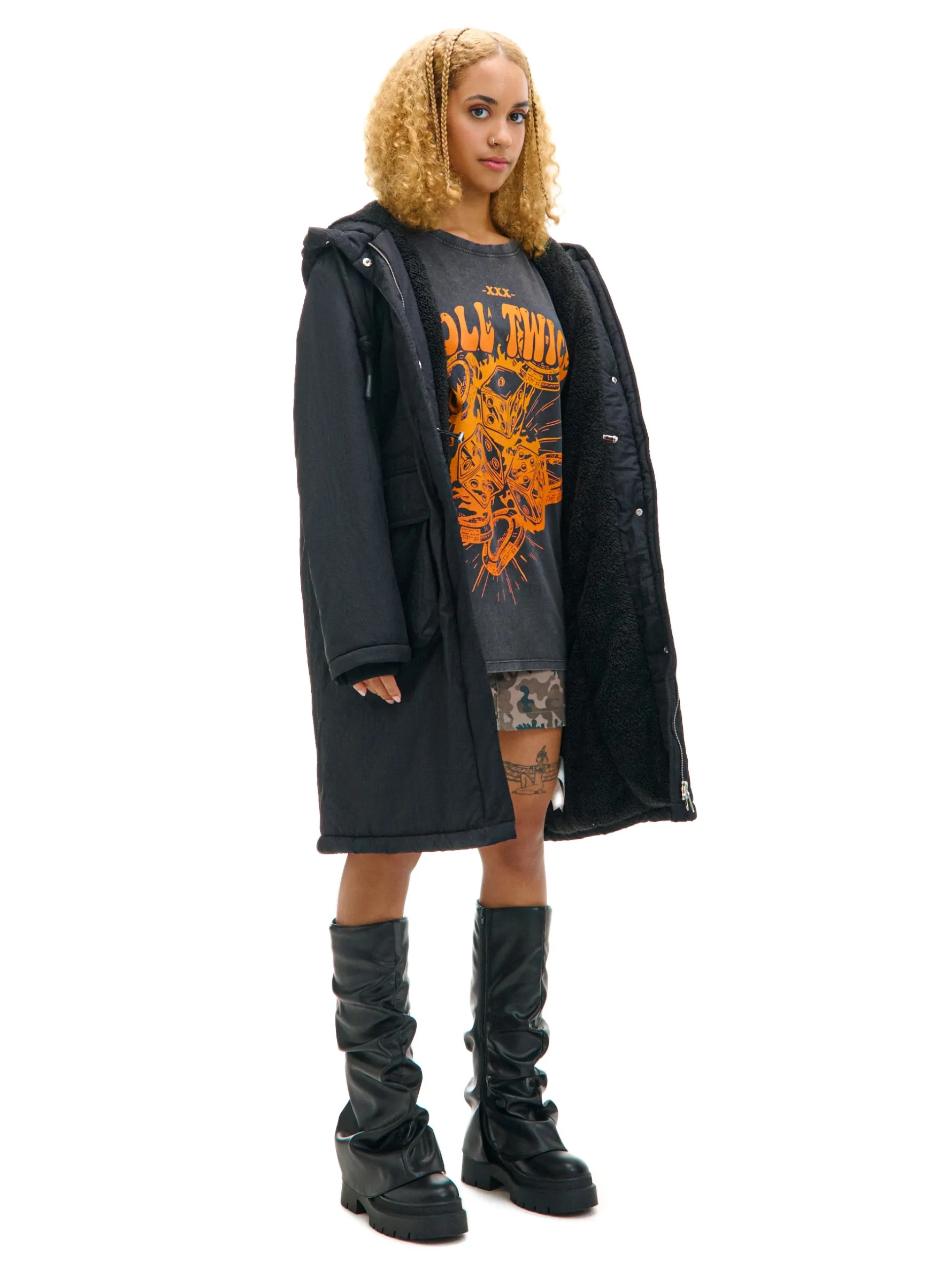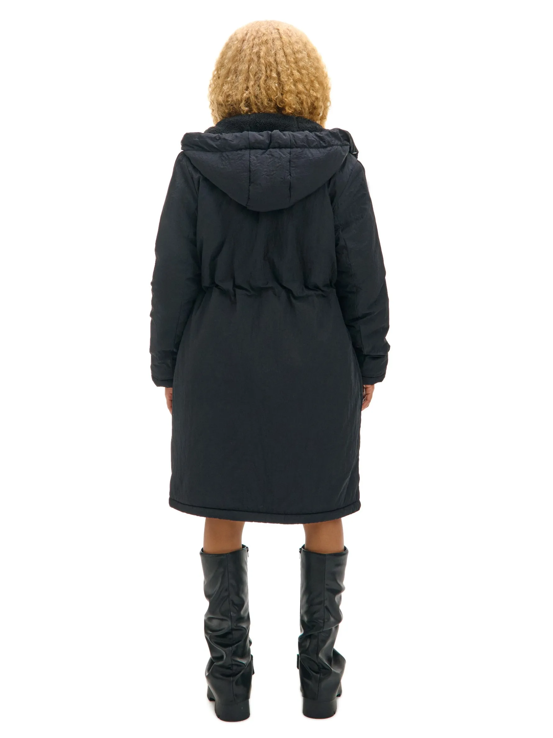 Płaszcz, który otula w środku i genialnie wygląda na zewnątrz, czyli model damskiej parki wykończonej na podszyciu ze sztucznego baranka. Wyposażona w podwójne kieszenie boczne i inne ciekawe rozwiązania, które warto odkryć. przejściowy płaszcz typu parka regularny krój miękka podszewka ze sztucznego baranka zapięcie na podwójny zamek listwa kryjąca z zapięciem na zatrzaski kaptur regulowany sznurkiem 5 kieszeni, w tym kieszenie cargo ściągacz tunelowy ze stoperami w talii