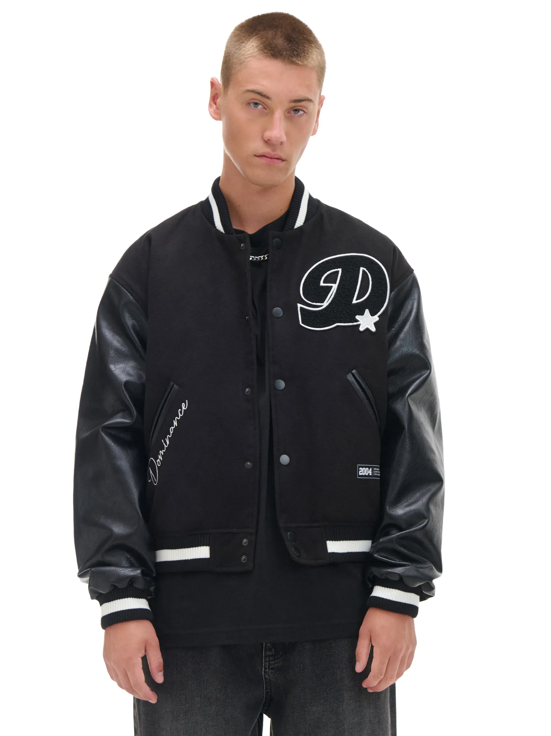 Męska kurtka typu bomber, uszyta z mieszanki dzianin w czarnym kolorze. Na uwagę zasługuje filcowy korpus, rękawy ze skóry ekologicznej, pikowana podszewka i ten oryginalny nadruk na plecach. Sztosowy item! przyjemna w dotyku, ekologiczna dzianina fason college wewnątrz pikowana podszewka zapięcie na zatrzaski na całej długości dekolt w kształcie litery V długie rękawy wykończone elastycznym ściągaczem dwie kieszenie z przodu wewnętrzna kieszeń zapinana na rzep kontrastowe wykończenie lamówką autorskie hafty na całości oryginalny print Wzrost modela: 185 cm PROTECTION LEVEL 2rn Kurtka uszyta z tkaniny z lekkim wypełnieniem, której właściwości zapewnią Ci ochronę przed wiatrem i deszczem. Doskonale sprawdzi się w sezonie przejściowym.