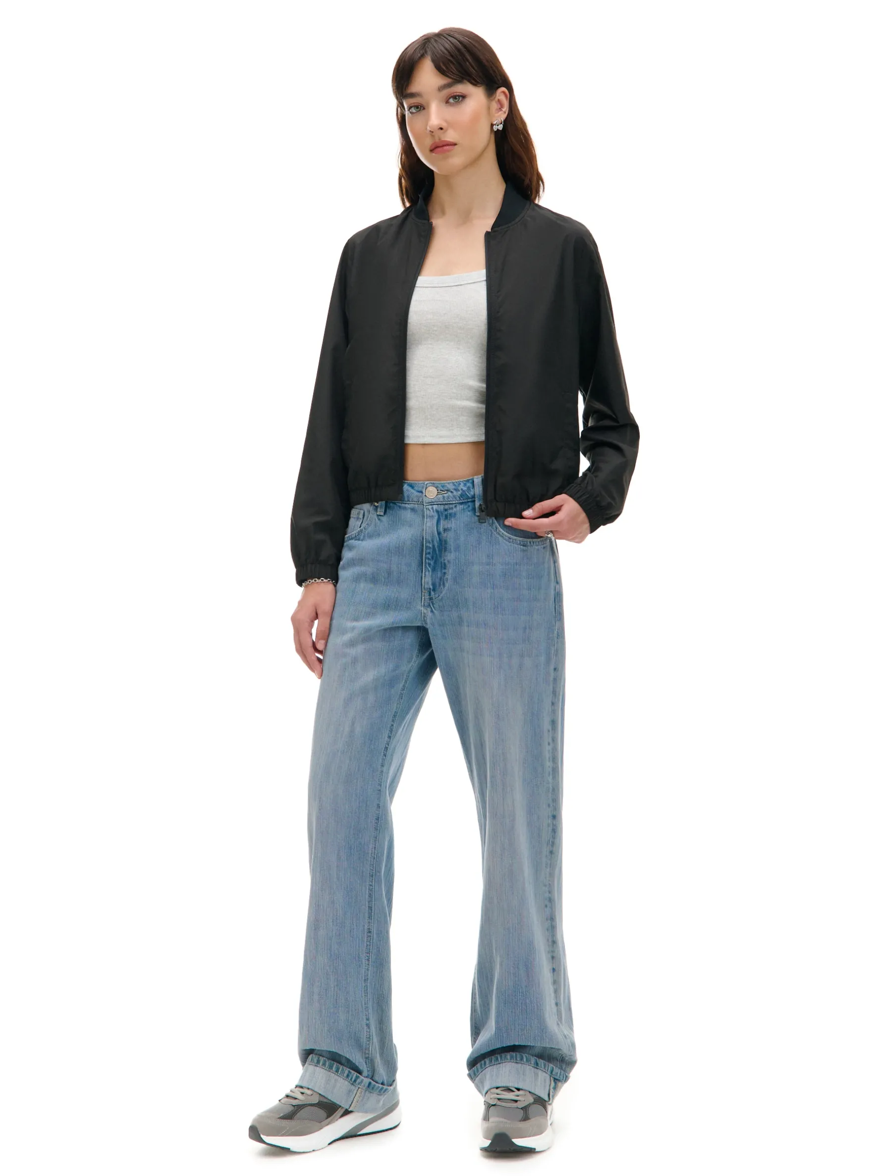 Damska czarna kurtka o kroju bomber, uszyta z lekkiej, gładkiej tkaniny. Idealna do outfitów all black. klasyczny, regularny krój długie rękawy i dolny brzeg zakończone elastyczną gumką zapięcie na suwak dwie kieszenie dostępna w innych kolorach