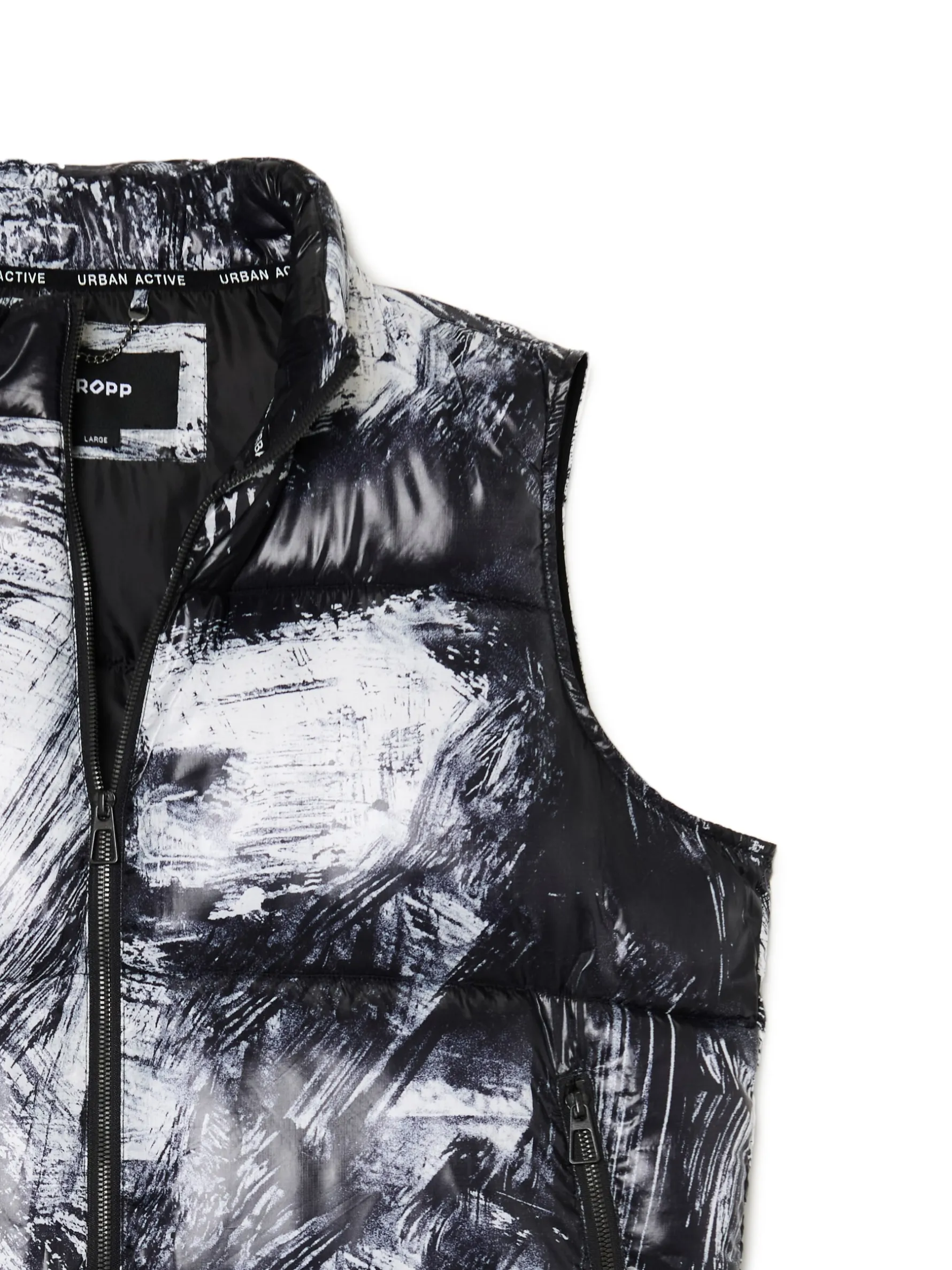 Kamizelka męska na sezon przejściowy, uszyta z pikowanej tkaniny. Na całości efektowny nadruk w odcieniach szarości. pikowanie na całości zapinana na zamek na całej długości regulacja dołu za pomocą gumki ze ściągaczem dwie kieszenie z zamkami po bokach wewnątrz kieszeń zapinana na rzep oryginalny print Wzrost modela: 185 cm PROTECTION LEVEL 3 Kamizelka uszyta z tkaniny z większym ociepleniem, której właściwości zapewnią Ci nie tylko ochronę przed wiatrem i deszczem, ale też niskimi temperaturami.