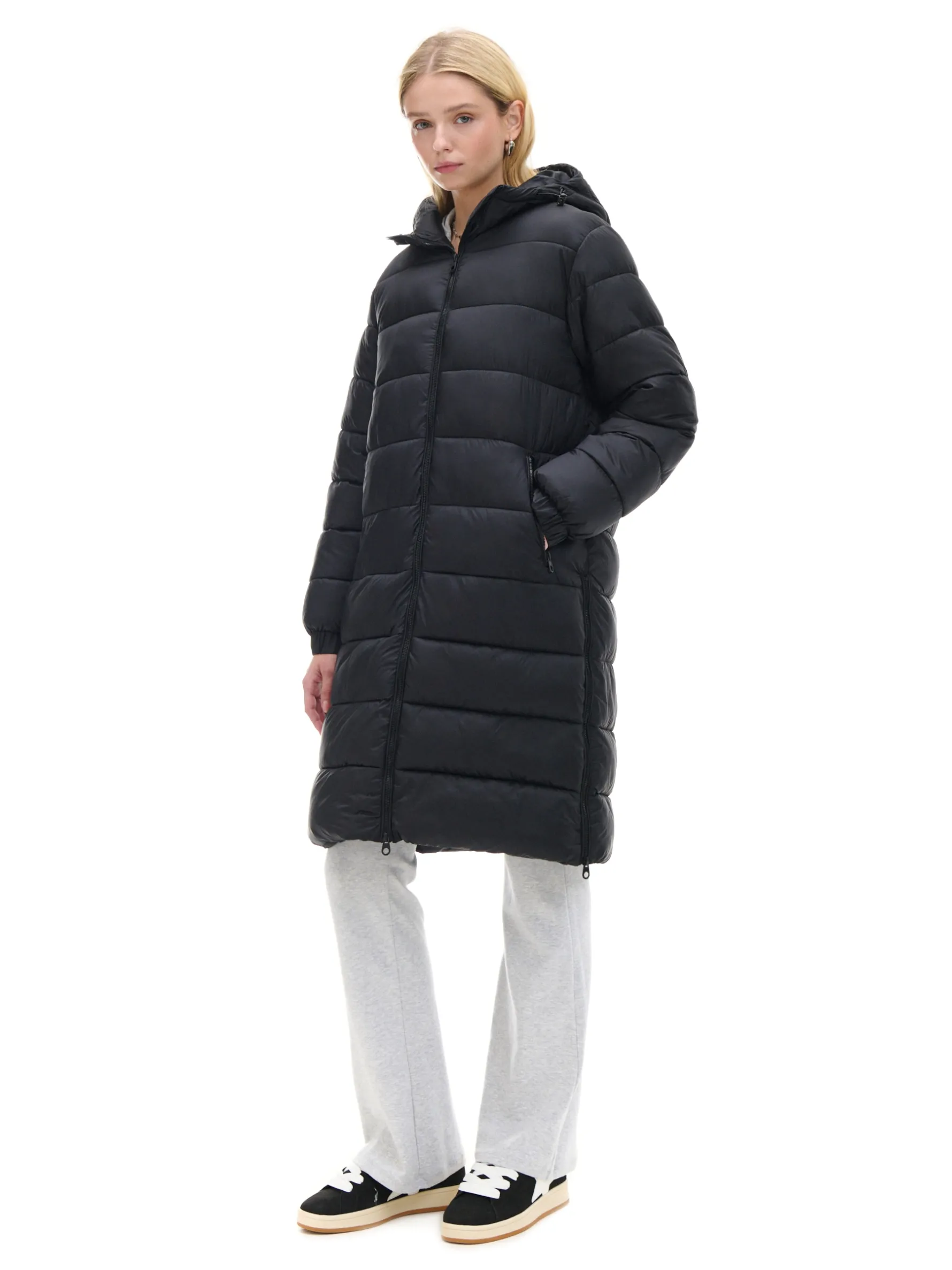 Długi pikowany damski płaszcz uszyty z ciepłej tkaniny. Idealny na sezon przejściowy. Dobierz swój kolor na jesień i klik do koszyka. długi pikowany płaszcz typu puffer regularny krój zapięcie na podwójny zamek wewnątrz podszewka z ociepleniem praktyczny kaptur ze stójką, regulowany gumką ze stoperami długie rękawy z gumką przy mankietach kieszenie boczne z zamkami dodatkowe zamki na dole