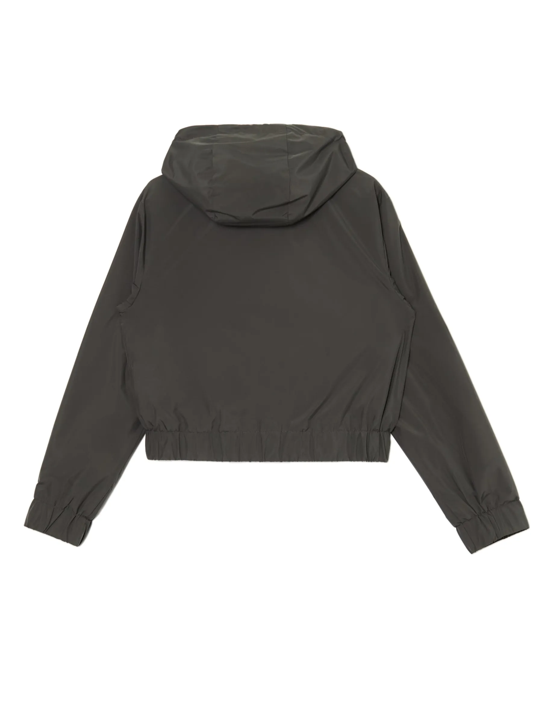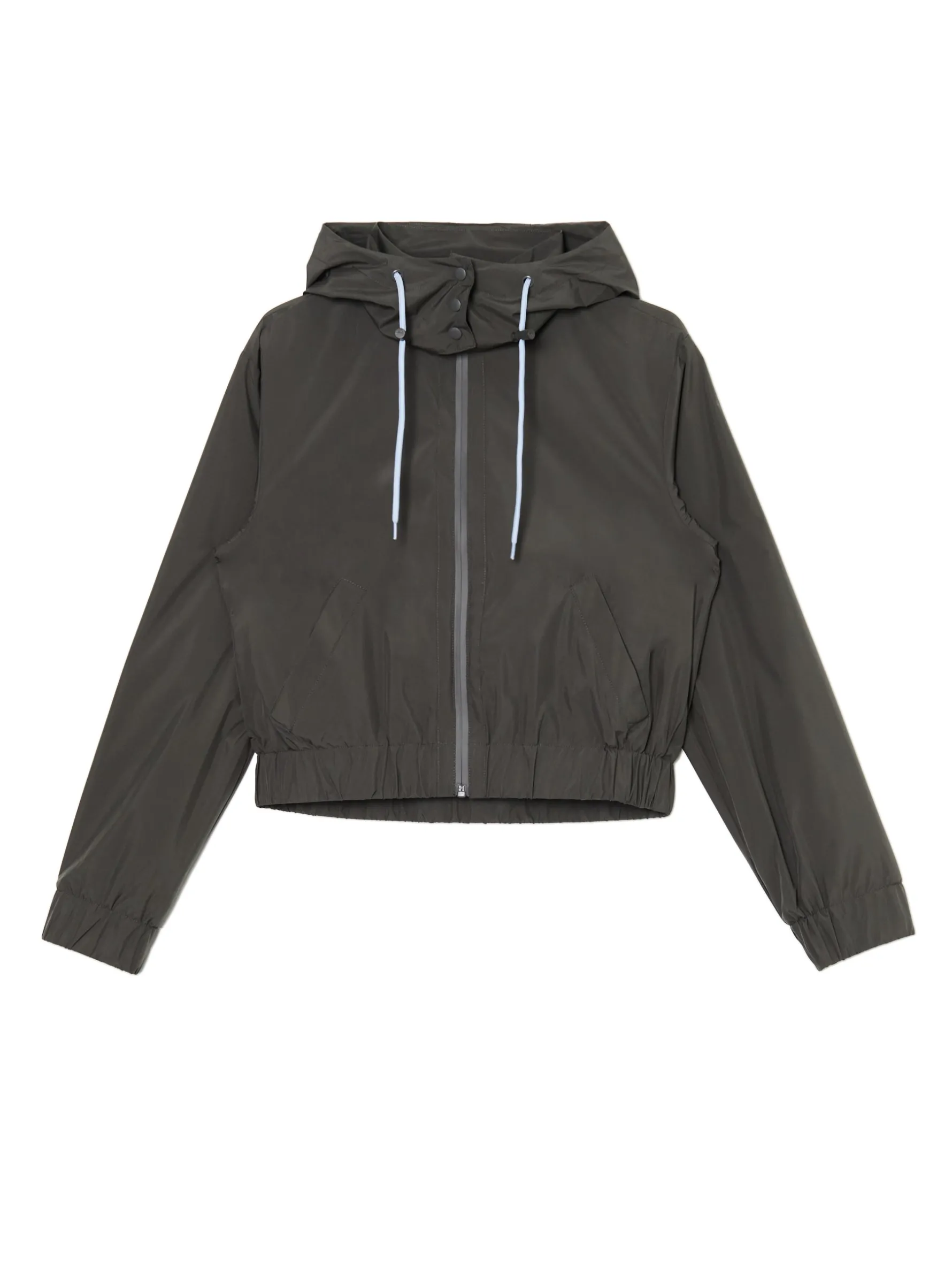 Damska kurtka, uszyta z gładkiej, lekkiej tkaniny w stonowanym szarym kolorze. regularny krój z przodu zapięcie na suwak kaptur regulowany sznurkami ze stoperami klapy kaptura zapinane na zatrzaski dolny brzeg i rękawy zakończone wszytą elastyczną gumką dwie kieszenie