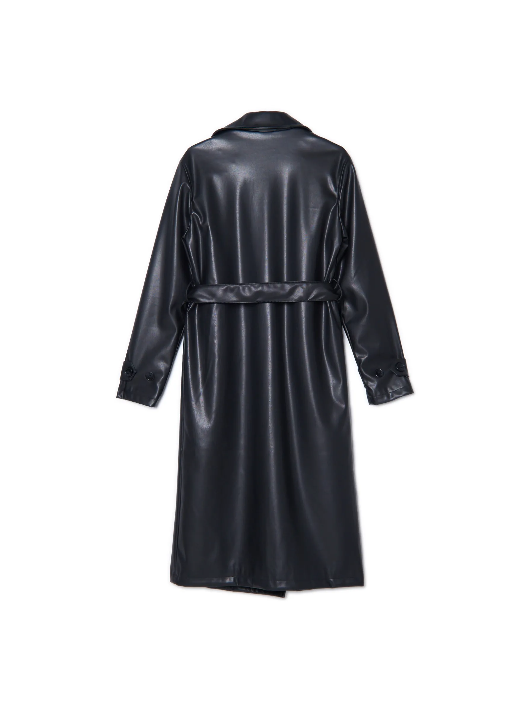 Dwurzędowy damski płaszcz, uszyty ze sztucznej skóry. zapięcie na guziki, w pasie wiązanie na pasek wykładane klapy kołnierza rękawy zakończone regulacją przy mankiecie dwie boczne kieszenie Wzrost modelki: 177 cm