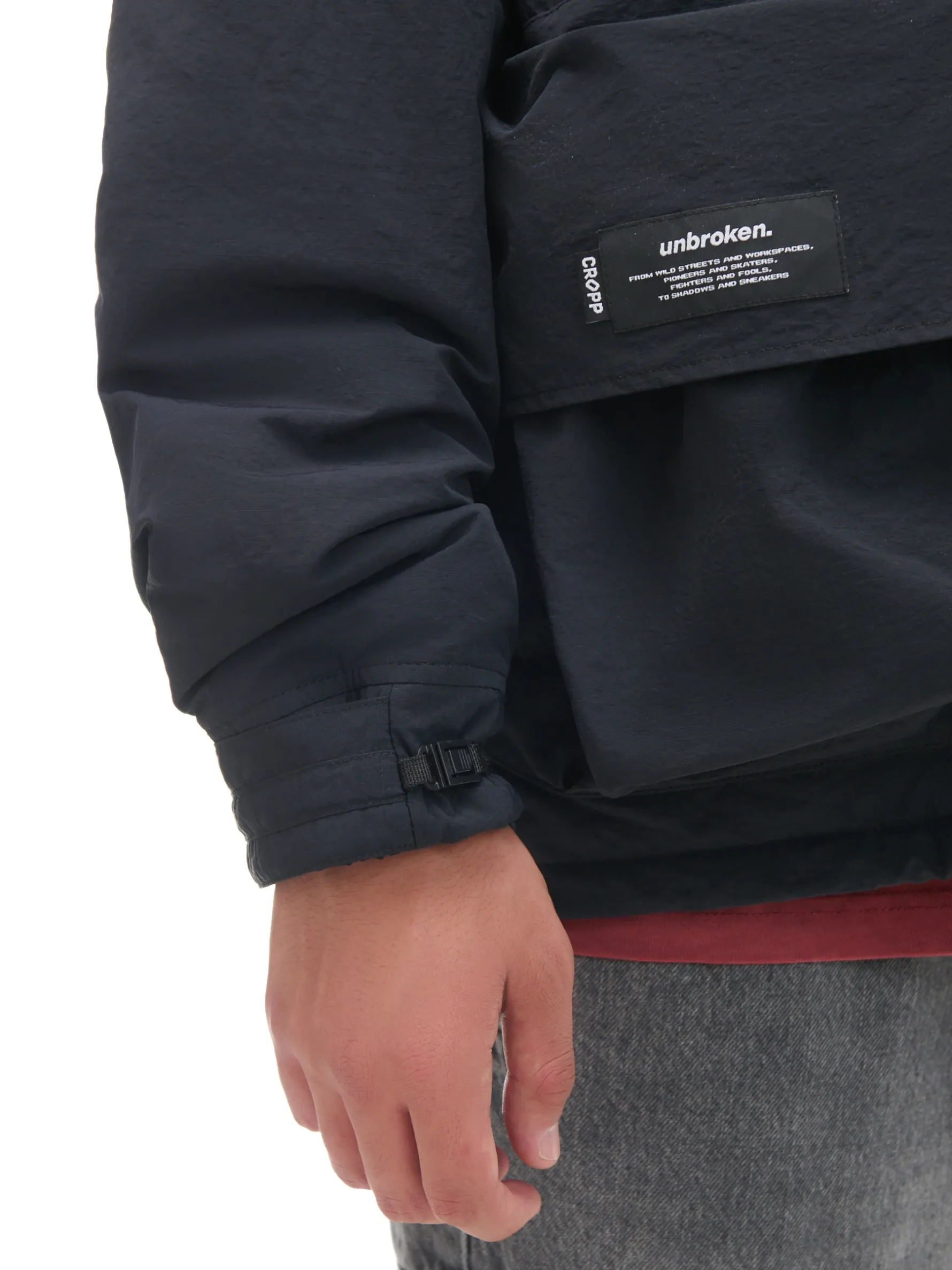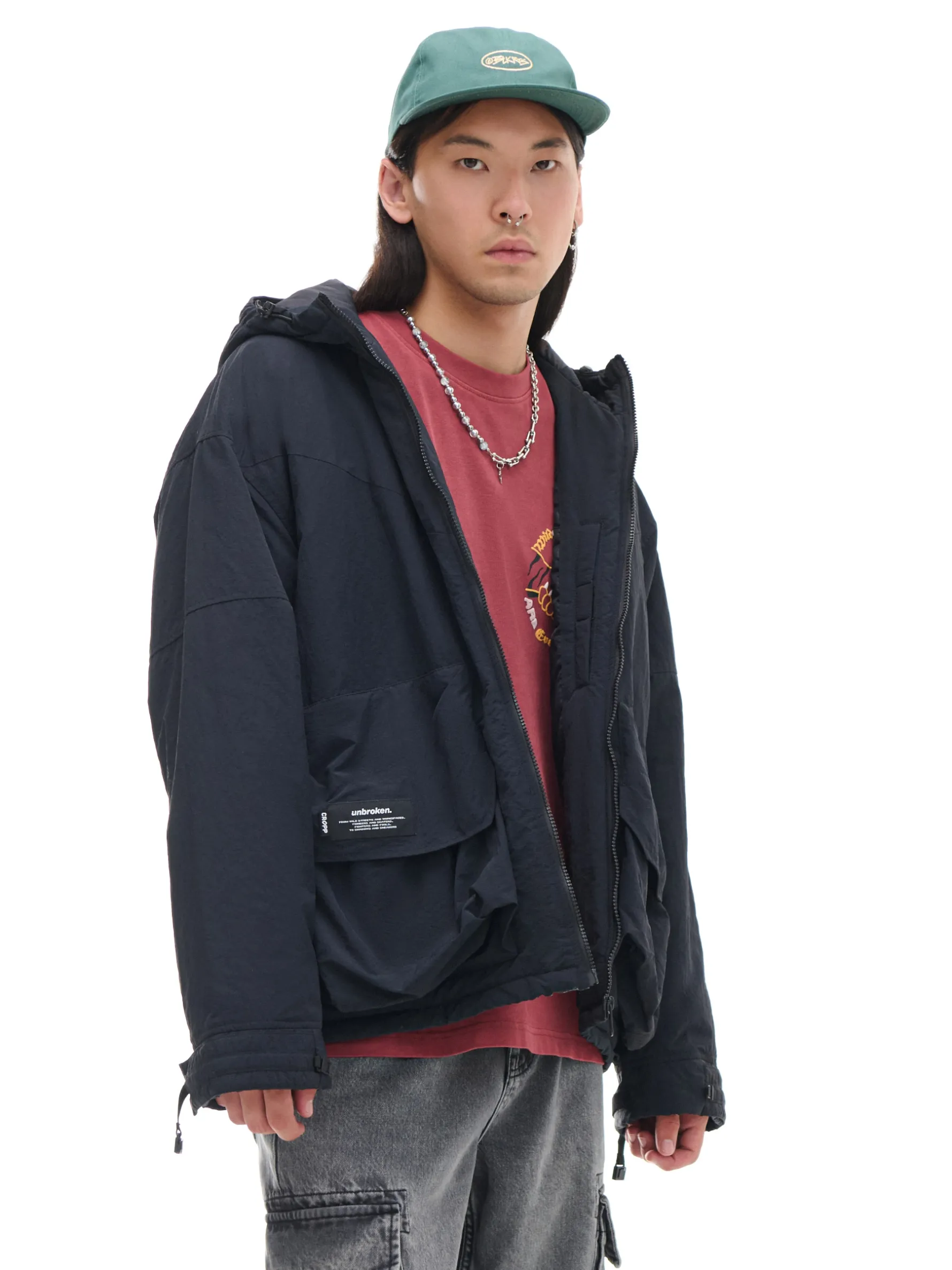 Solidna męska kurtka z kapturem wykonana z marszczonego poliamidu w kolorze czarnym. Posiada liczne kieszenie zewnętrzne i wewnętrzne. Podszyta ciepłą podszewką, ochroni Cię przed wiatrem. lekko ocieplana z podszewką regularny krój zapinana na zamek na całej długości długie rękawy z regulowanymi mankietami kaptur z regulacją szerokości za pomocą gumek ze stoperem dwie naszywane kieszenie z patkami dodatkowa kieszeń zewnętrzna z zapięciem na zamek wewnątrz kieszonka na dokumenty lub telefon ozdobna naszywka na kieszeni PROTECTION LEVEL 3rn Kurtka uszyta z tkaniny z większym ociepleniem, której właściwości zapewnią Ci nie tylko ochronę przed wiatrem i deszczem, ale też niskimi temperaturami.