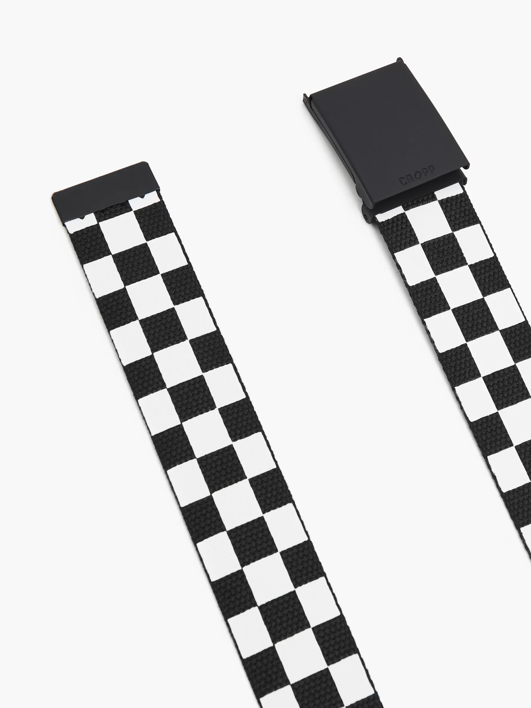 Męski materiałowy pasek do spodni, wykonany z syntetycznej tkaniny. Jedna strona – czarna, druga – ozdobiona biało-czarną kratką. Wymiary produktu 125 x 4 cm