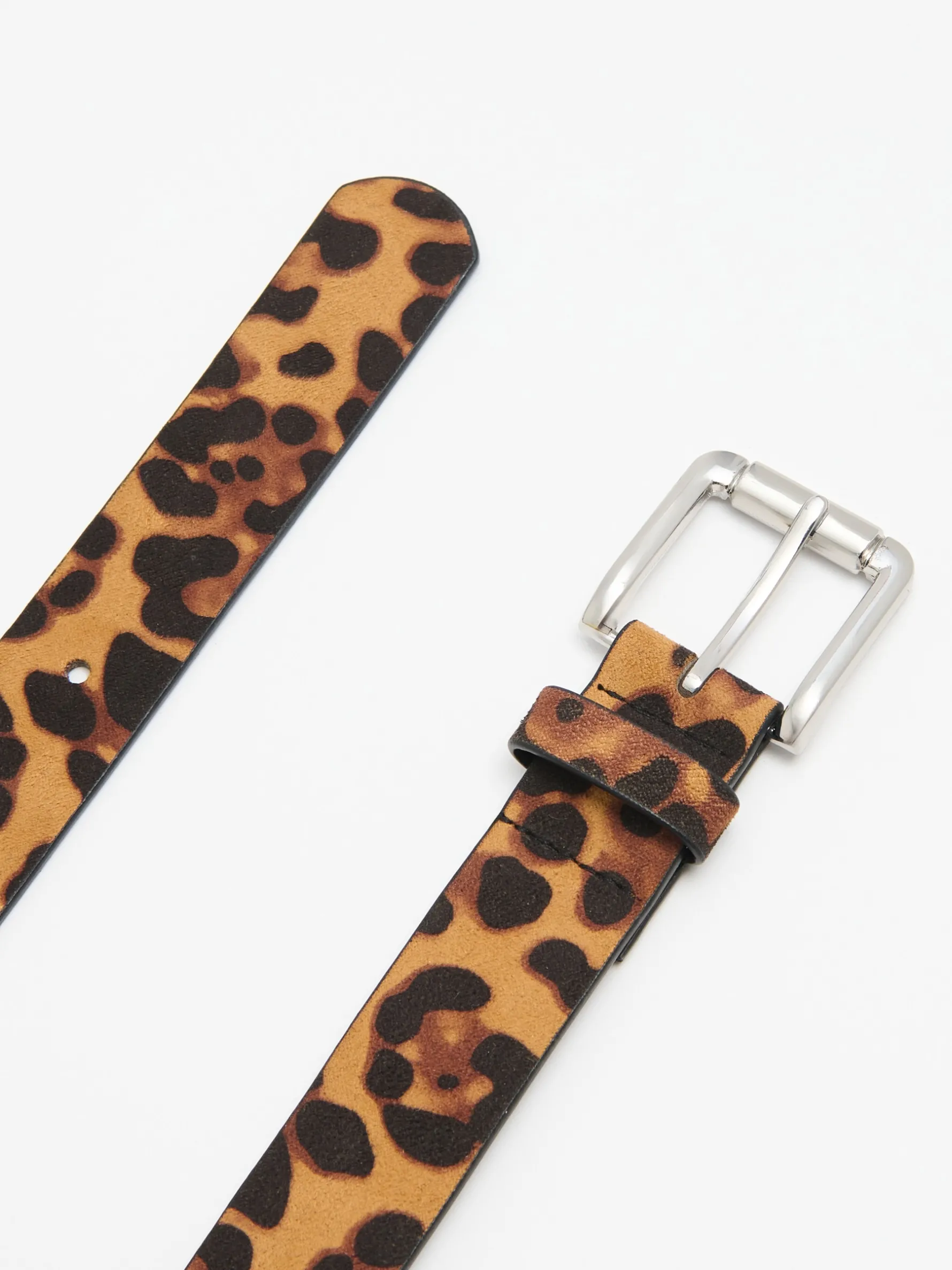 Damski pasek do spodni z klamrą ułatwiającą regulację. Wykonany z imitacji skóry z modnym wzorem w panterkę. Idealny dodatek do wielu stylizacji. wąski pasek uszyty z materiału imitującego skórę możliwość regulacji szerokości obwodu, dzięki zapięciu z przodu dekoracyjna klamra zwierzęcy wzór dodatkowe szlufki