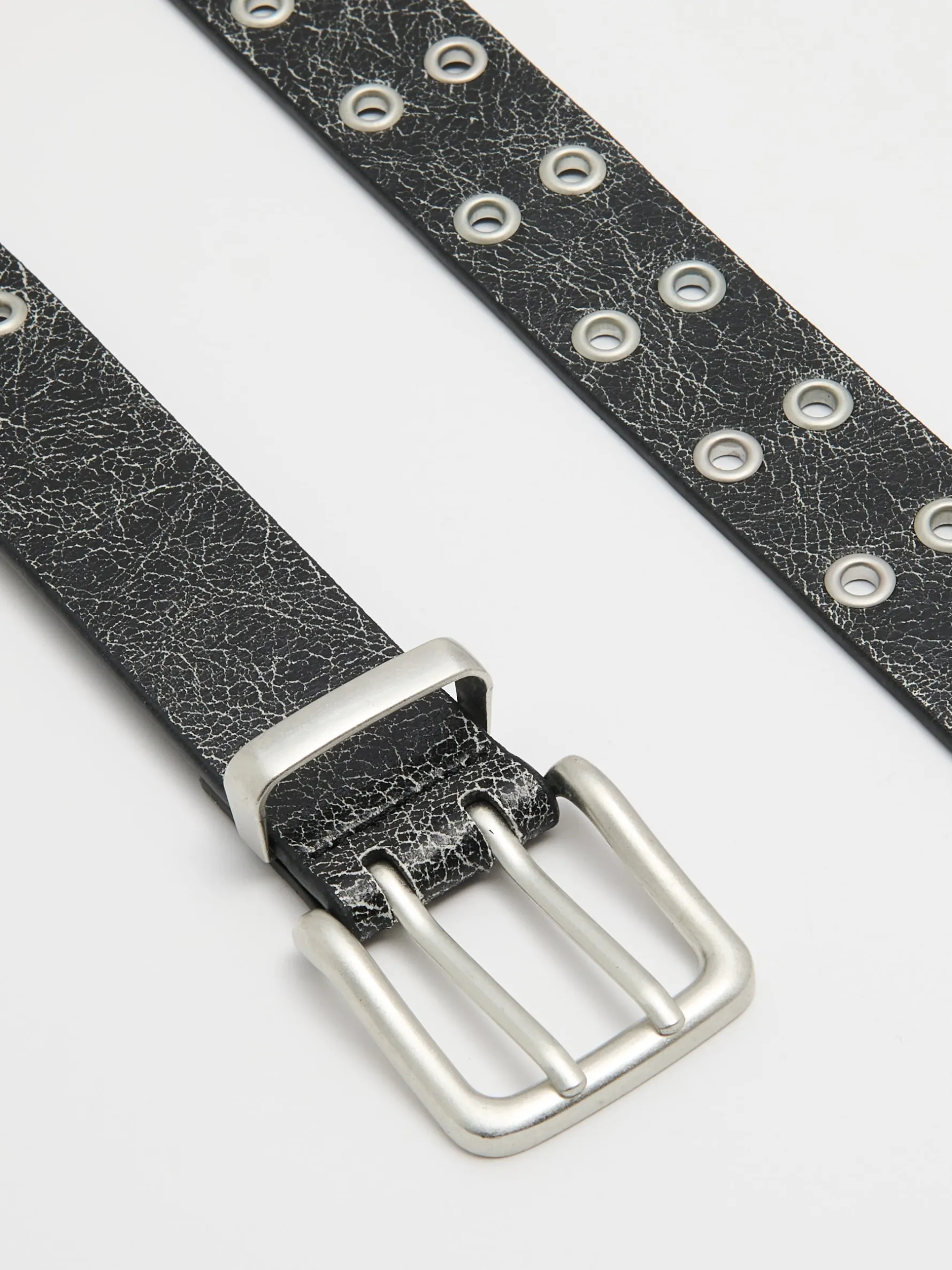 Damski pasek uszyty z materiału ze sztucznej skóry z efektem pęknięć. Klamra, przelotki i dodatkowa szlufka w srebrnym kolorze nadają im wyjątkowego vibe’u. Idealny dodatek do jeansów i materiałowych spodni. Długość paska: S/M 75cm Długość paska: M/L 85cm
