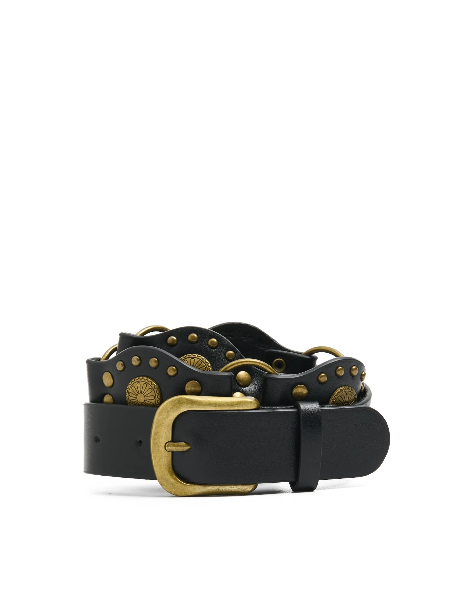 Damski pasek wykonany z imitacji skóry w kolorze czarnym. Na całości dekoracyjne elementy w kolorze starego złota. Sztosowy dodatek do spodni, spódnic, czy sukienek!