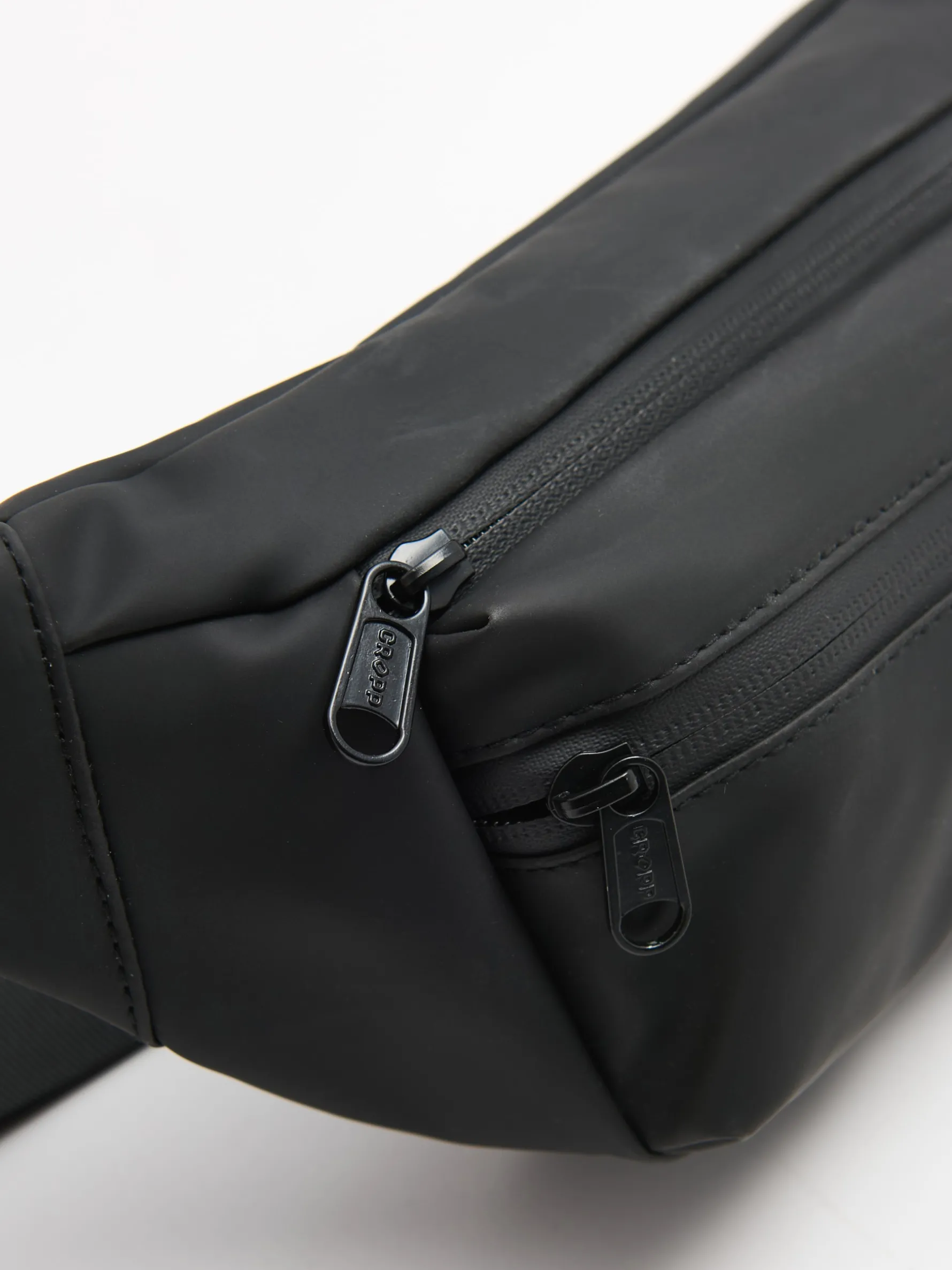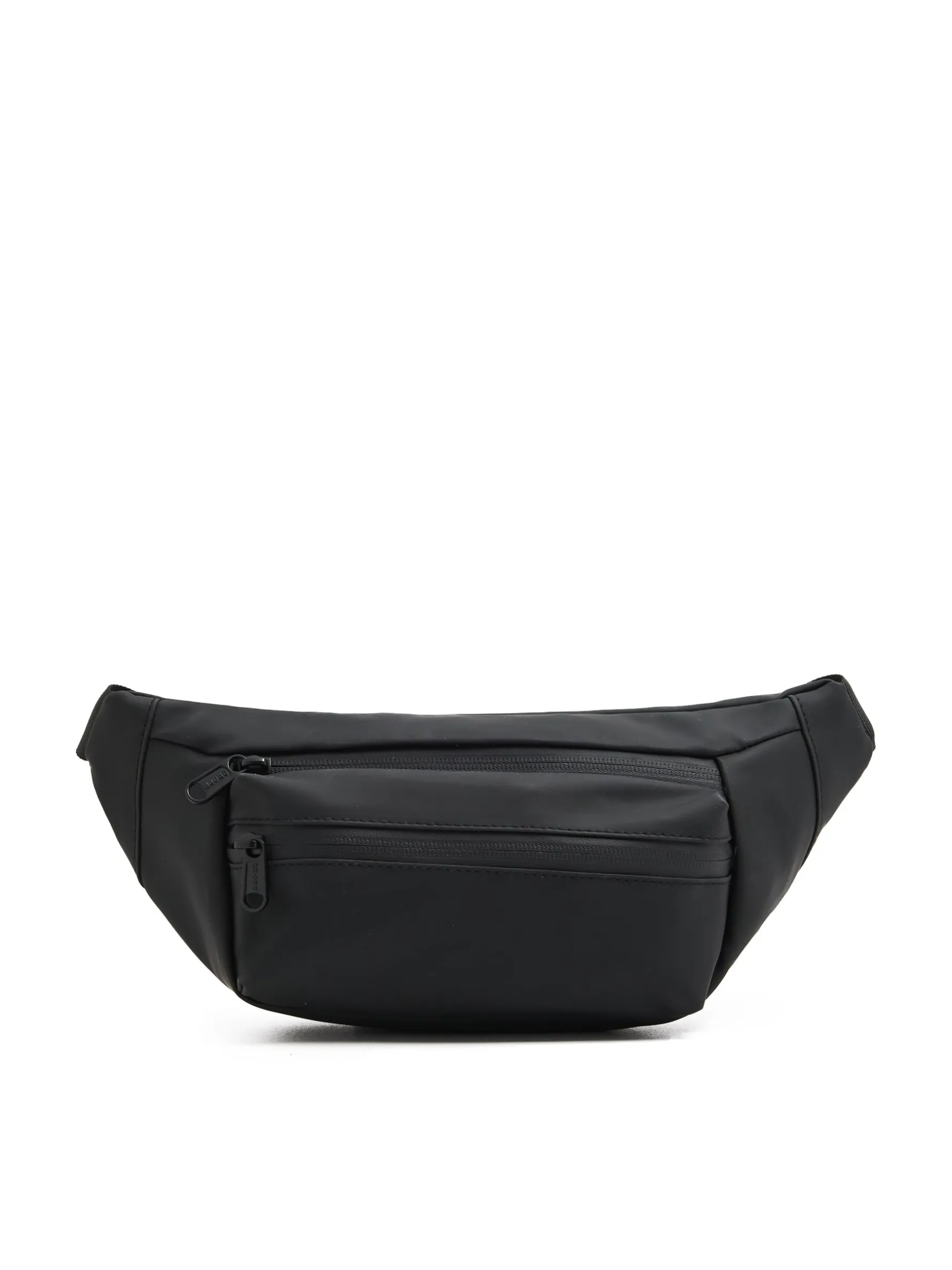 Męska saszetka typu basic, uszyta z gładkiego czarnego tworzywa. Idealny dodatek do basicowych stylizacji. regulowany pasek z klamrą zatrzaskową główna komora i kieszeń z przodu zapinane na suwaki Wymiary produktu: 14 x 30 x 3 cm