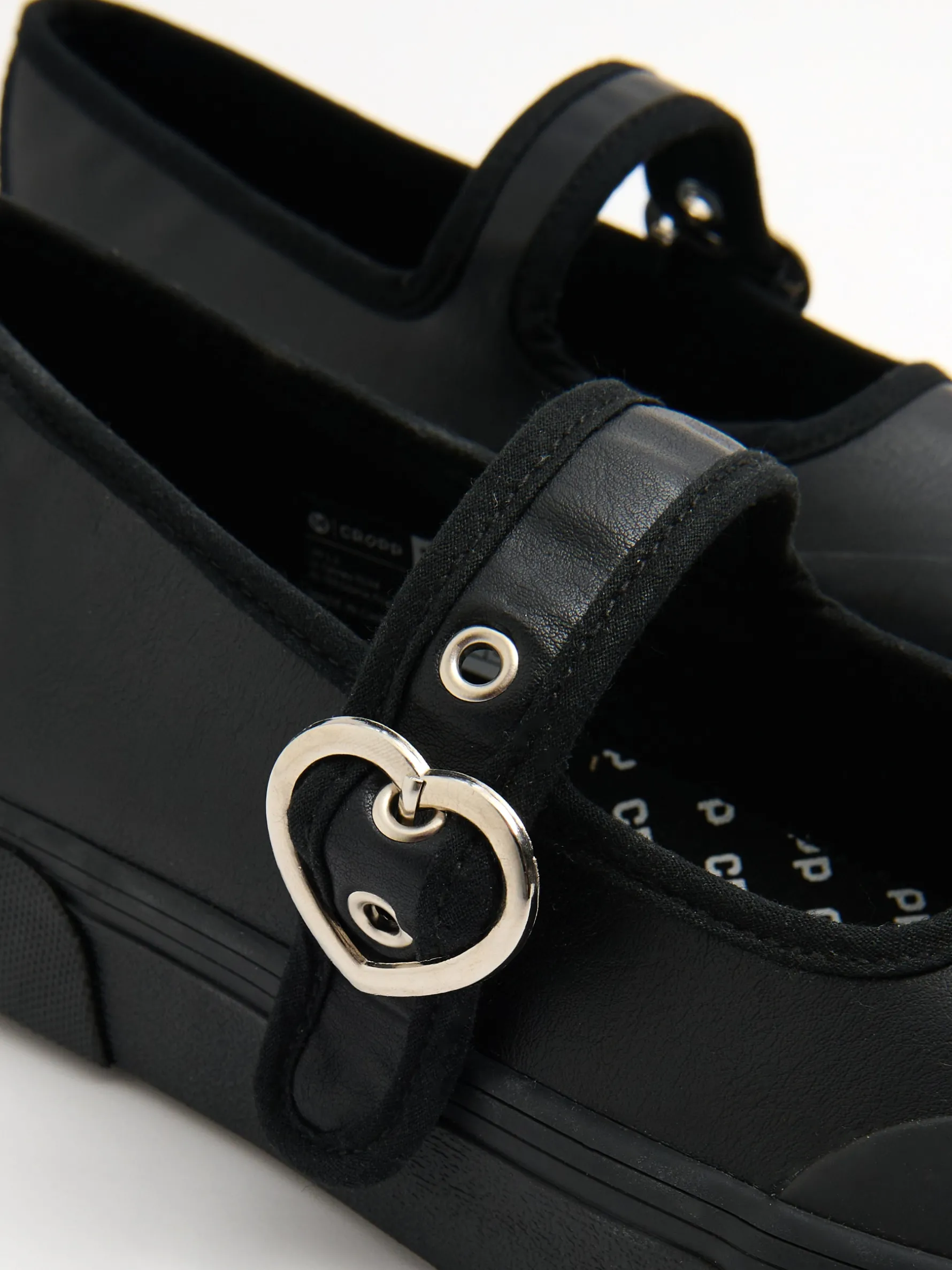 Przejściowe damskie półbuty Mary Jane w kolorze czarnym, wykonane z łączonych materiałów. Zapięcie z ozdobną klamrą w kształcie serca zwraca na siebie uwagę! przejściowe sneakersy z łączonych materiałów płaska gumowa podeszwa regulowany pasek, zapinany klamrą metalowe detale