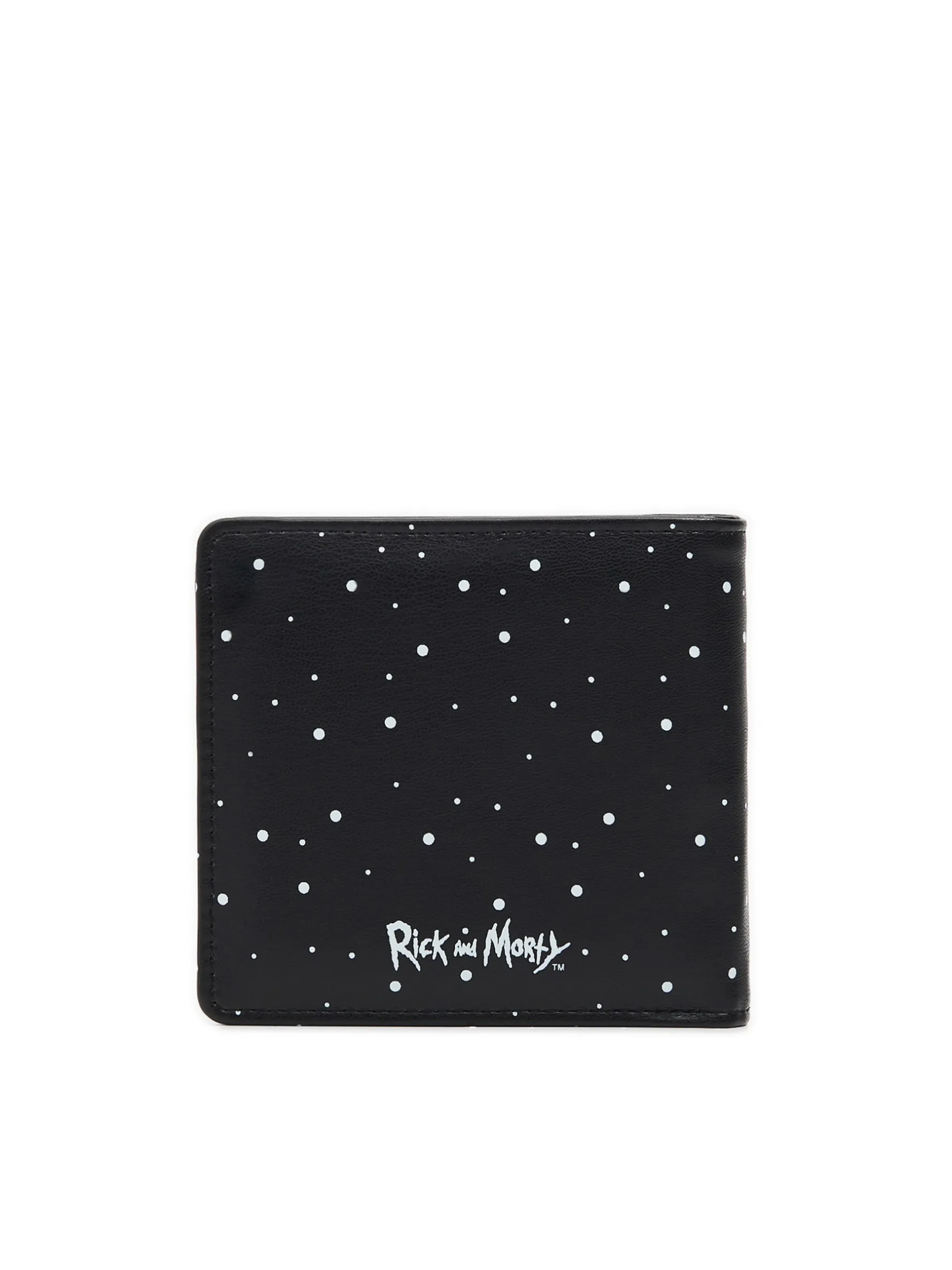 Męski czarny portfel, wykonany z imitacji skóry. kieszonka na monety zapinana na suwak przegródki na bankonty i dokumenty nadruk z serialu Rick and Morty Wymiary produktu: 10,5 x 12 cm RICK AND MORTY © CARTOON NETWORK