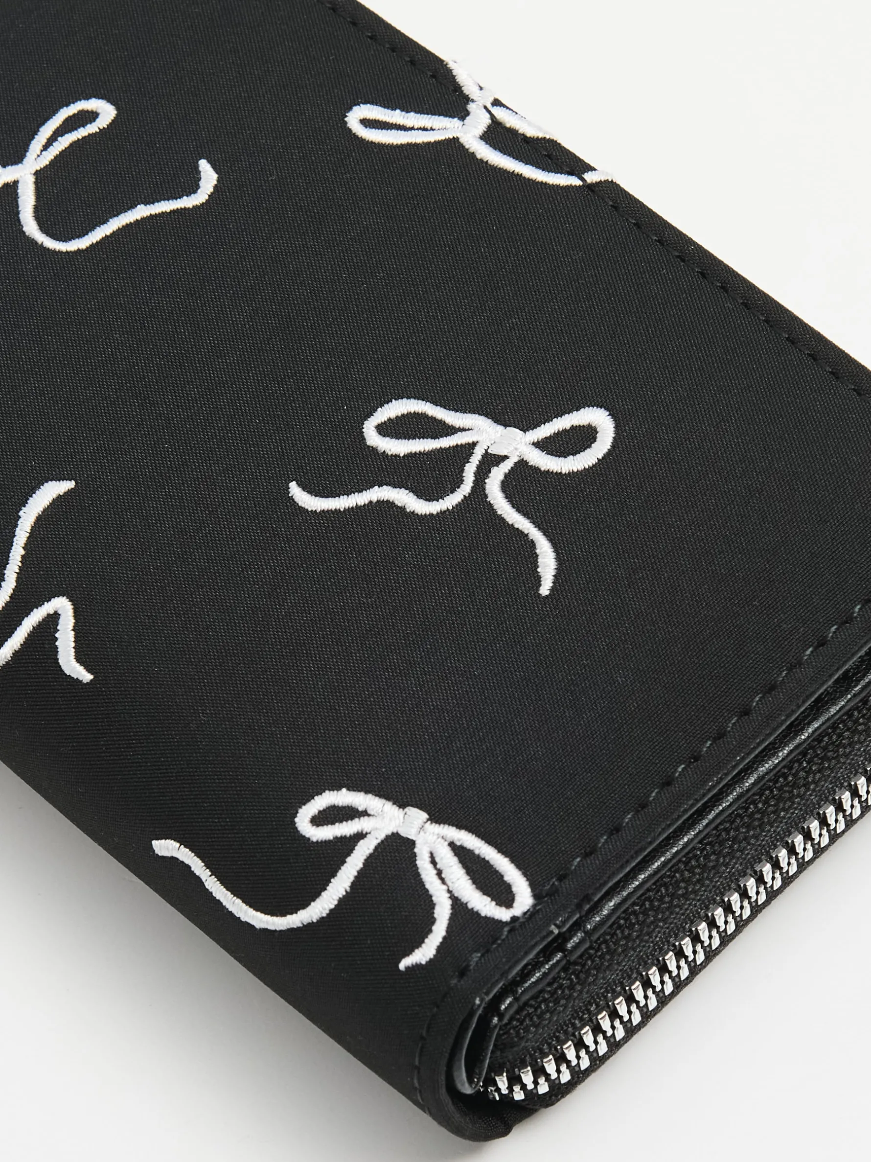 Czarny damski portfel wykonany z trwałej mieszanki materiałów z haftowanymi kokardkami na całej powierzchni. pokryty trwałym nylonem odpornym na warunki atmosferyczne liczne kieszenie zewnętrzne i wewnętrzne kieszeń zewnętrzna z zapięciem na zamek przegródki na karty i banknoty autorskie hafty na całości