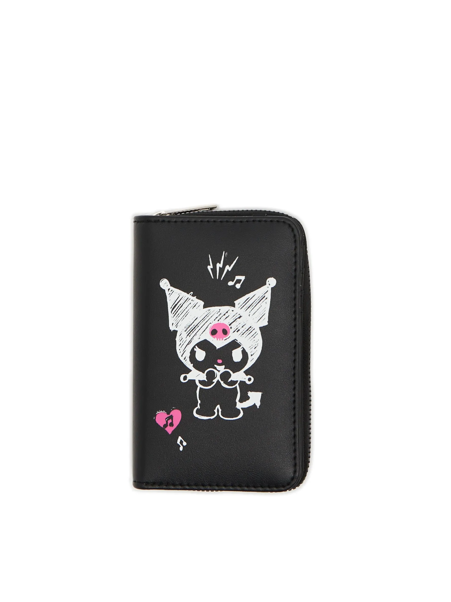 Czarny damski porfel, wykonany z imitacji skóry. zapięcie na zatrzask kieszonka na monety zapinana na suwak przegródki na karty i banknoty nadruk z motywem Kuromi Wymiary produktu: 9,5 x 14 cm © 2024 SANRIO CO., LTD.